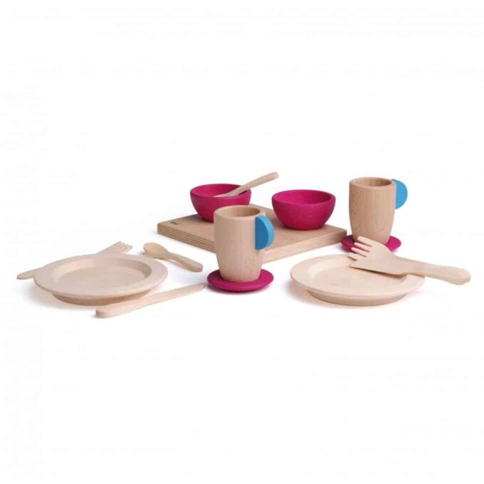 Inhalt – 15 Teile aus Holz – 2 Teller, 1 Schneidbrett, 2 kleine Schlüsseln, 2 Becher mit Untertassen, 2 Bestecksets (Messer, Gabel, Teelöffel)