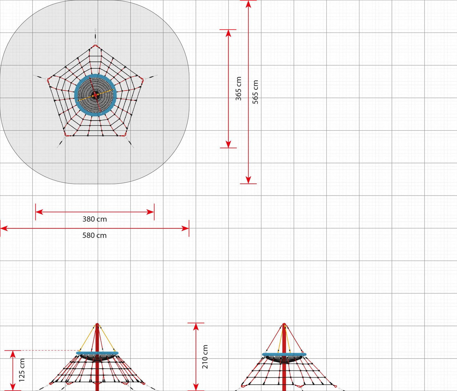 • Platzbedarf inkl. Sicherheitsabstände (LxB): 580 x 565 cm