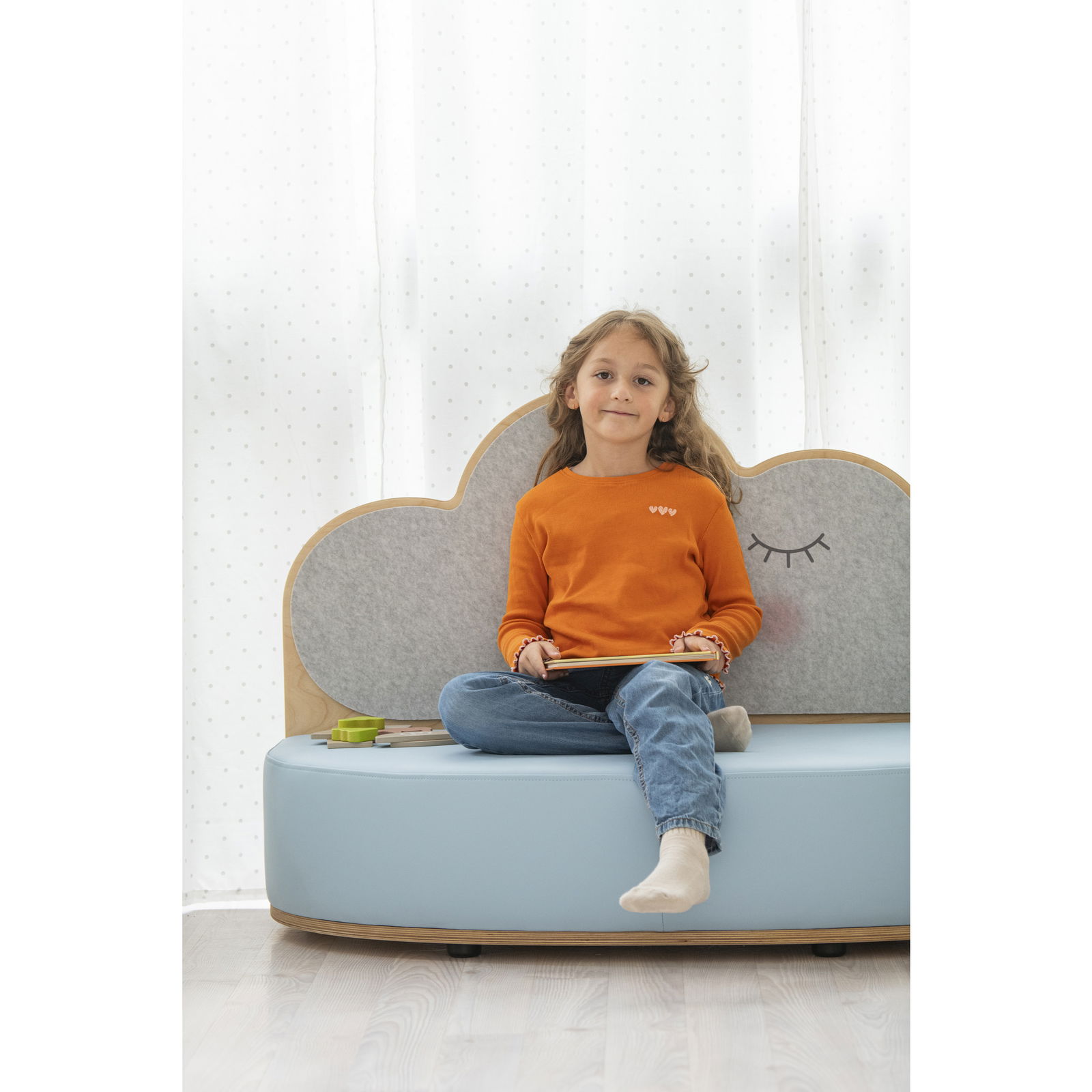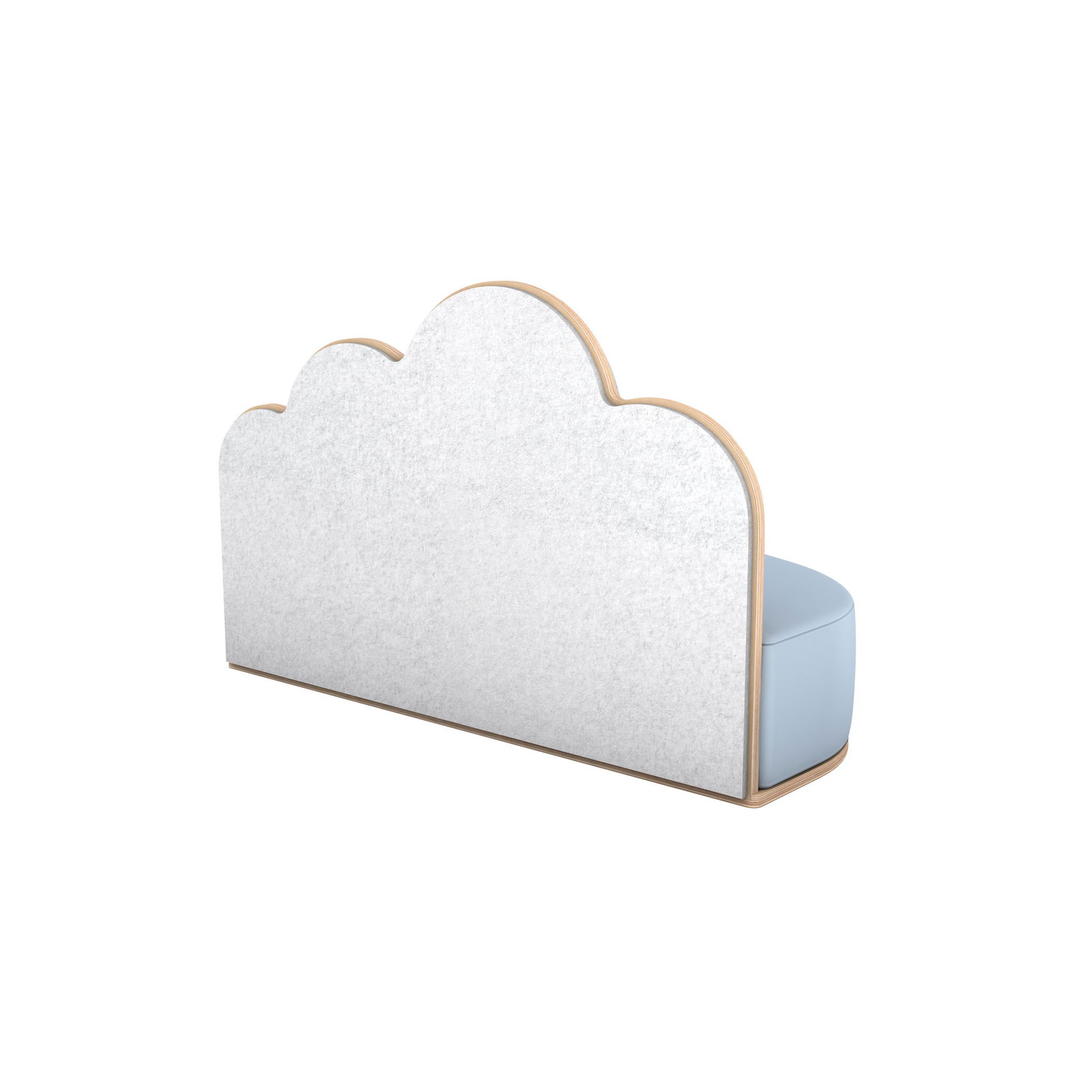 Das Sofa ist mehr als nur eine Sitzgelegenheit. Dank seiner speziellen Konstruktion wirkt es aktiv an der Raumakustik mit. Die Rückwand besteht aus einem schallabsorbierenden Material, das Umgebungsgeräusche dämpft und so eine kleine Insel der Stille schafft. Ob als gemütliche Leseecke, Platz für ruhige Gespräche oder einfach zum Ausruhen nach dem Toben – das „Wolke“-Sofa bietet Kindern Geborgenheit. Die sanften Farben in Blau, Weiß und Naturtönen fügen sich harmonisch in jedes Raumkonzept ein, ohne optisch zu dominieren, und schaffen ein Ambiente, in dem sich Kinder rundum wohlfühlen.