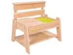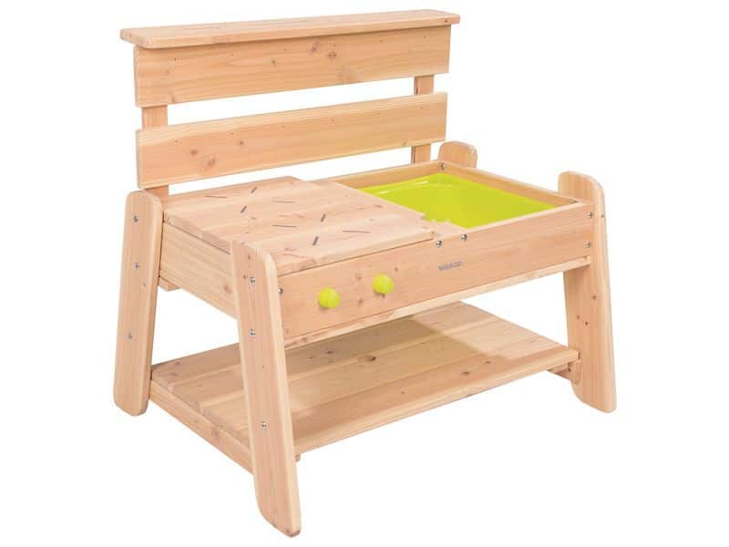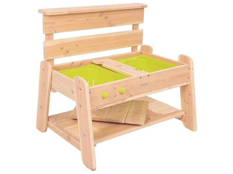 3 in 1, Außenküche, Aktivitäts- und Basteltisch, mit 2 mobilen Deckeln ausgestattet: 1 Abdeckung für 2 Behälter und 1 Kochfeld, das 1 Behälter abdeckt. Was für ein Spaß beim Füllen, Umfüllen, Mischen von Sand, Wasser, Blättern…
