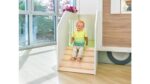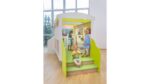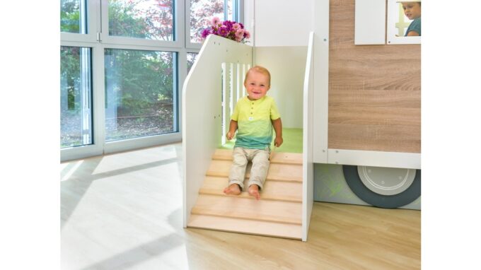 Besonders die Tafeloberfläche am unteren Teil des Bauwagens fördert die kreativen Fähigkeiten der Kinder. Hier können sie malen, kritzeln und ihre künstlerischen Talente entdecken. Über zwei Eingänge – entweder durch die Treppe oder die Rampe – können die Kinder den Bauwagen erkunden und für sich entdecken.