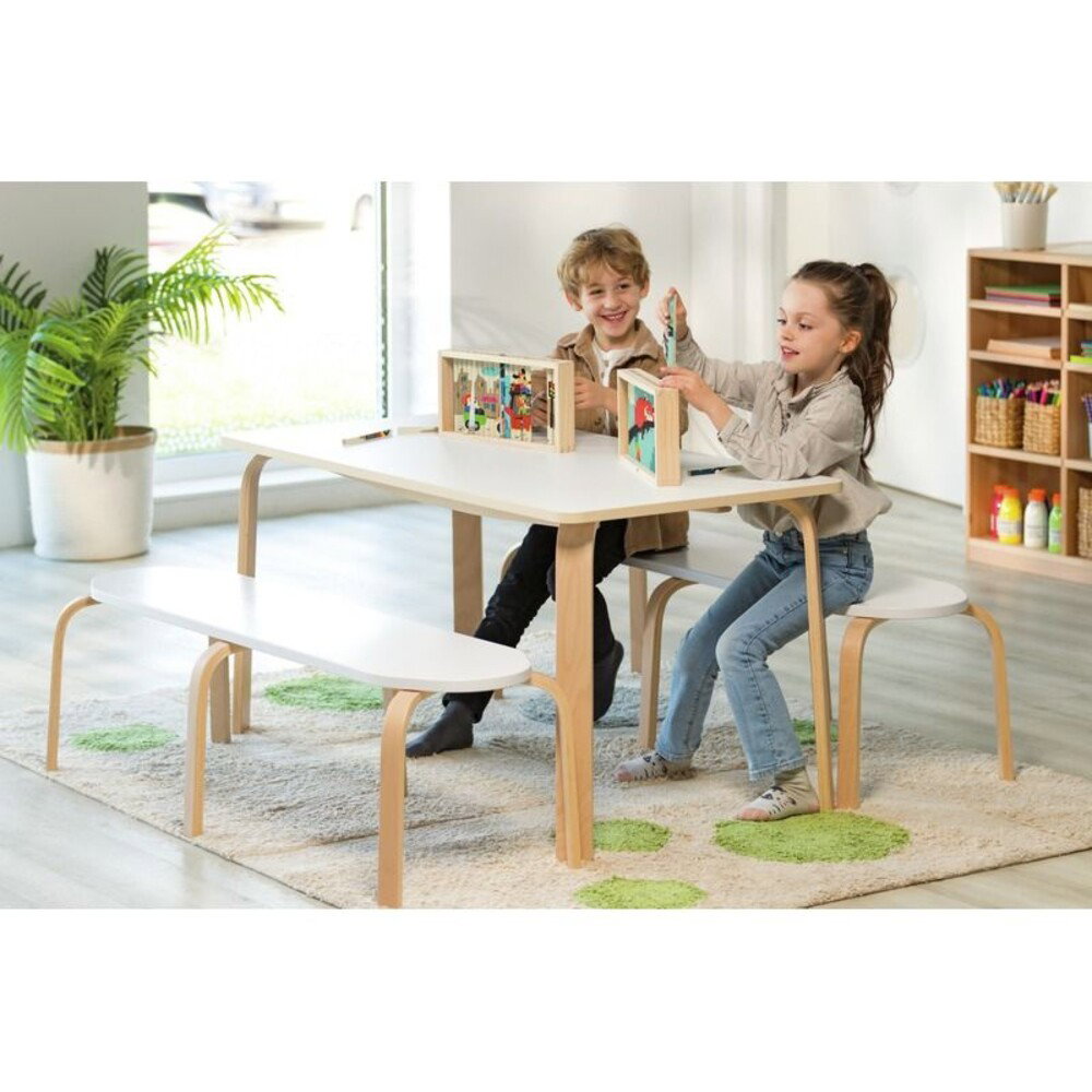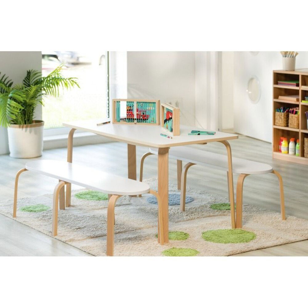 Dank der robusten Konstruktion aus hochwertigem Sperrholz hält die Bank auch einer intensiven Nutzung problemlos stand. Sie ist so stabil, dass sich sogar ein Erwachsener darauf setzen kann, was sie besonders vielseitig macht. - Frische Farben für eine inspirierende Umgebung