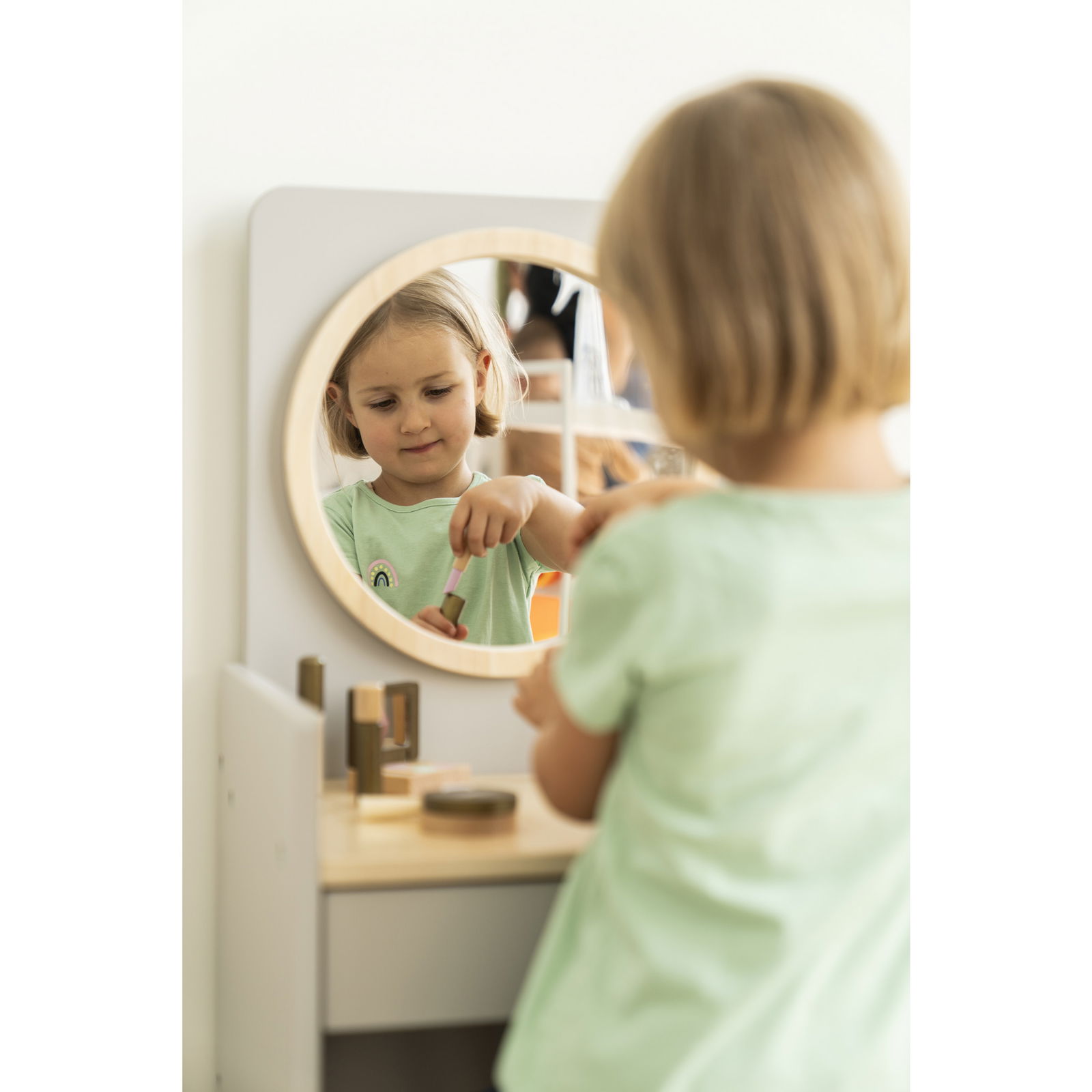 Im Spiegel betrachten sich Kinder, schneiden Grimassen und beobachten ihre eigenen Reaktionen. Dies stärkt das Bewusstsein für den eigenen Körper und die eigene Identität. Gleichzeitig können in kindgerechter Höhe und ganz ohne fremde Hilfe tägliche Routinen wie Haare kämmen oder das Gesicht waschen geübt werden. - Praktisch und durchdacht im Detail