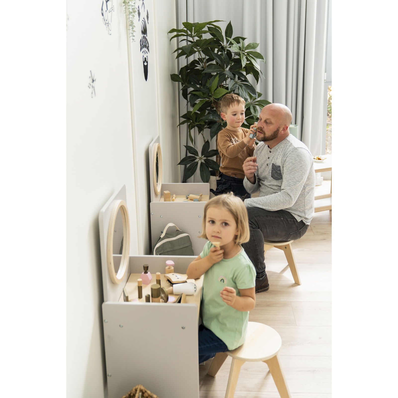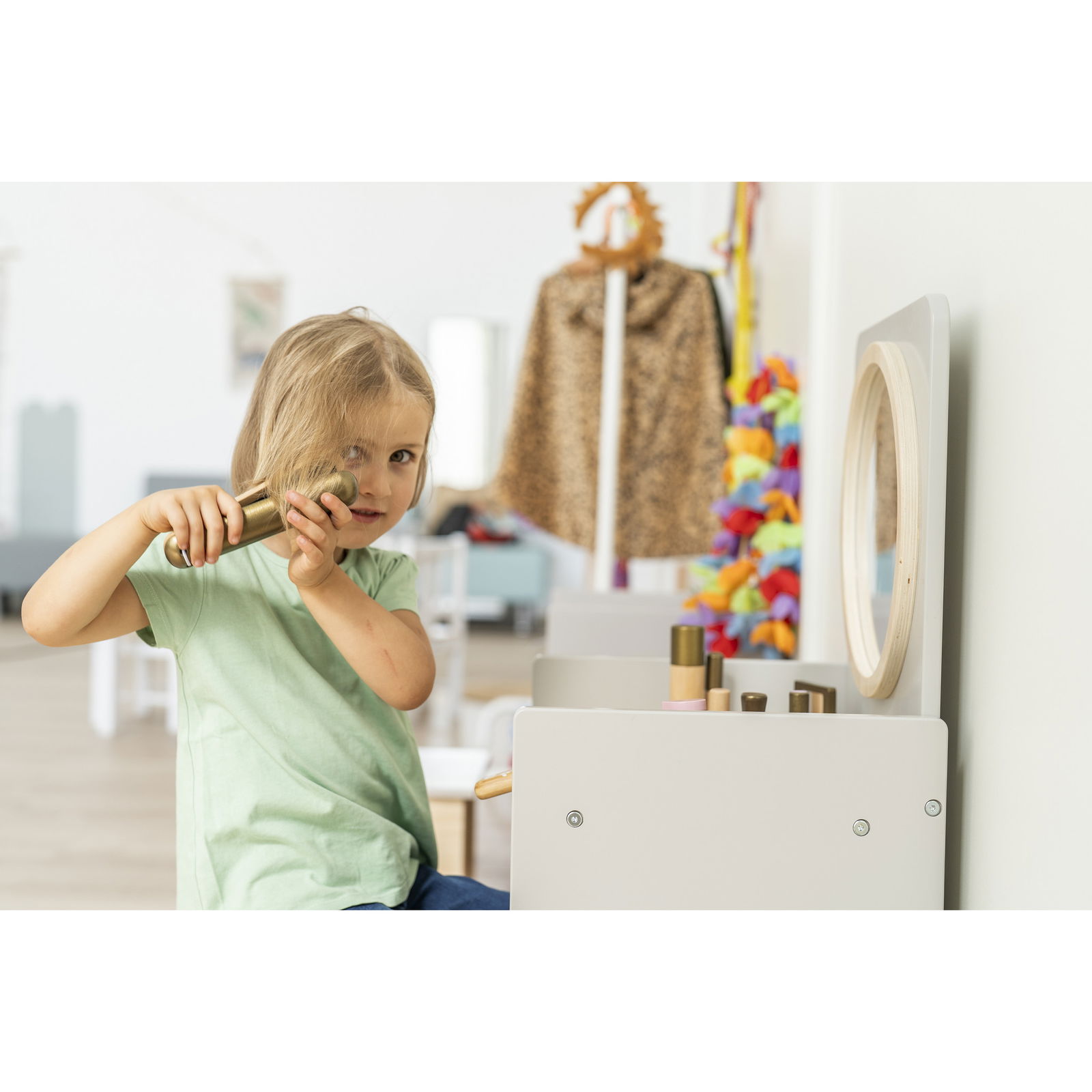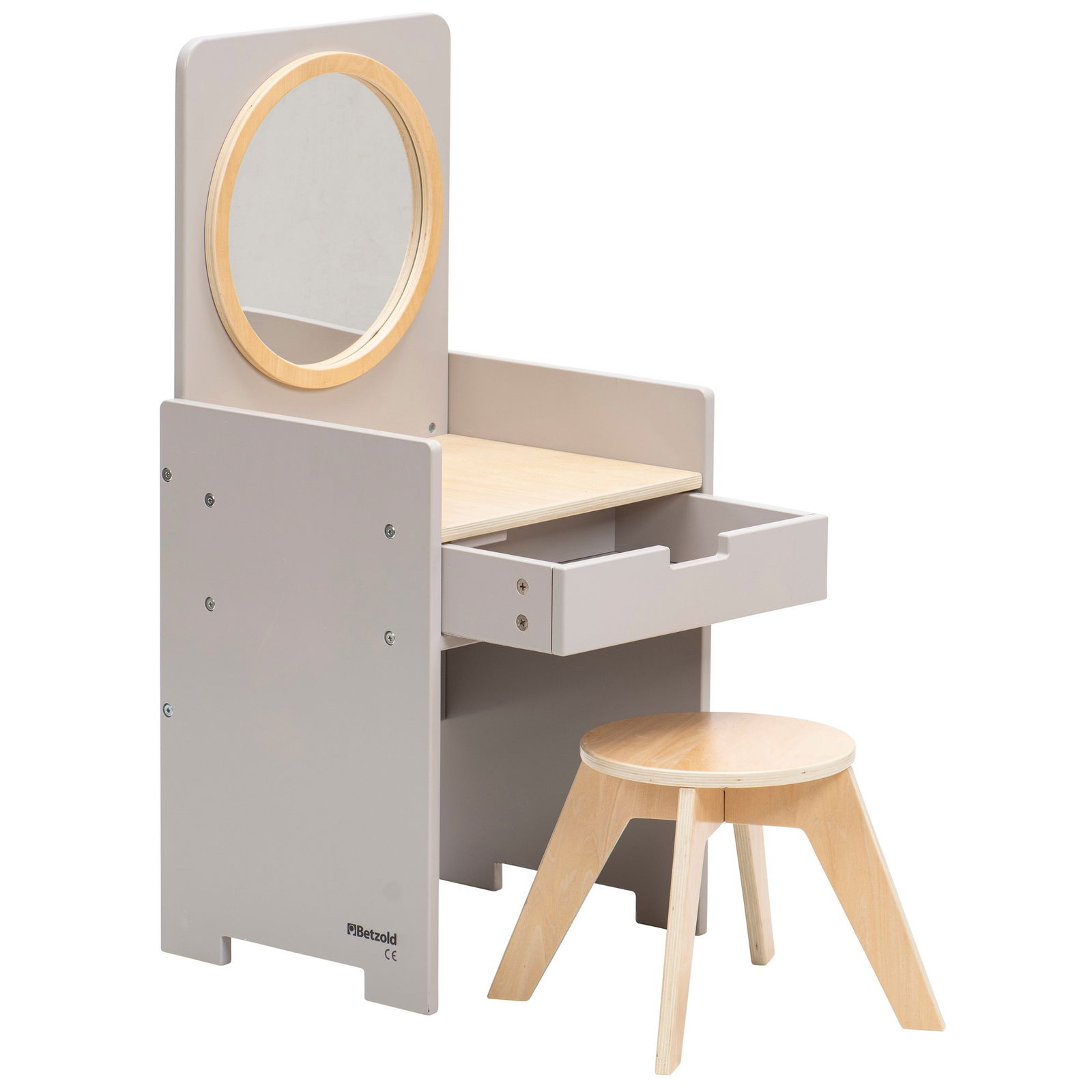 Verwandeln Sie die Puppenecke oder den Gruppenraum in einen magischen Ort der Kreativität. Der Kinder-Spiegeltisch inklusive Hocker ist weit mehr als nur ein Möbelstück – er ist eine Einladung in die Welt der Rollenspiele, in der Kinder ihre Vorstellungskraft frei entfalten können. Ob als eleganter Schminktisch, belebter Friseursalon oder cooler Barbershop, dieses vielseitige Spielmöbel passt sich jeder Idee an. Durch sein neutrales, modernes Design wird er schnell zum beliebten Treffpunkt, an dem Kinder kommunizieren, in neue Rollen schlüpfen und spielerisch soziale Fähigkeiten entwickeln. Mit einer praktischen Schublade und einem passenden Hocker ist alles bereit für das nächste große Abenteuer.