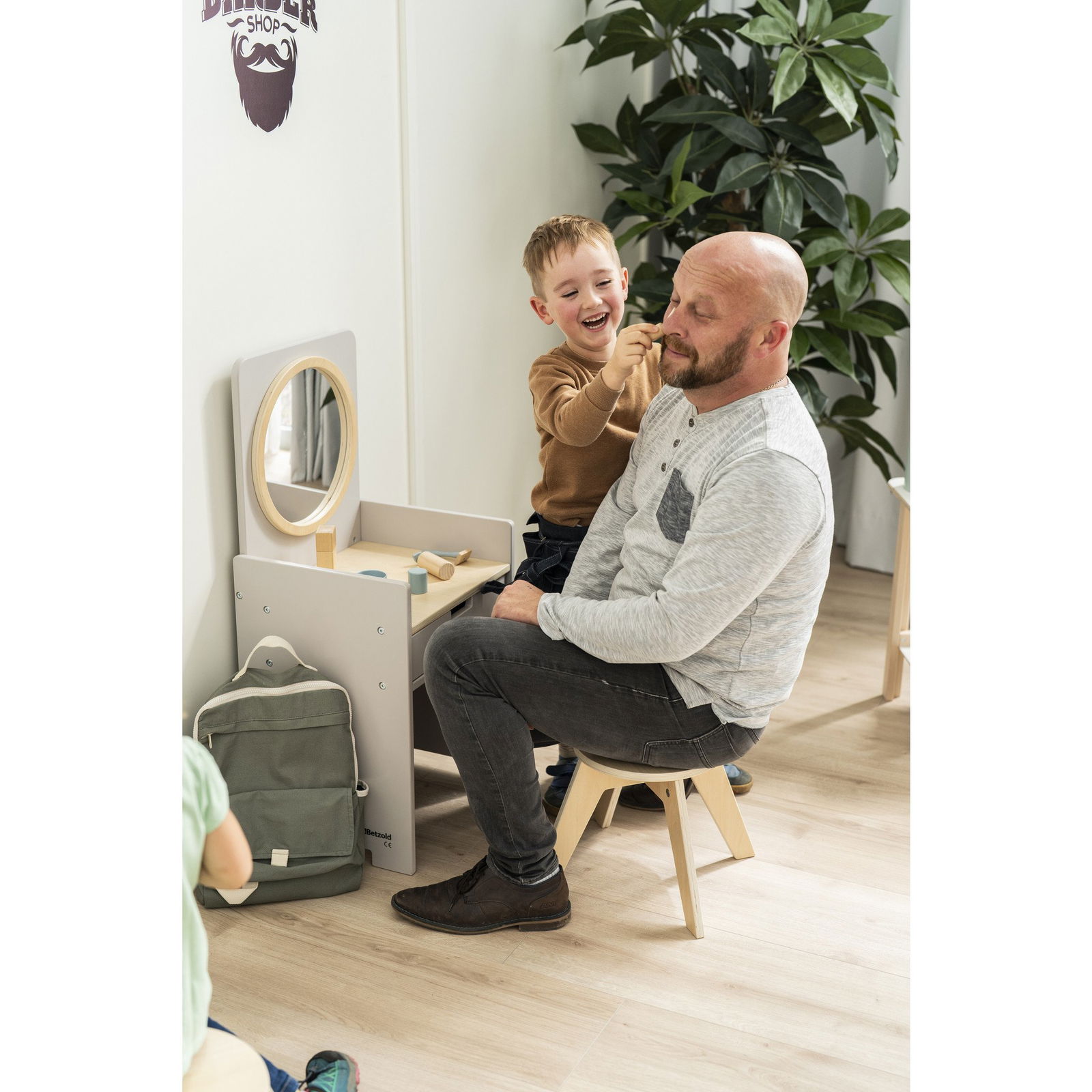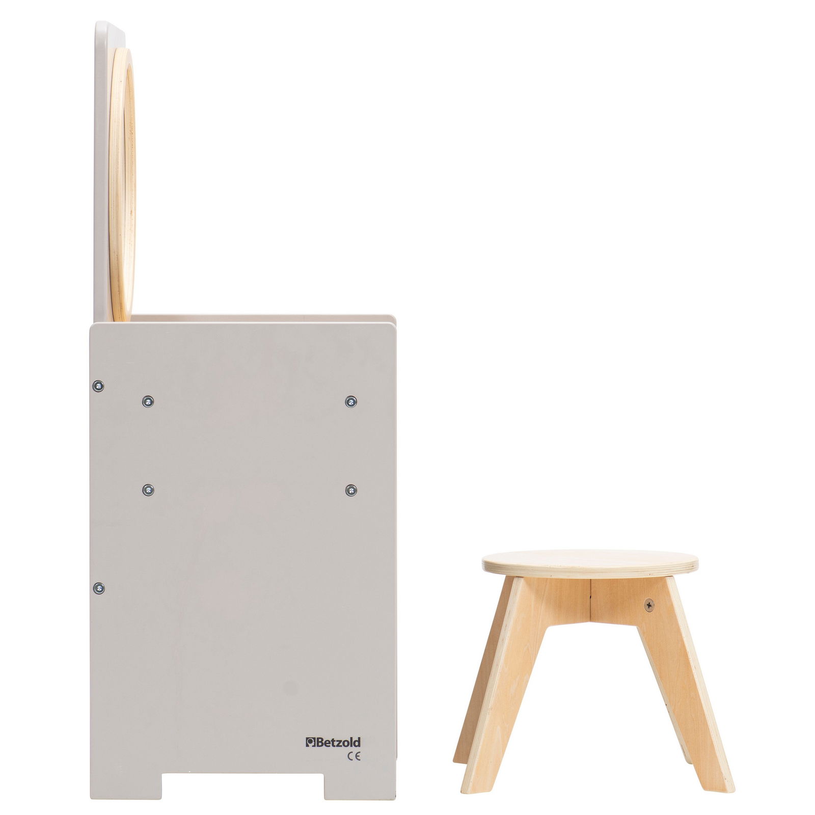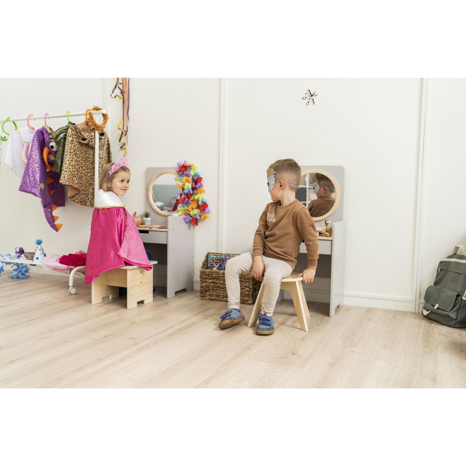 Verwandeln Sie die Puppenecke oder den Gruppenraum in einen magischen Ort der Kreativität. Der Kinder-Spiegeltisch inklusive Hocker ist weit mehr als nur ein Möbelstück – er ist eine Einladung in die Welt der Rollenspiele, in der Kinder ihre Vorstellungskraft frei entfalten können. Ob als eleganter Schminktisch, belebter Friseursalon oder cooler Barbershop, dieses vielseitige Spielmöbel passt sich jeder Idee an. Durch sein neutrales, modernes Design wird er schnell zum beliebten Treffpunkt, an dem Kinder kommunizieren, in neue Rollen schlüpfen und spielerisch soziale Fähigkeiten entwickeln. Mit einer praktischen Schublade und einem passenden Hocker ist alles bereit für das nächste große Abenteuer.