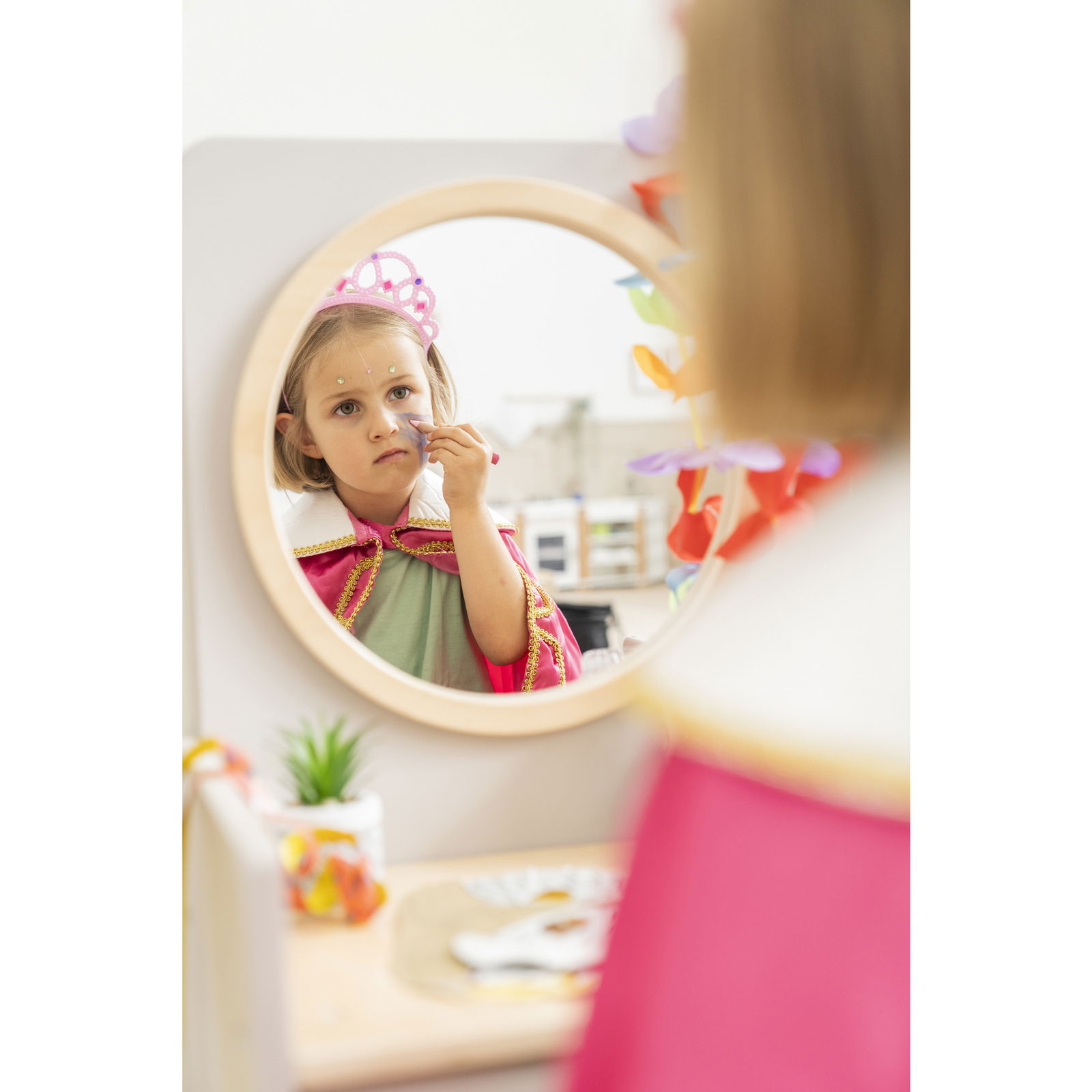 Beim gemeinsamen Spiel am Spiegeltisch wird geredet, verhandelt und gelacht. Kinder trainieren ihre Kommunikationsfähigkeiten, erweitern ihren Wortschatz und üben Empathie, indem sie die Bedürfnisse ihrer „Kunden“ erfüllen. Diese Interaktionen sind entscheidend für die soziale Entwicklung. - Unterstützt die Selbstwahrnehmung