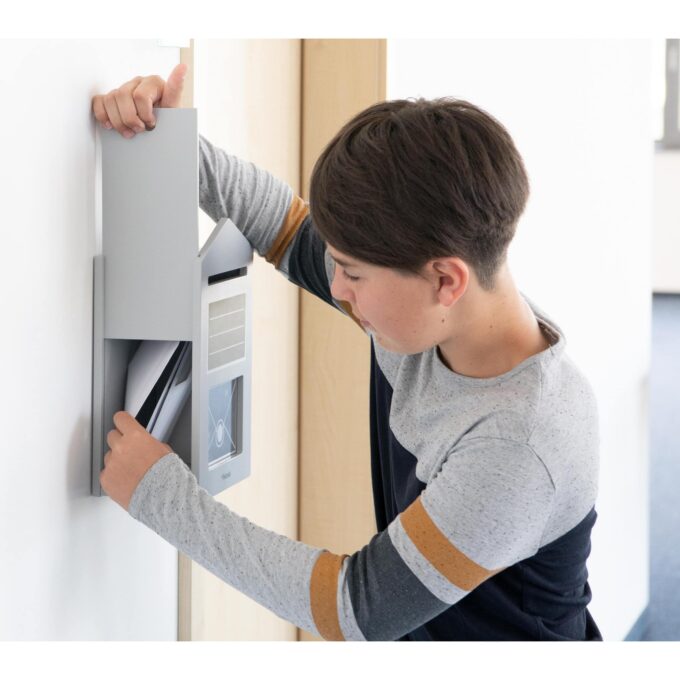 Mit seinem schlichten, modernen und zeitlosen grauen Design fügt sich der Betzold Kinderbriefkasten harmonisch in jede Umgebung ein. Er kann entweder aufgestellt oder dank der praktischen Löcher auf der Rückseite an der Wand befestigt werden. So können Sie den Briefkasten ganz nach Ihren Wünschen nutzen – sei es als Hingucker im Klassenzimmer oder als praktischer Kummerkasten im Büro.