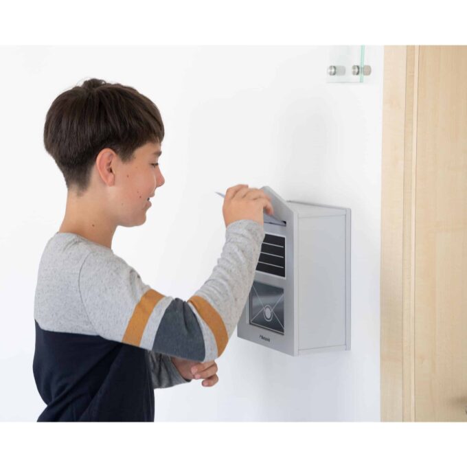 Der Briefkasten verfügt über eine mit Kreide beschreibbare Tafelfläche, die es den Kindern ermöglicht, Notizen oder Nachrichten zu hinterlassen. Dies kann eine tolle Möglichkeit sein, um miteinander zu kommunizieren oder kleine Erinnerungen zu notieren. Der großzügige Schlitz an der Vorderseite ermöglicht es, sogar größere Briefe und Zeichnungen bequem einzuw werfen – ideal für kreative Projekte!