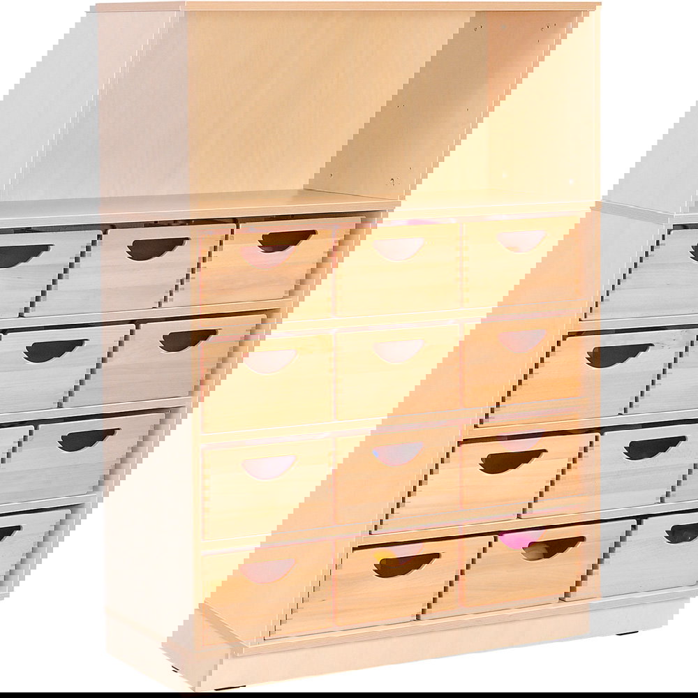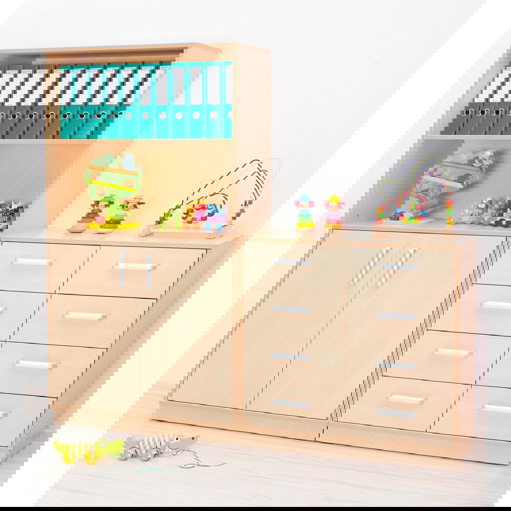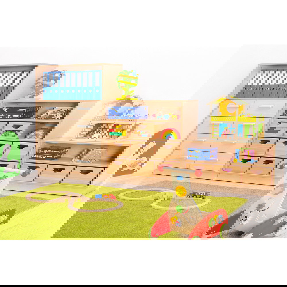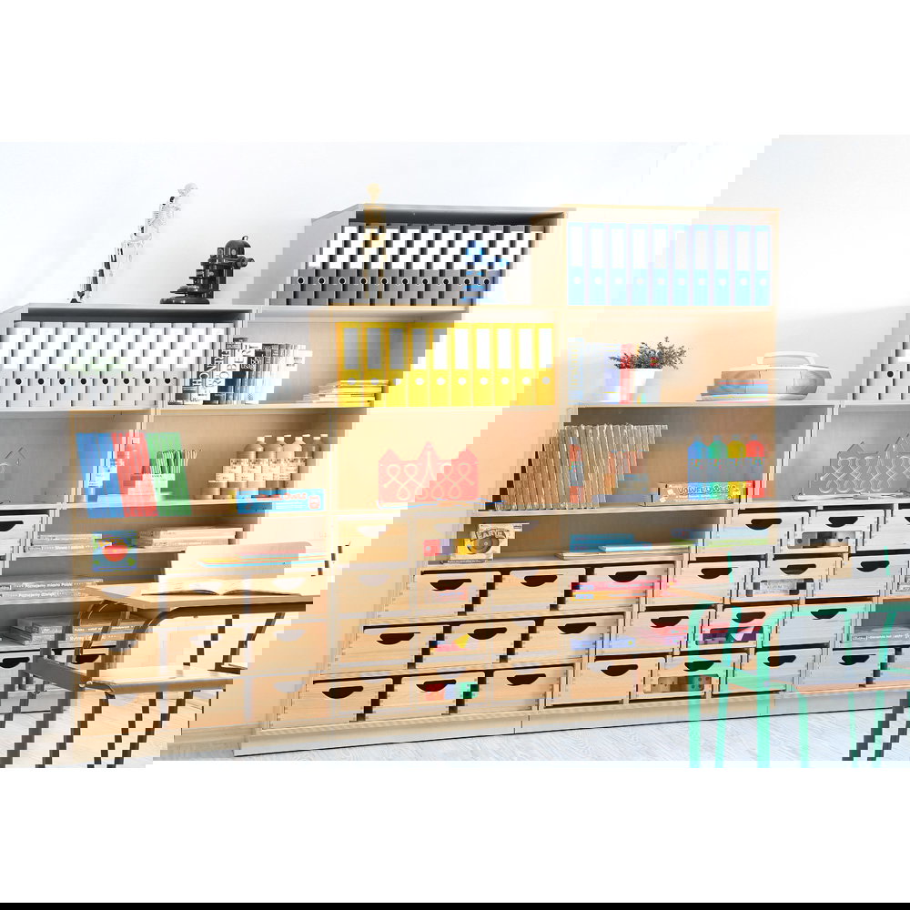 Das Design im freundlichen Birke-Dekor fügt sich perfekt in die bestehende Flexi-Landschaft ein und schafft ein harmonisches, einheitliches Gesamtbild. Das Aufsatzregal wird fest mit dem darunterliegenden Modul verbunden und zusätzlich an der Wand verankert, was maximale Stabilität und Sicherheit gewährleistet – ein unverzichtbares Kriterium in Kitas, Schulen und anderen belebten Umgebungen. Standardmäßig als offenes Regal konzipiert, bietet es schnellen Zugriff auf Bücher, Ordner oder Materialien. Für eine ruhigere Optik oder zum Schutz des Inhalts vor Staub kann das Regal jederzeit mit passenden Türen (Größe S), die in diversen Farben erhältlich sind, nachgerüstet werden.