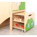 Dieses Baumhaus lädt in Räumen zum Klettern ein und bietet einer ganzen Gruppe viel Spaß. Über eine Treppe gelangen die Kinder ins Innere: hier gibt es viel zu entdecken! Motorikspiel und Rohrpost schulen Auge-Hand-Koordination, das Bullauge dient als Ausguck. Im Baum befinden sich Öffnungen, an denen kleine „Äpfel“ von beiden Seiten befestigt werden können – daraus kann sich ein lustiges Spiel entwickeln: Wer pflückt die Äpfel am schnellsten? Unter der Treppe befindet sich ein herausziehbarer Schrank mit 2 Fächern. Das Baumhaus kann frei im Raum aufgestellt werden. Passende Tür zur Montage an der Treppe (096843) separat zu bestellen.