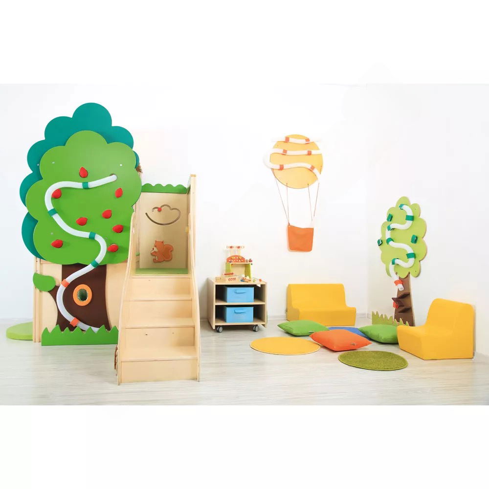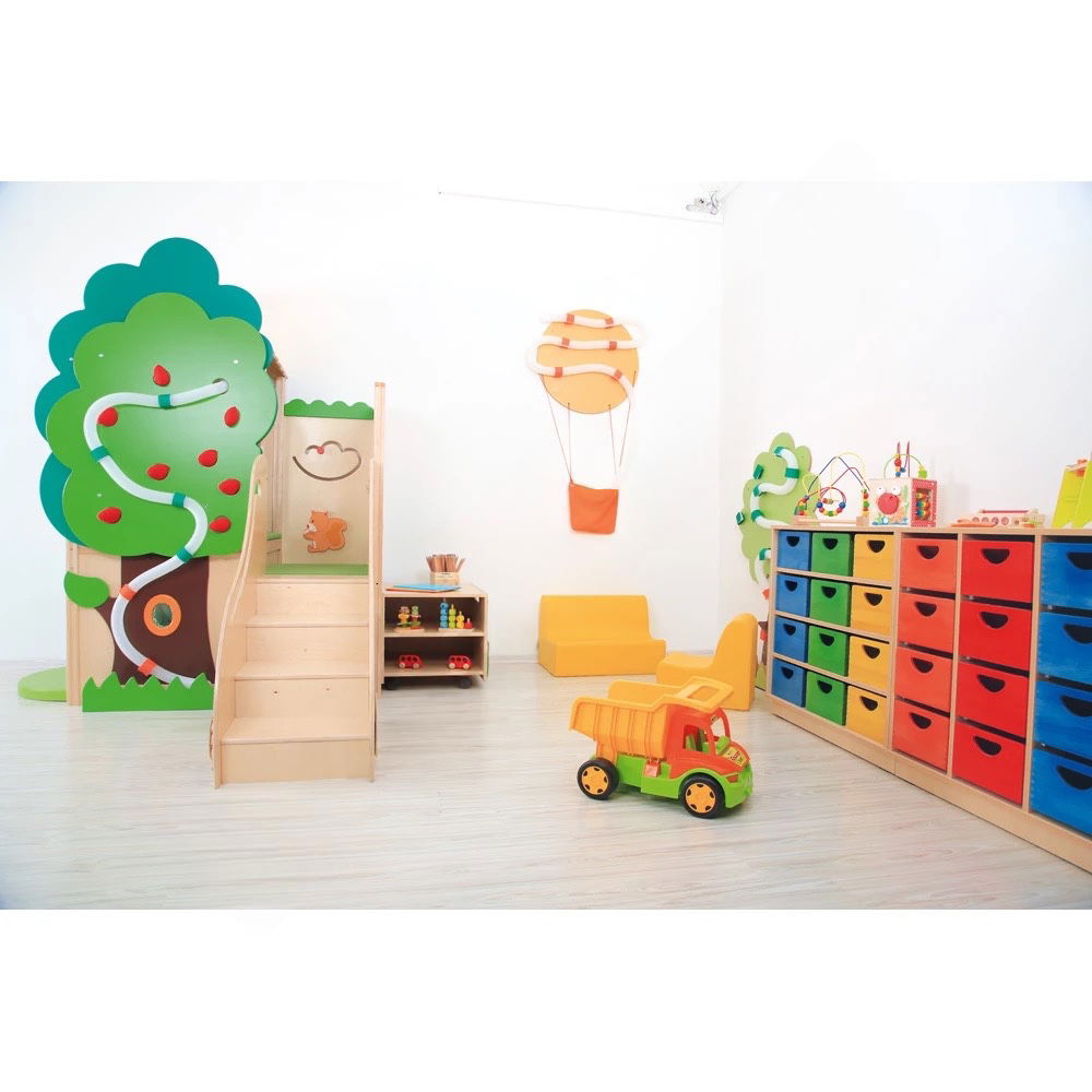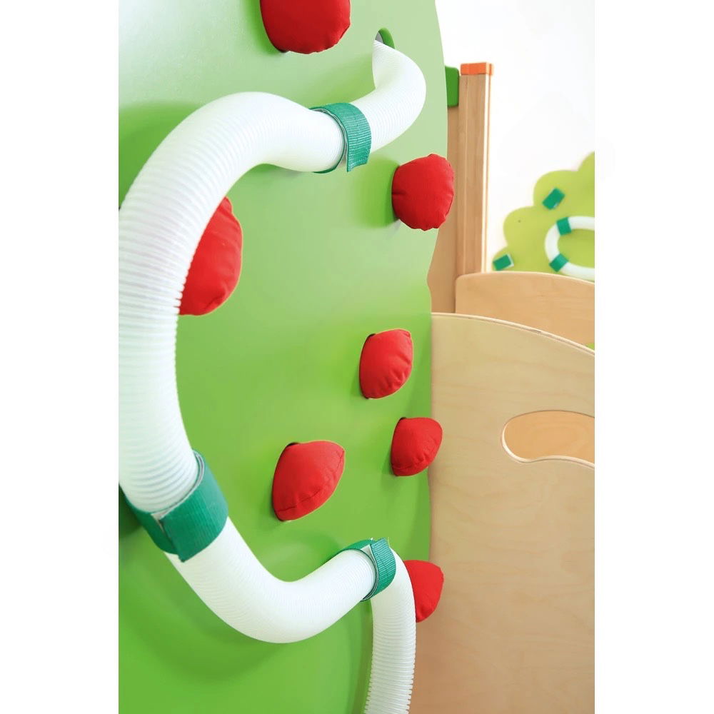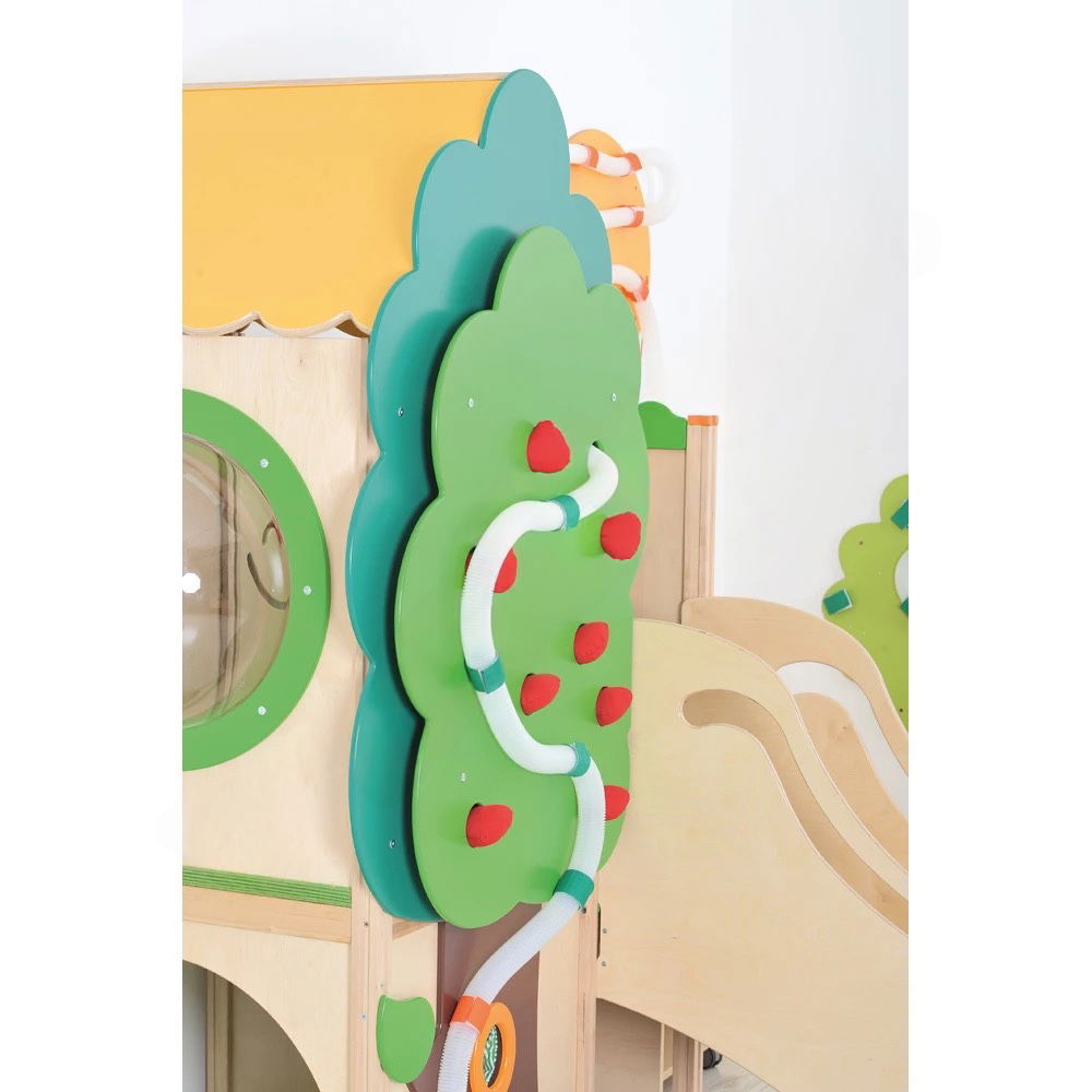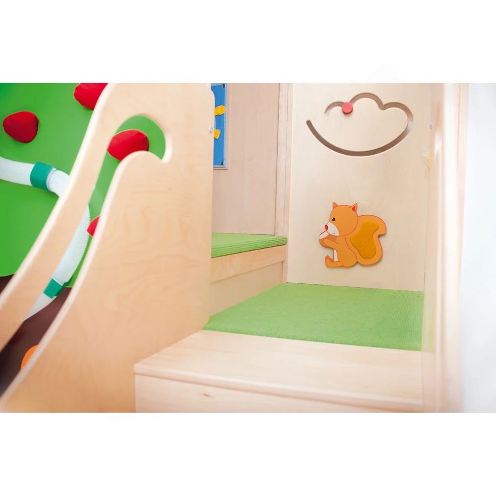 Hier wird nicht nur geklettert! Das integrierte Motorikspiel und die spannende Rohrpost schulen spielerisch die Auge-Hand-Koordination. Das Apfel-Spiel an den „Baum“-Wänden, bei dem kleine gefüllte Äpfel befestigt und gepflückt werden können, trainiert Feinmotorik und Reaktionsgeschwindigkeit – wer ist der schnellste Erntehelfer? - Soziales Miteinander in der Gruppe