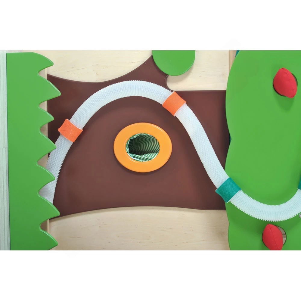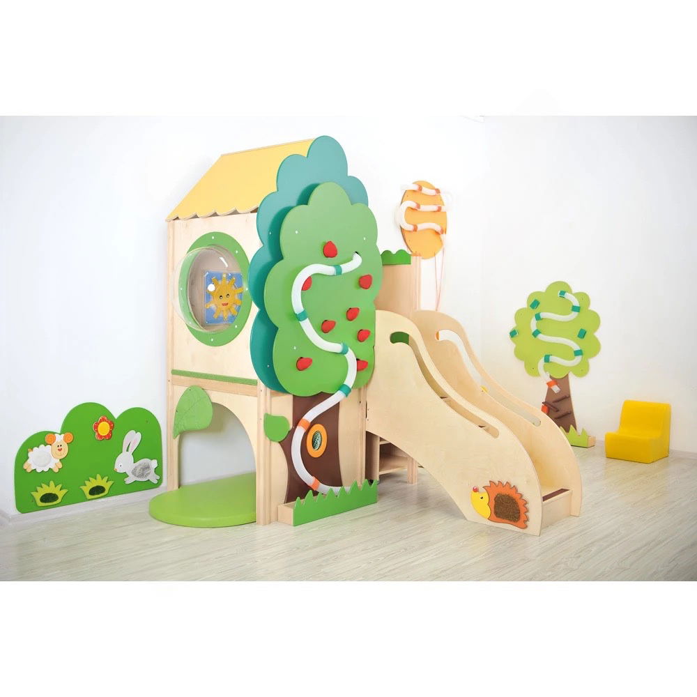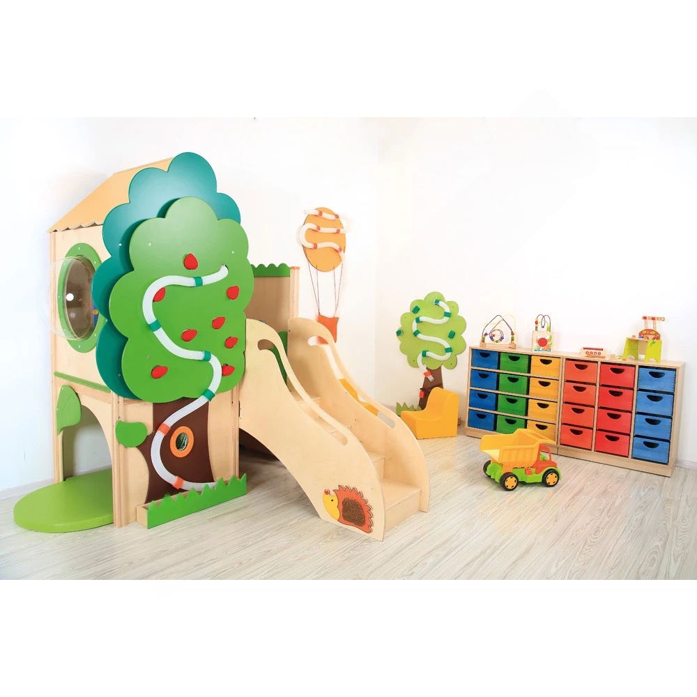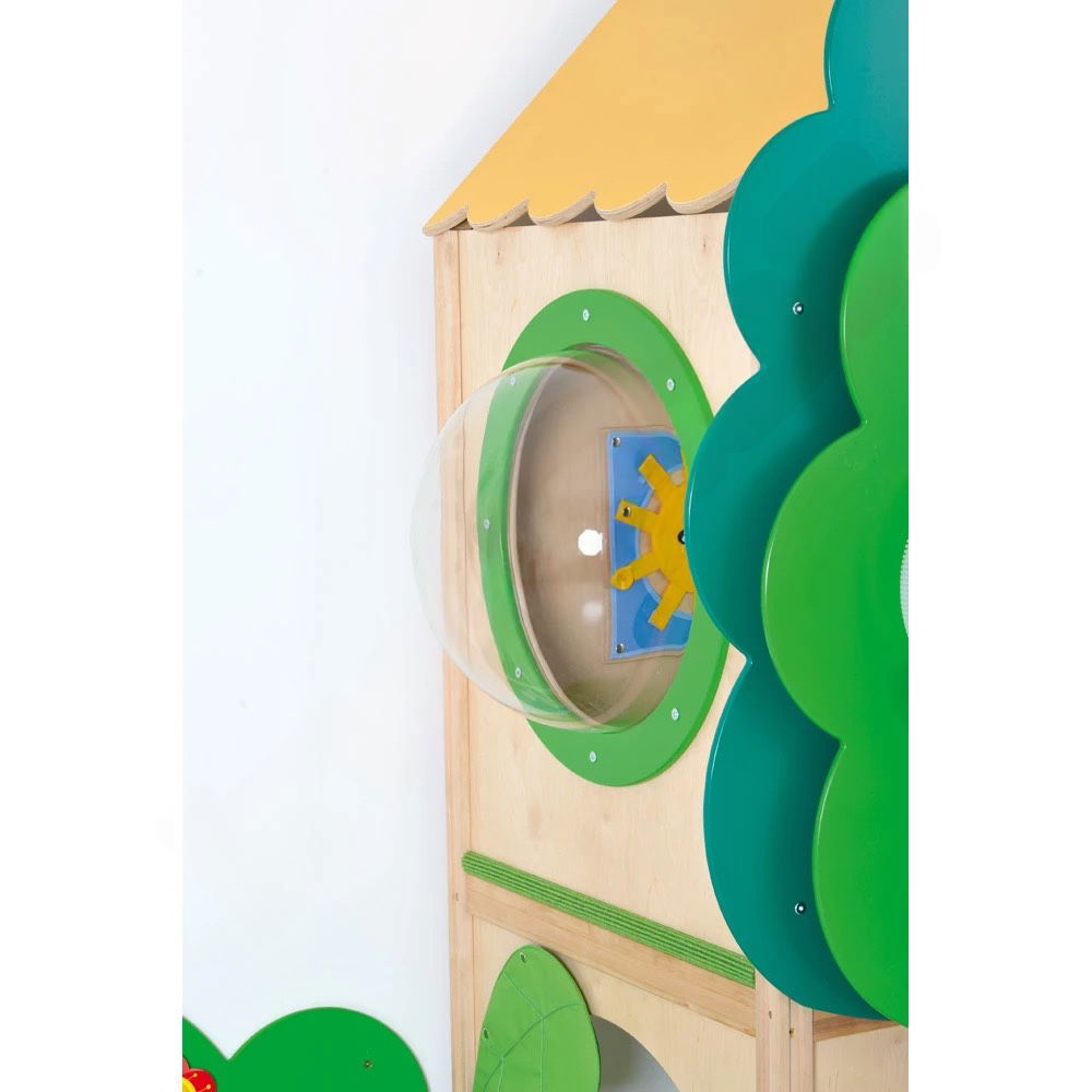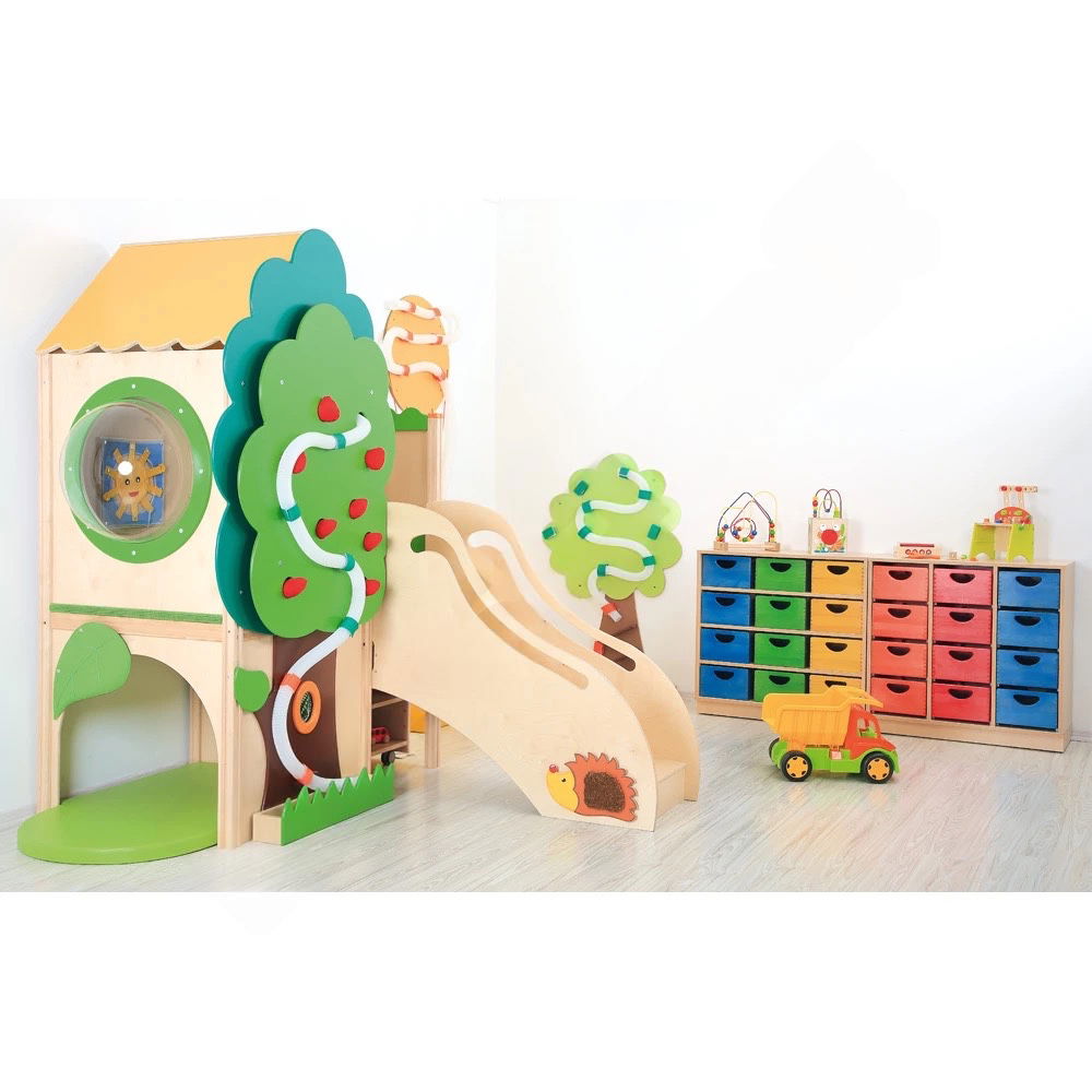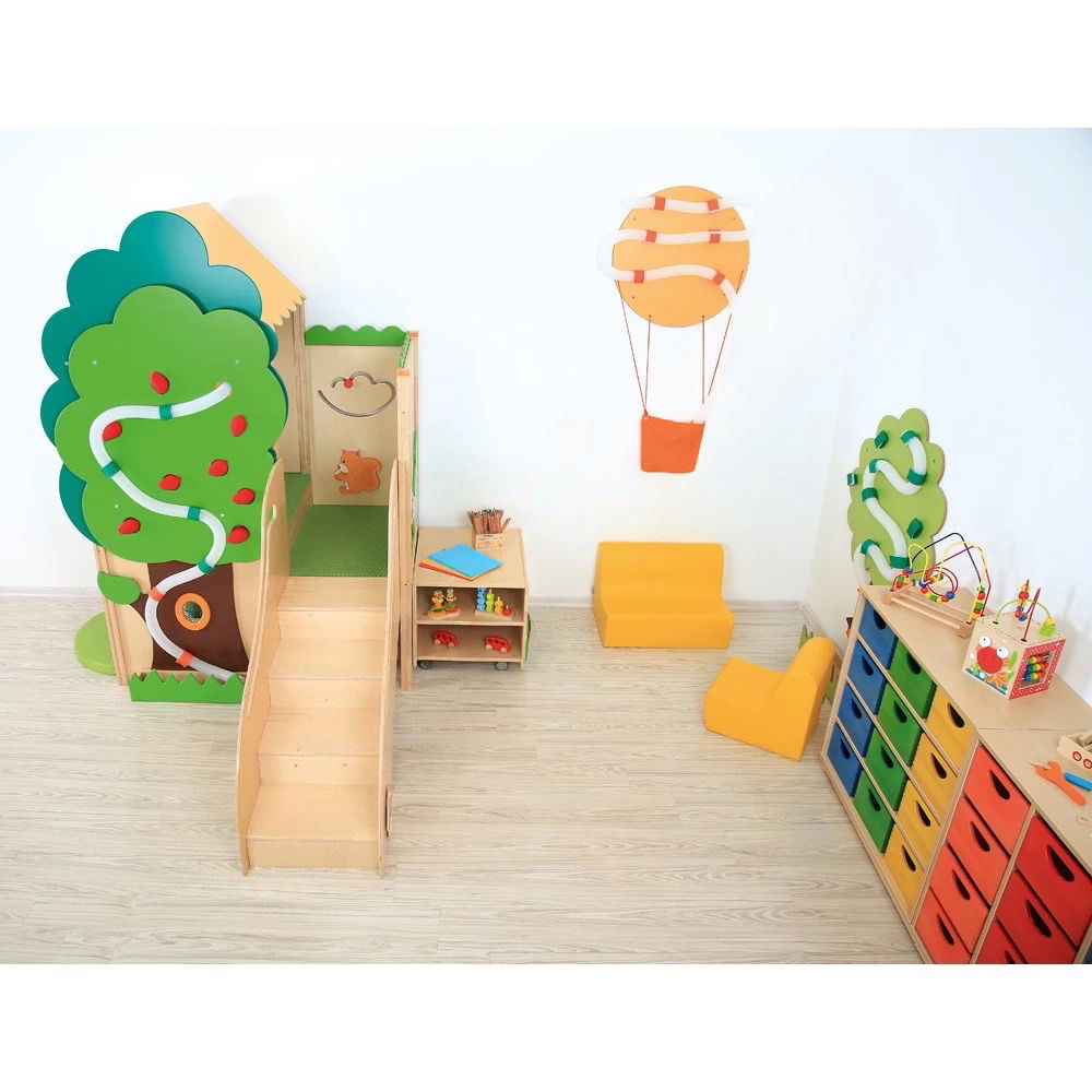 Hier wird nicht nur geklettert! Das integrierte Motorikspiel und die spannende Rohrpost schulen spielerisch die Auge-Hand-Koordination. Das Apfel-Spiel an den „Baum“-Wänden, bei dem kleine gefüllte Äpfel befestigt und gepflückt werden können, trainiert Feinmotorik und Reaktionsgeschwindigkeit – wer ist der schnellste Erntehelfer? - Soziales Miteinander in der Gruppe