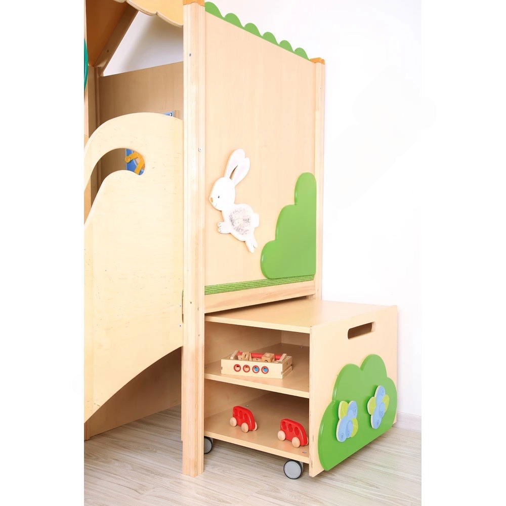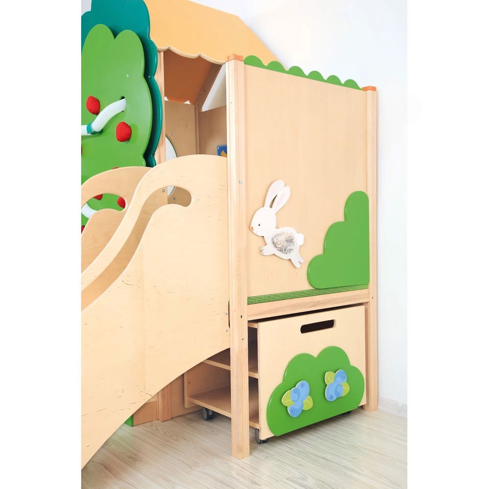 Das großzügige Platzangebot auf zwei Ebenen (Podeste auf 59 und 78 cm Höhe) lädt zum gemeinsamen Spielen ein. Das Baumhaus kann frei im Raum stehen und ist von allen Seiten zugänglich, was Interaktion fördert. Ob Verstecken, Rollenspiele oder Wettbewerbe – hier lernen Kinder, sich abzustimmen und gemeinsam Spaß zu haben. - Cleverer Stauraum inklusive