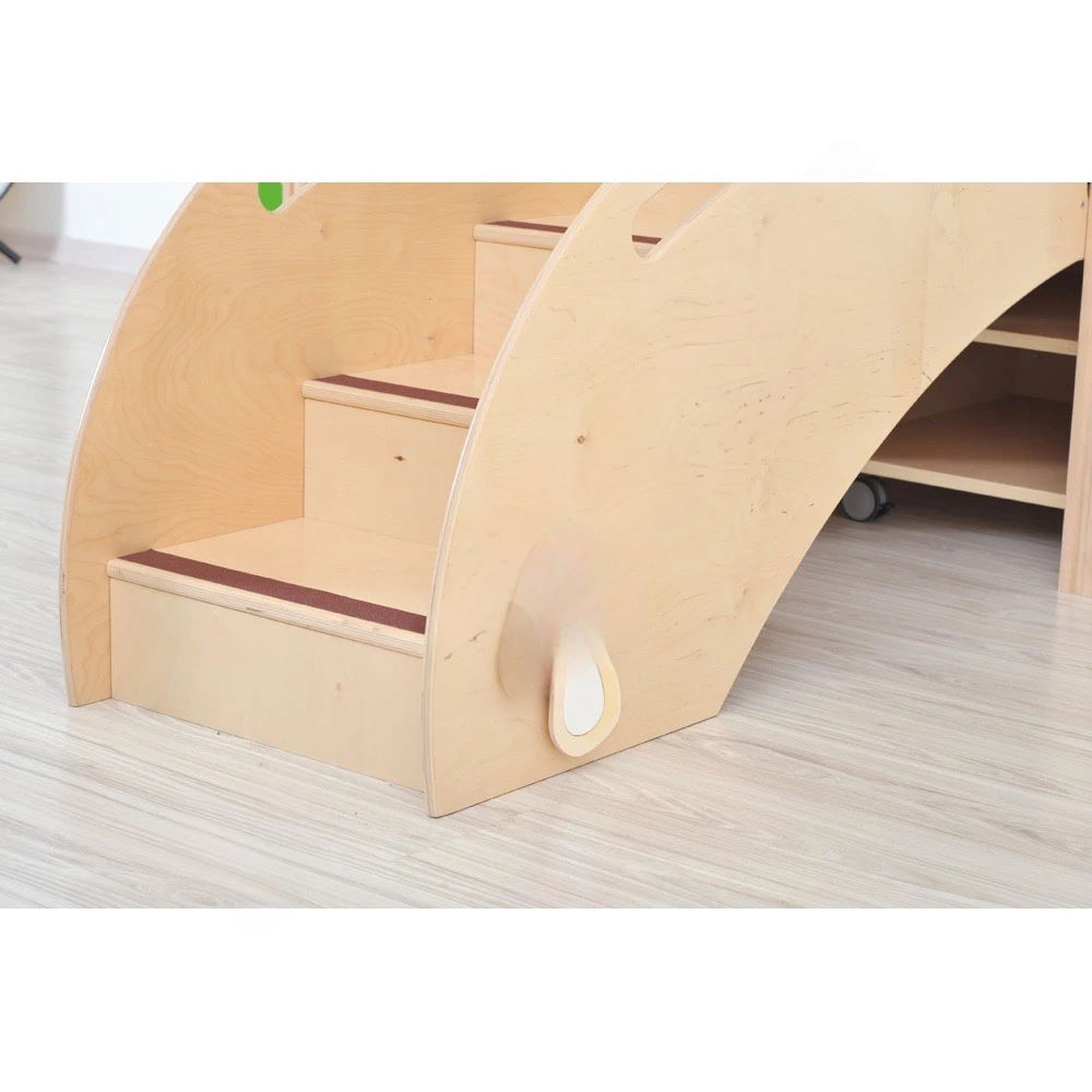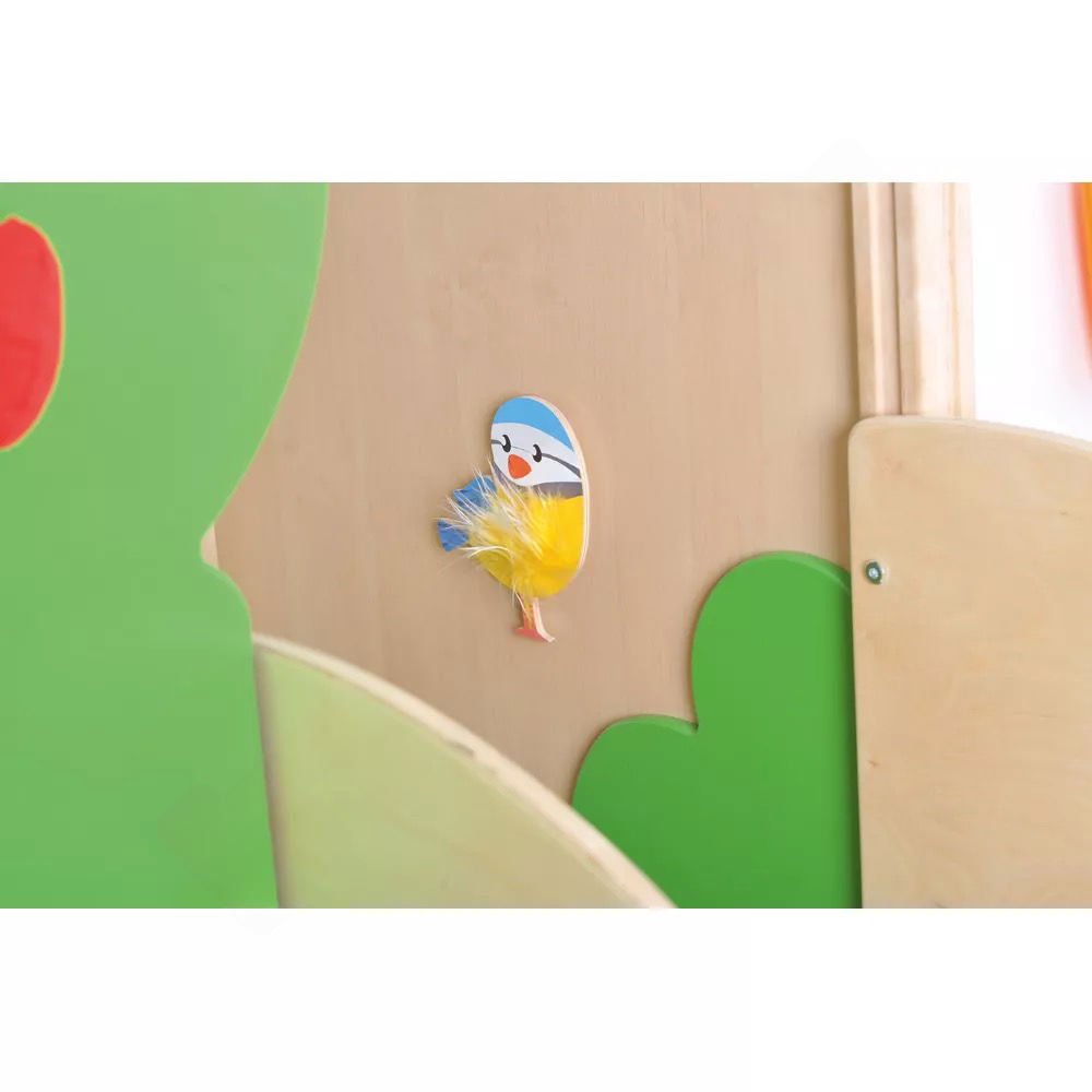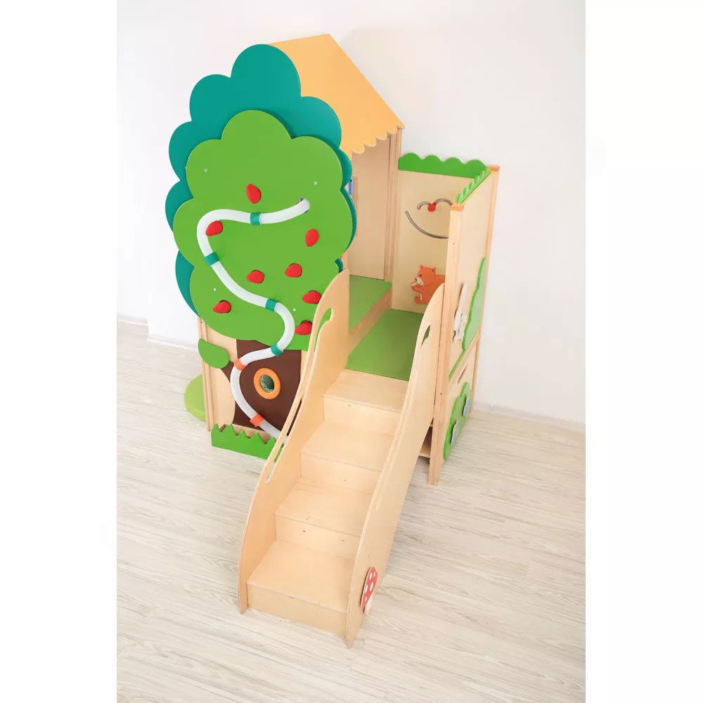 Das durchdachte Design fördert nicht nur die Bewegung, sondern spricht auch gezielt die Feinmotorik und Koordination an. Mit interaktiven Elementen wie dem Apfelpflück-Spiel und verschiedenen sensorischen Details wird die Neugier geweckt und die Geschicklichkeit trainiert. Dank der hochwertigen Materialien wie massivem Buchenholz und lackiertem Birkensperrholz ist das Baumhaus extrem robust und langlebig – bereit für viele Jahre voller Kinderlachen und Fantasiereisen.