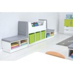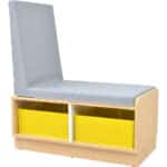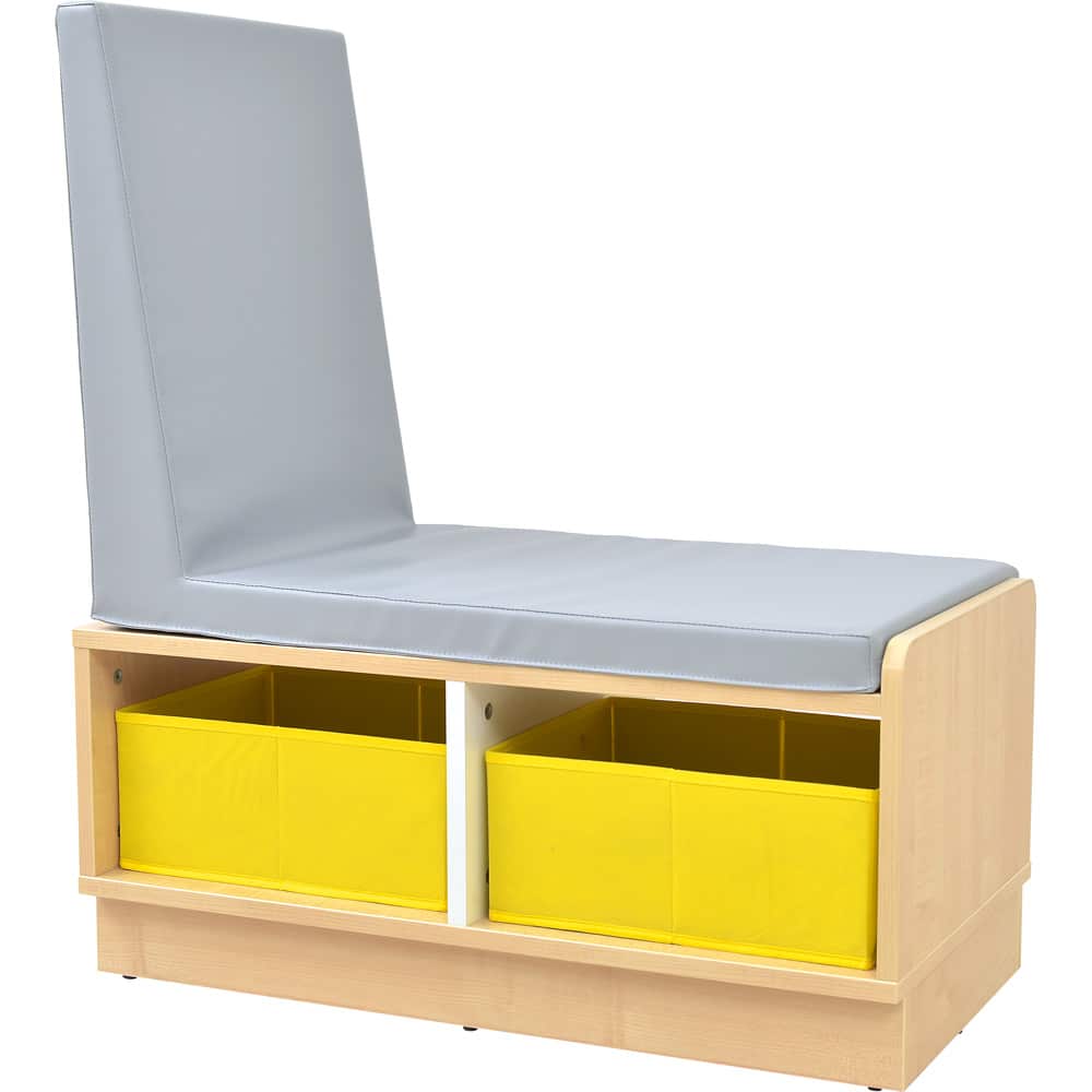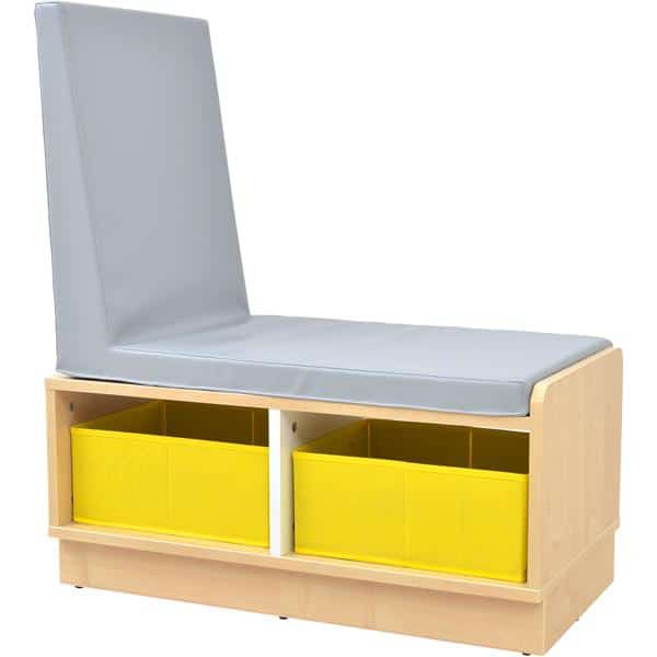 Die Quadro – Sitzbank mit Regalteil vereint Sitzkomfort und Stauraum in einem eleganten Möbelstück. Diese vielseitige Sitzbank ist ideal für Kindergärten, Schulen und Zuhause und bietet Platz für Textilboxen, die separat bestellbar sind.