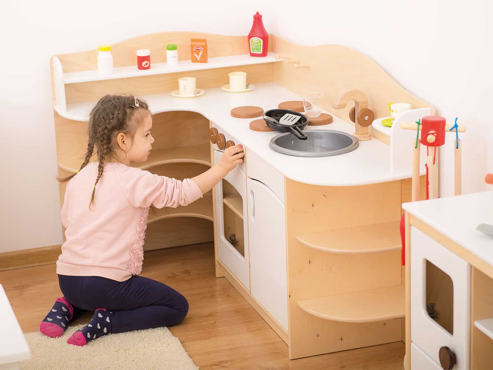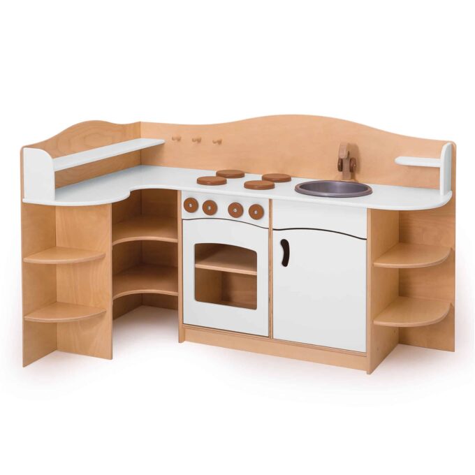 Kindergarten-Eckküche aus Sperrholz, weiß für Kitas, Krippen und Kindergarten