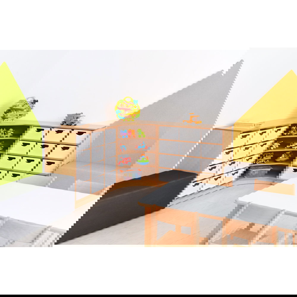 Ecken in Gruppenräumen, Klassenzimmern oder Büros sind oft ungenutzte Flächen. Mit dem Flexi Eckschrank M (Seitenwand 41,5 cm) verwandeln Sie diese toten Winkel in wertvollen Stauraum und schaffen gleichzeitig eine harmonische Verbindung zwischen Ihren Möbeln. Dieses clevere Eckelement ist speziell dafür konzipiert, zwei Schrankzeilen nahtlos über eine 90-Grad-Ecke miteinander zu verbinden. Dank seiner durchdachten, fünfeckigen Grundform fügt es sich perfekt in das Flexi-System ein und sorgt für eine fließende, ununterbrochene Optik im Raum.