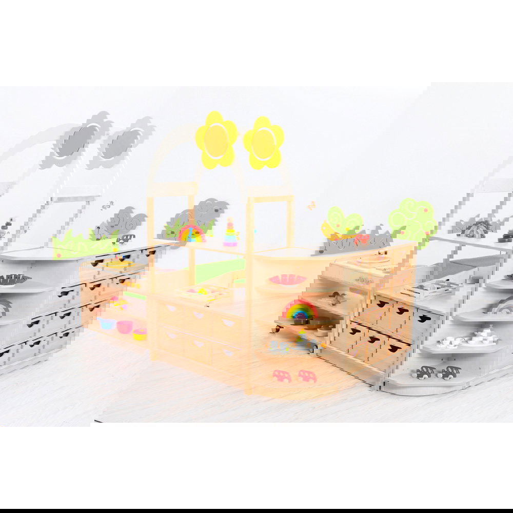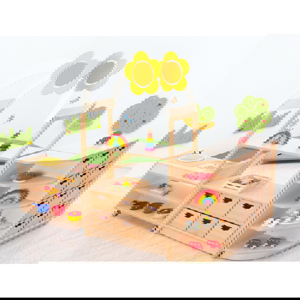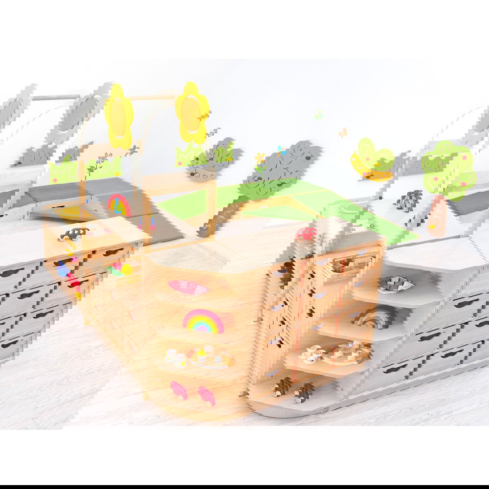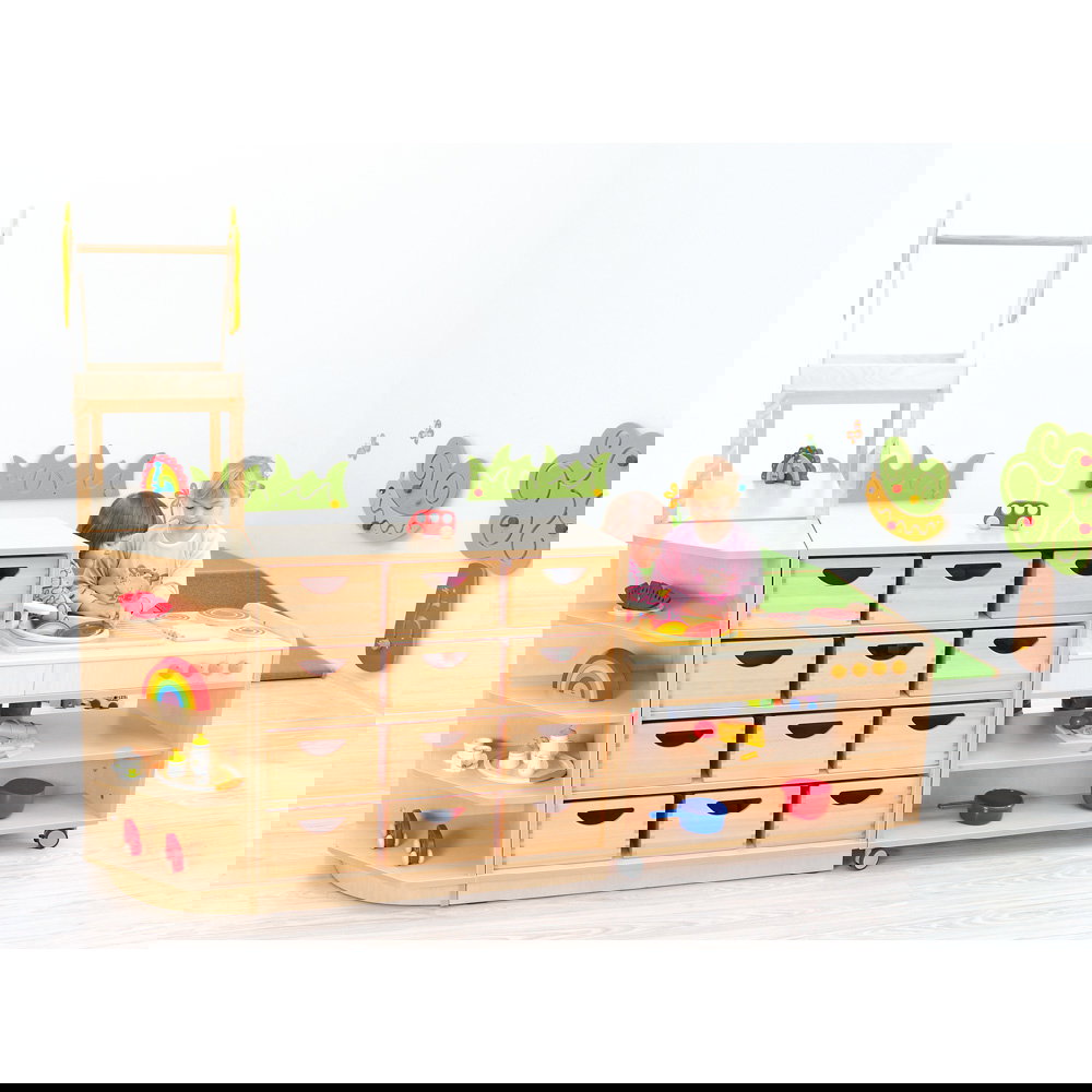 Der mittelhohe Schrank im freundlichen Birke-Dekor ist mehr als nur ein Verbindungsstück. Er bietet im Inneren überraschend viel Platz für Materialien, die schnell griffbereit sein müssen, aber nicht offen herumliegen sollen. Die robuste Konstruktion auf einem stabilen Sockel garantiert Standfestigkeit, selbst im turbulenten Alltag einer Kita oder Schule. Durch die präzise abgestimmte Seitentiefe von 41,5 cm schließt er bündig an alle anderen Flexi-Schränke der M-Serie an. So entsteht eine einheitliche Schrankwand, die den Raum optimal ausnutzt und strukturierte Ordnung schafft, ohne wuchtig zu wirken.