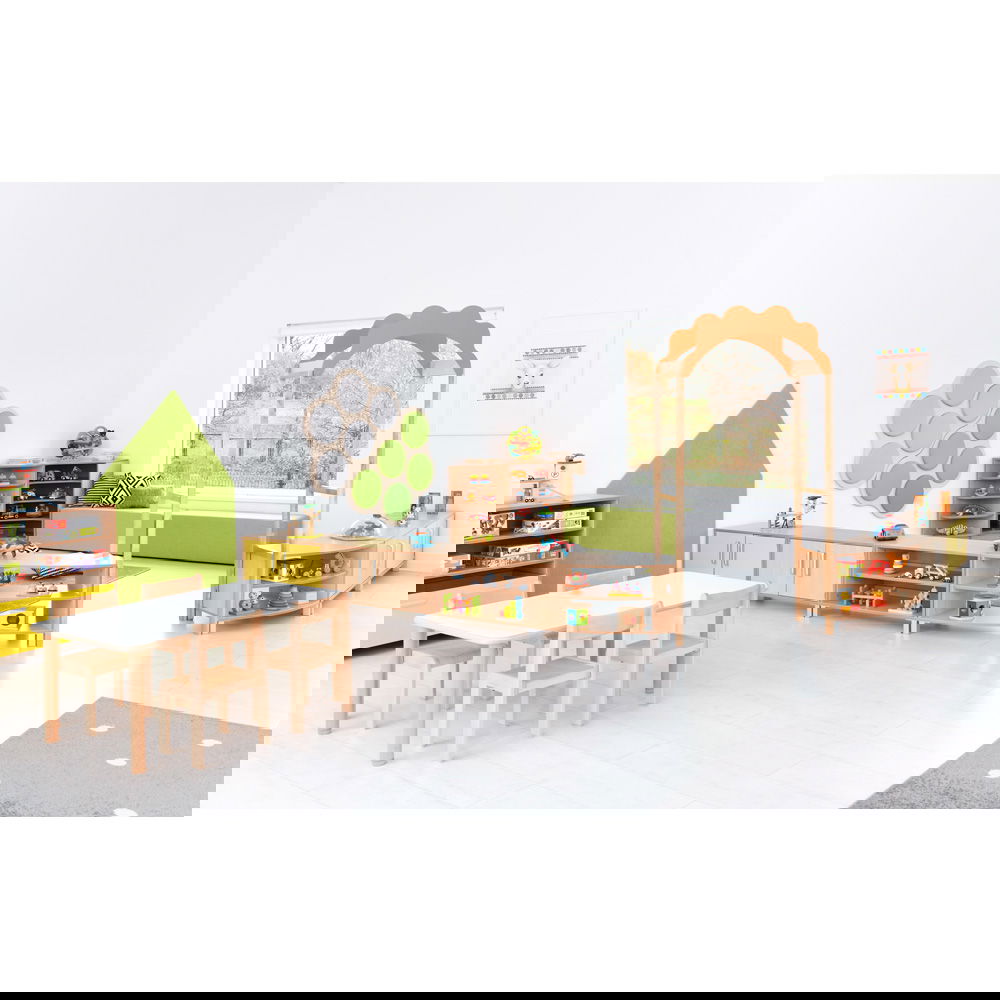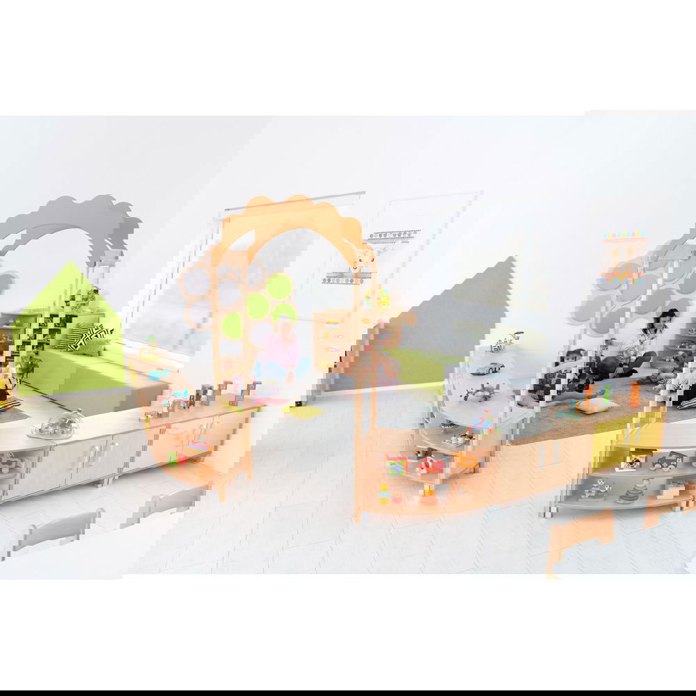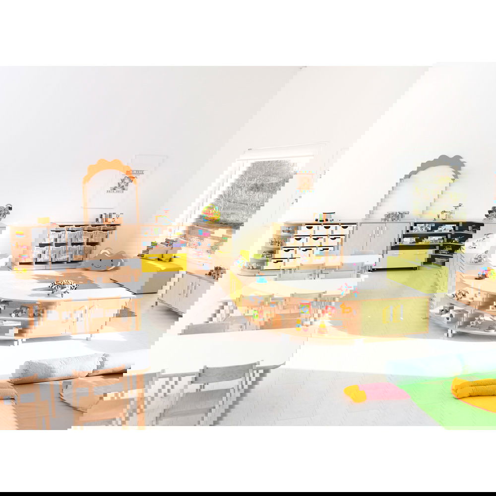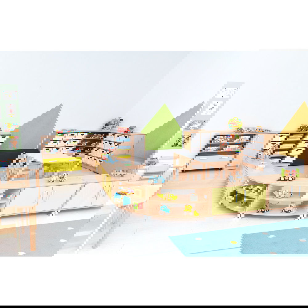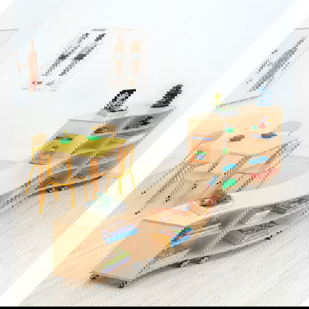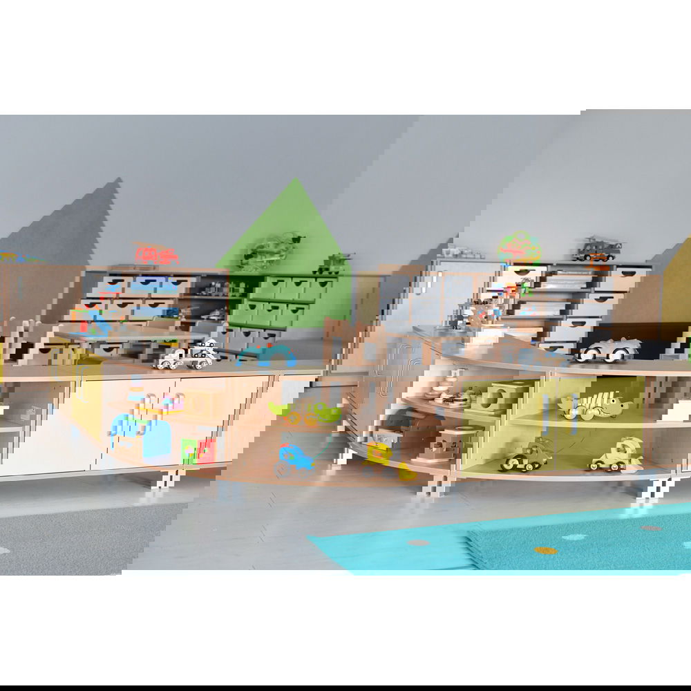Dank seiner geschwungenen Form lassen sich mit diesem Schrank fließende Übergänge und Zonen schaffen. Er grenzt Bereiche sanft ab, ohne den Blickkontakt oder die Offenheit des Raumes zu zerstören. Besonders in großen Gruppenräumen entstehen so geschützte Nischen für ruhiges Spiel oder konzentriertes Lernen. - Modulare Gestaltungsfreiheit