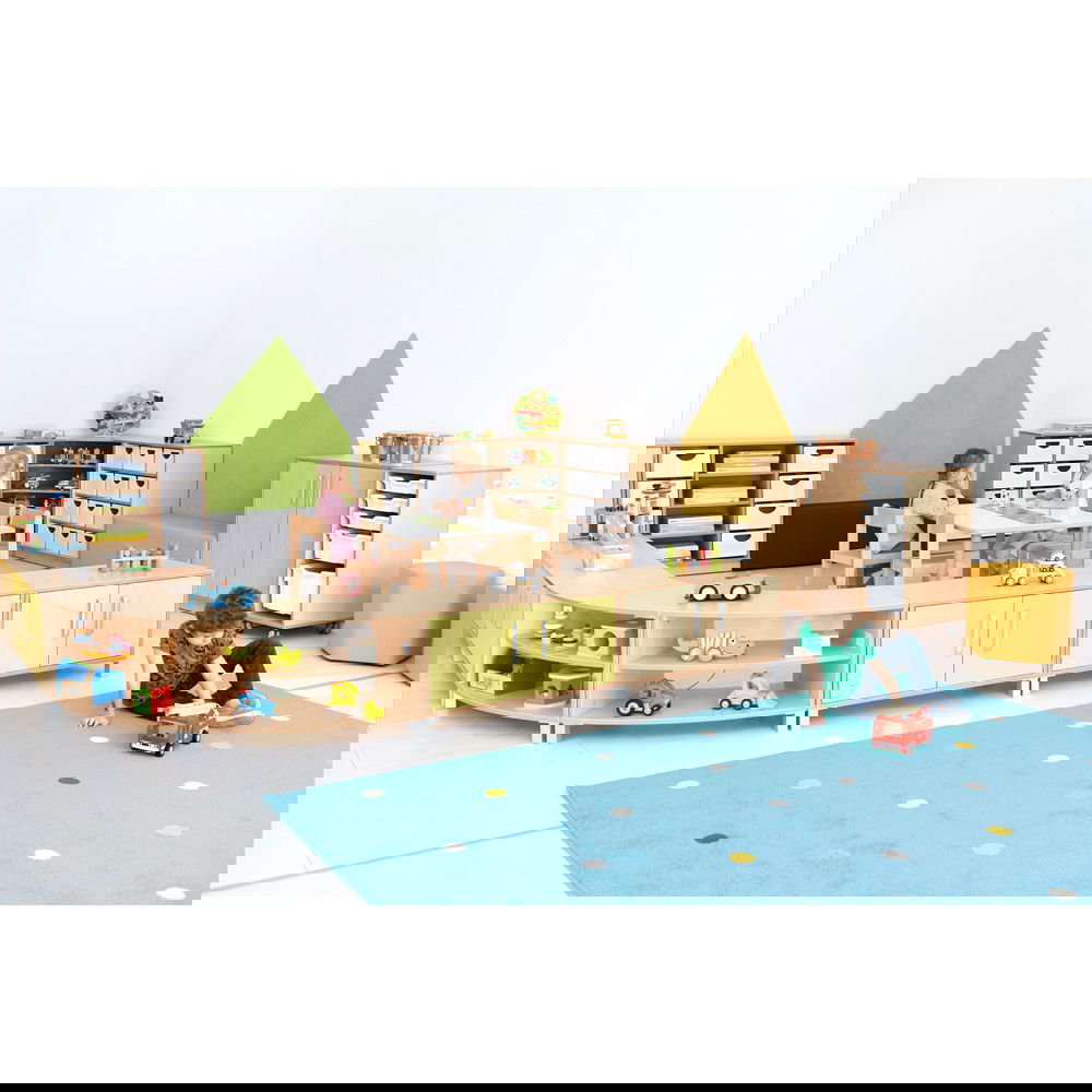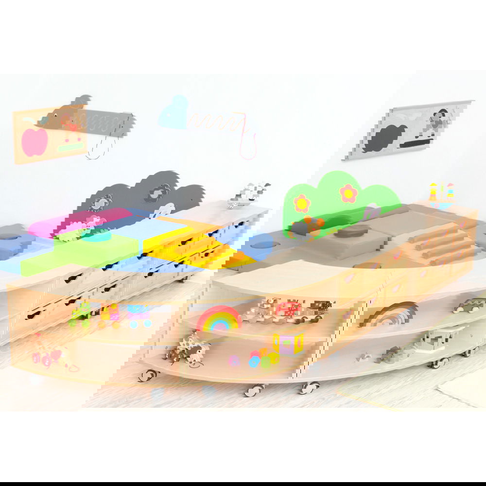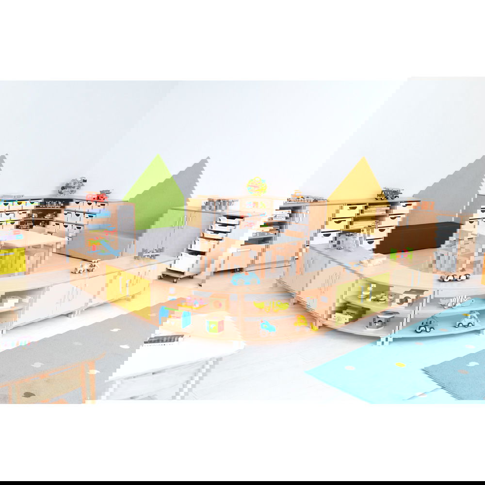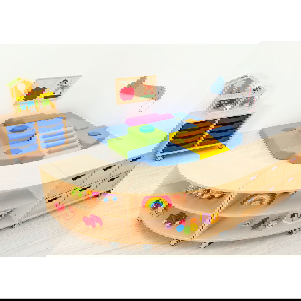 Das Prinzip ist so einfach wie genial: Ein Schrank entspricht einem Achtelkreis. Kombinieren Sie mehrere Elemente, um Wellenformen oder Kreise zu bilden. Dies fördert nicht nur die Kreativität bei der Einrichtung, sondern ermöglicht auch eine schnelle Anpassung des Raumes an neue Spielsituationen. - Wahlweise mobil oder standfest