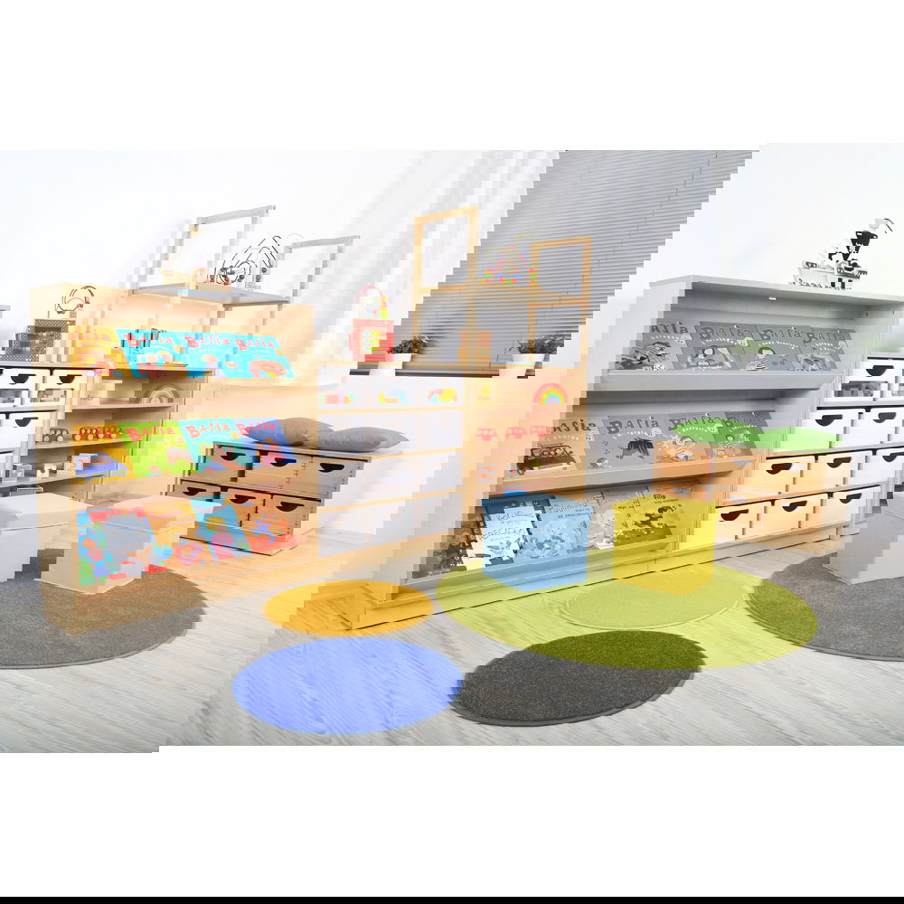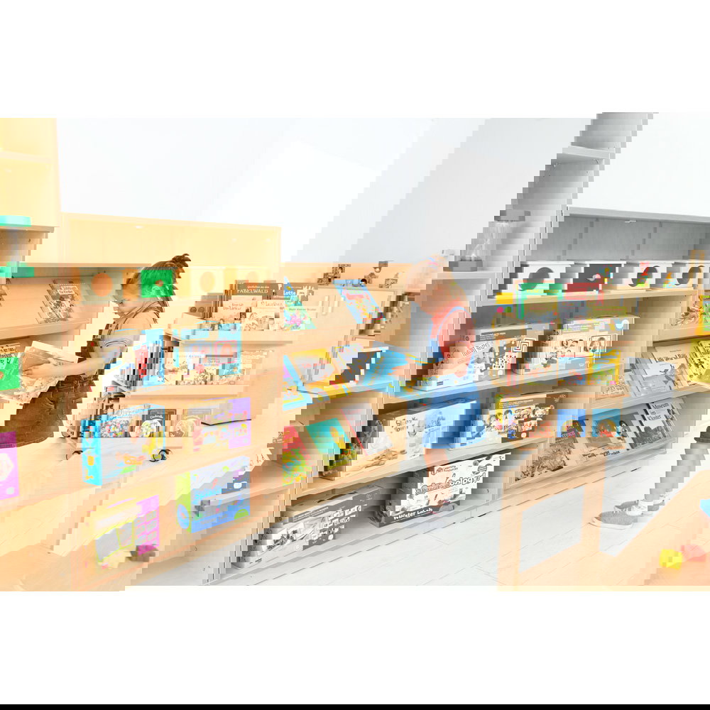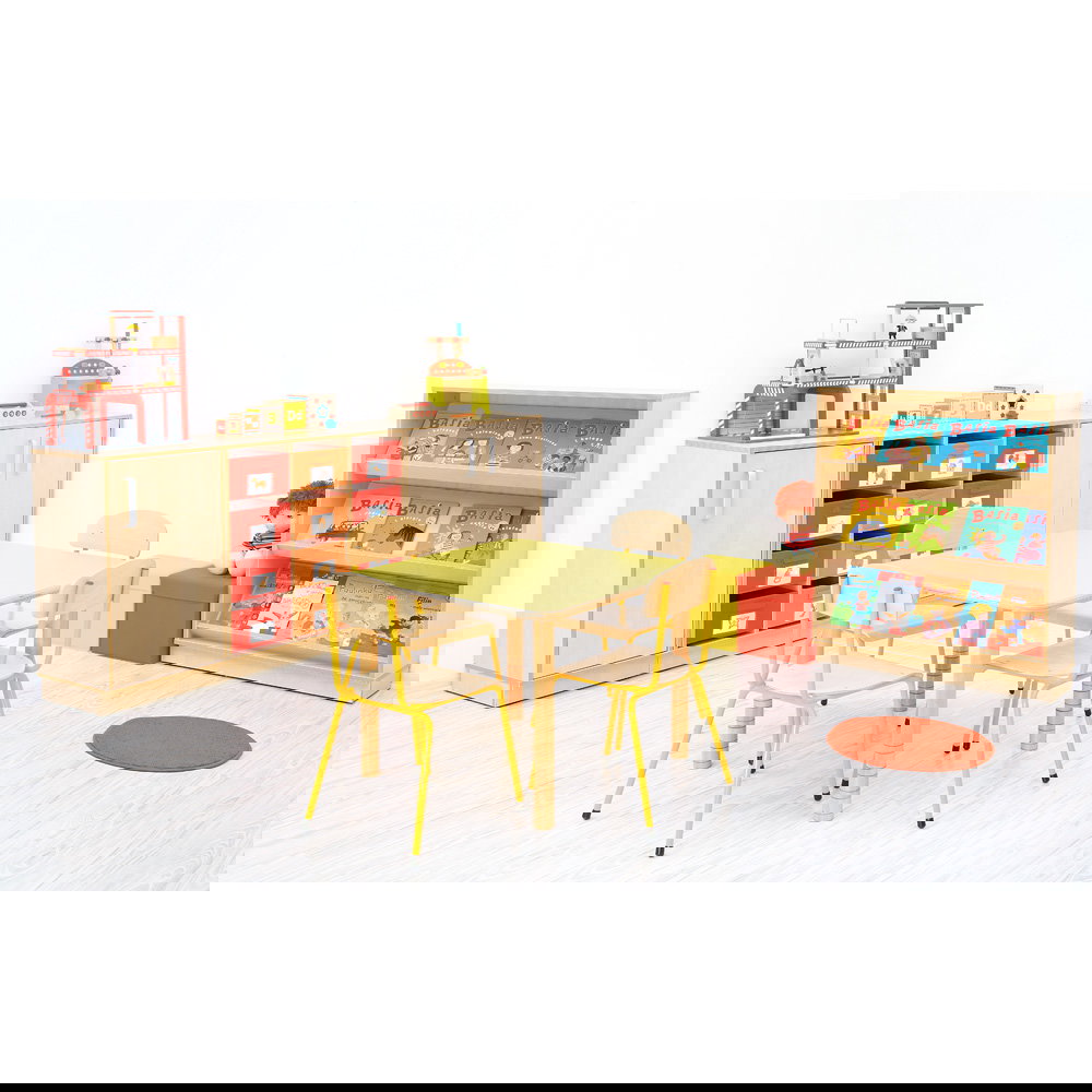 Die offene und übersichtliche Gestaltung macht es Kindern leicht, Bücher selbst auszuwählen und wieder an ihren Platz zu legen. Die erhöhten Kanten der Böden verhindern dabei, dass die Bücher nach vorne herausrutschen.