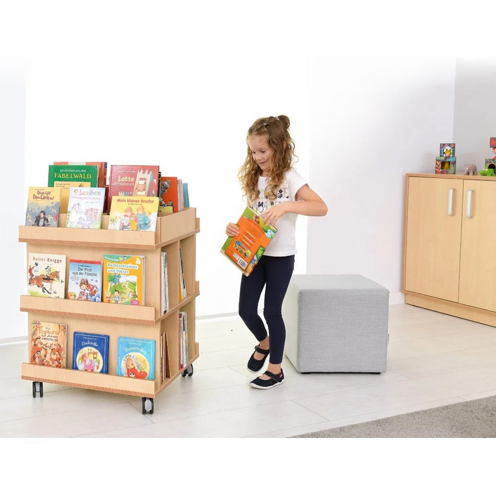 Dieses Regal nutzt seine quadratische Grundfläche optimal aus. Es bietet eine einzigartige Kombination aus verschiedenen Aufbewahrungsmöglichkeiten: Zwei Seiten sind mit tiefen Fächern ausgestattet, ideal für das stehende Aufbewahren von Ordnern, Spielen oder größeren Büchern. Die anderen beiden Seiten verfügen über schmale Ablagen, die sich perfekt eignen, um Bücher mit dem Cover nach vorne zu präsentieren. Das weckt die Neugier der Kinder und lädt zum Stöbern ein. - Struktur und Übersicht auf einen Blick