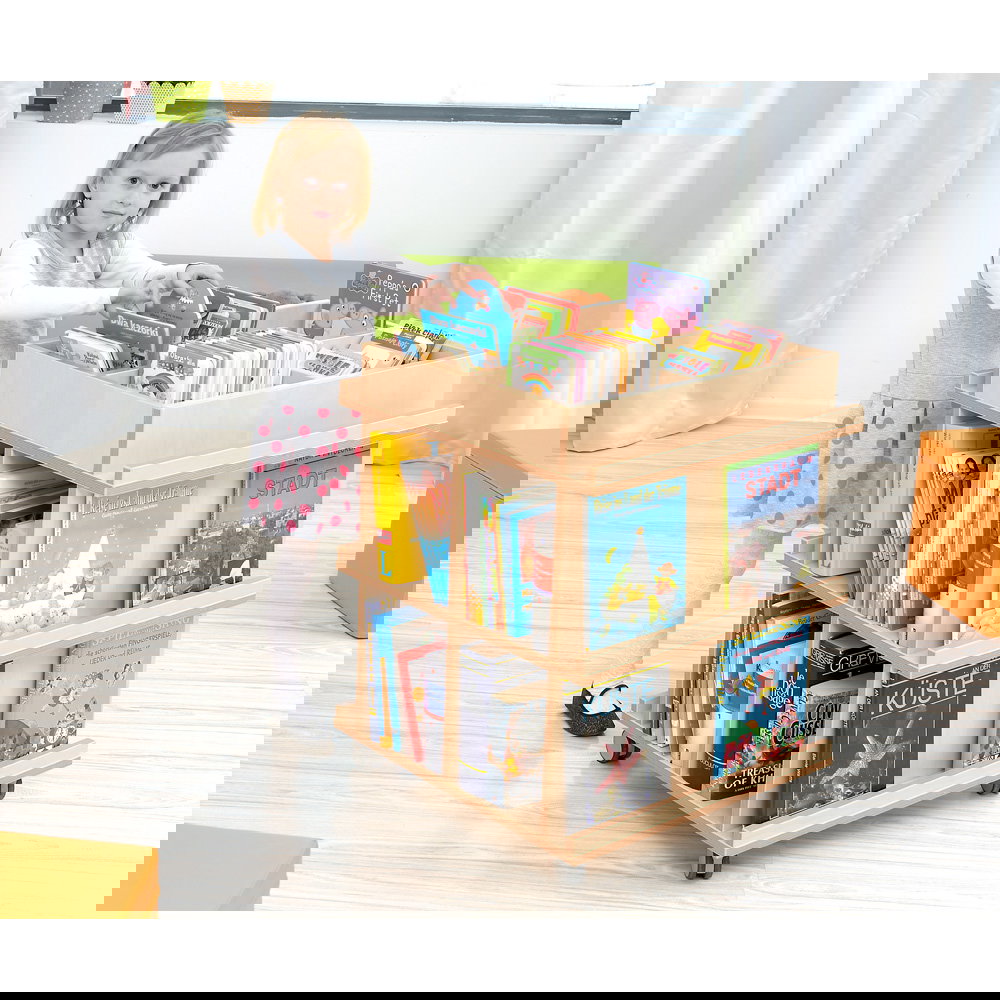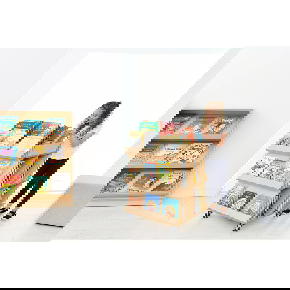 Dieses Regal nutzt seine quadratische Grundfläche optimal aus. Es bietet eine einzigartige Kombination aus verschiedenen Aufbewahrungsmöglichkeiten: Zwei Seiten sind mit tiefen Fächern ausgestattet, ideal für das stehende Aufbewahren von Ordnern, Spielen oder größeren Büchern. Die anderen beiden Seiten verfügen über schmale Ablagen, die sich perfekt eignen, um Bücher mit dem Cover nach vorne zu präsentieren. Das weckt die Neugier der Kinder und lädt zum Stöbern ein. - Struktur und Übersicht auf einen Blick