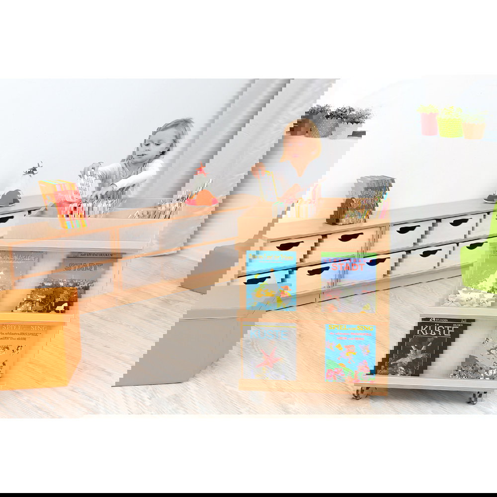 Dank der vielseitigen Fächer und Ablagen lassen sich Materialien thematisch sortieren und übersichtlich anordnen. Die oberen, kleineren Fächer eignen sich hervorragend für Stifte, Bastelmaterial oder kleine Spiele. Kinder können selbstständig auf die Materialien zugreifen und lernen dabei, Ordnung zu halten. Alles hat seinen festen Platz und ist schnell wiedergefunden. - Robust und langlebig für den intensiven Gebrauch