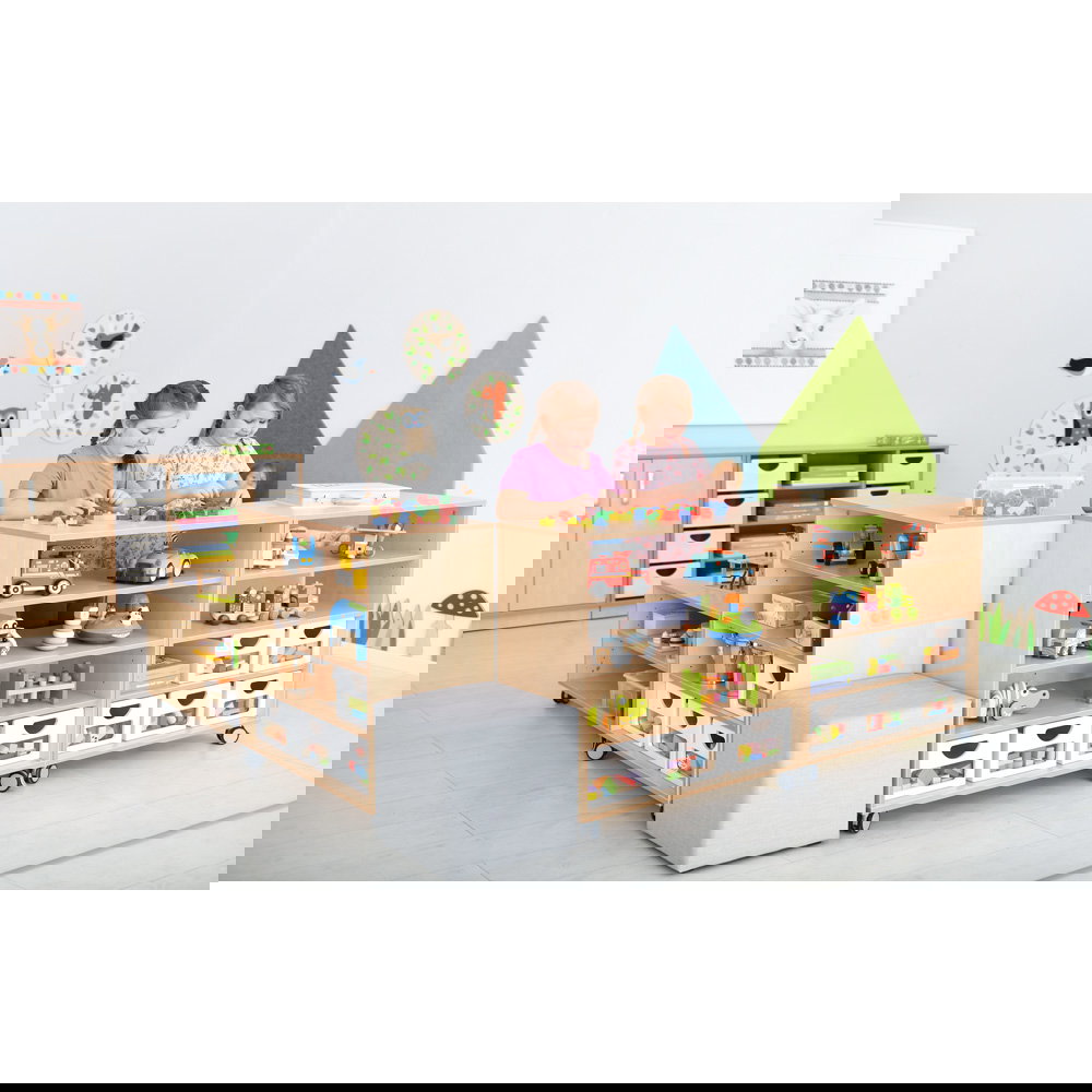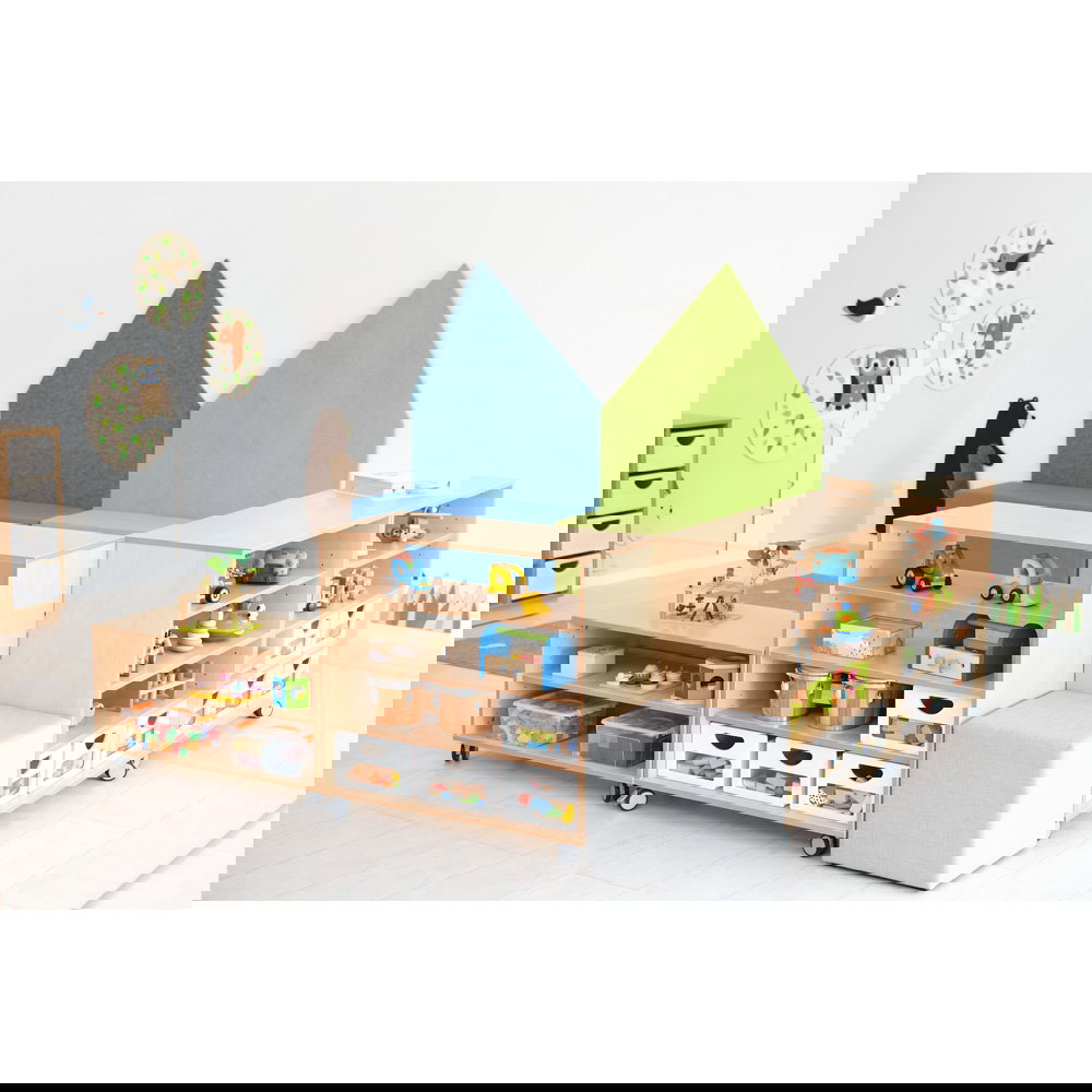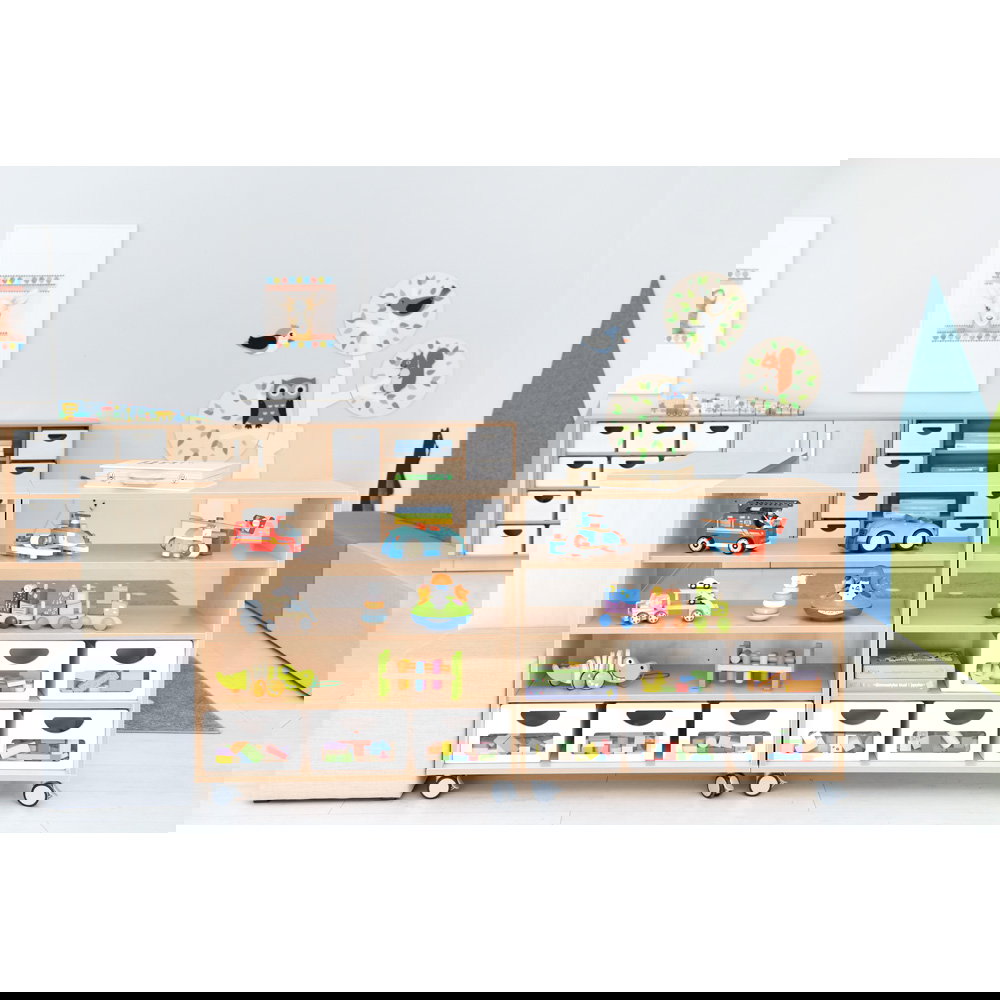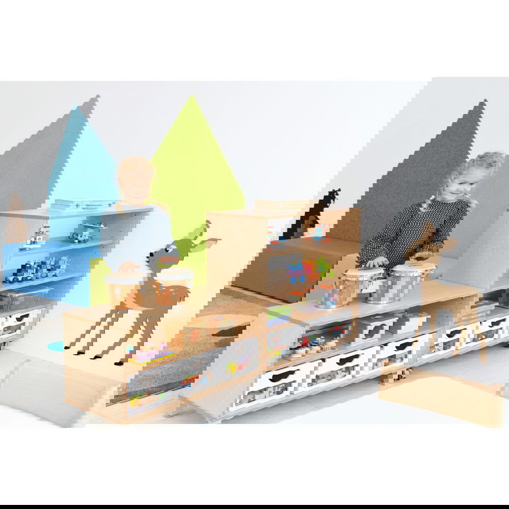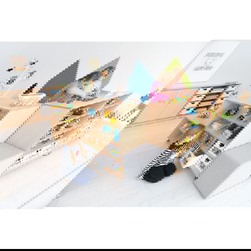 Da das Regal von beiden Seiten zugänglich ist, fördert es die Interaktion und Flexibilität. Materialien können von zwei Seiten entnommen oder hineingestellt werden, was besonders in der Mitte des Raumes oder zwischen zwei Spielbereichen von großem Vorteil ist. - Vielseitige Varianten