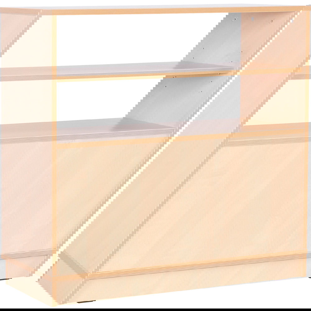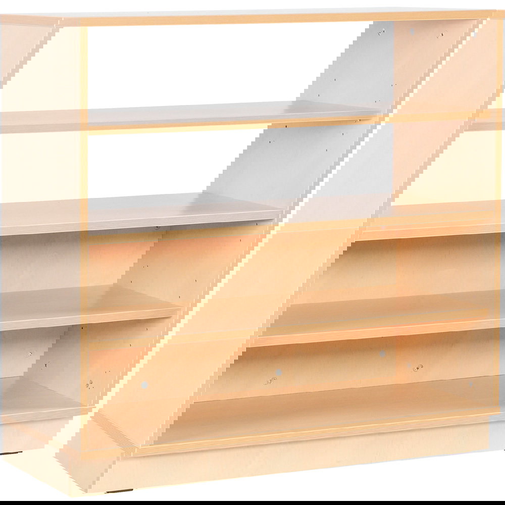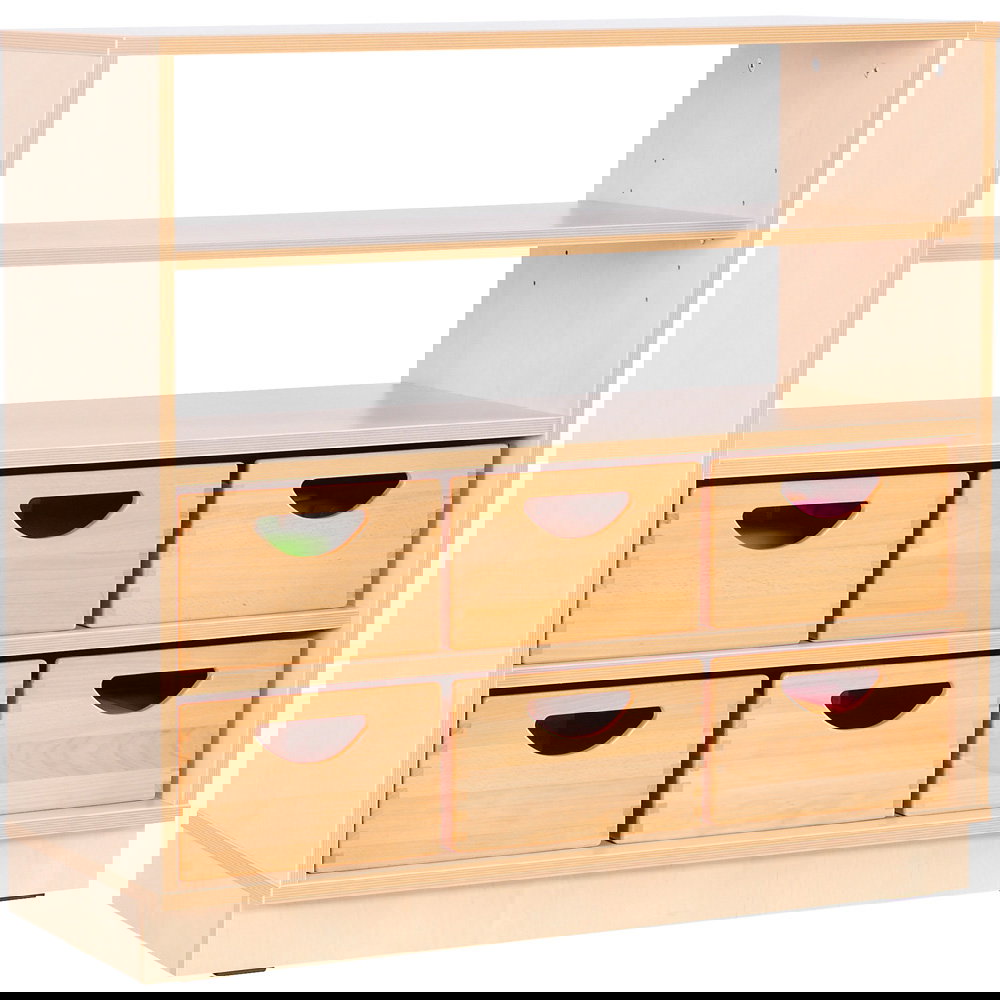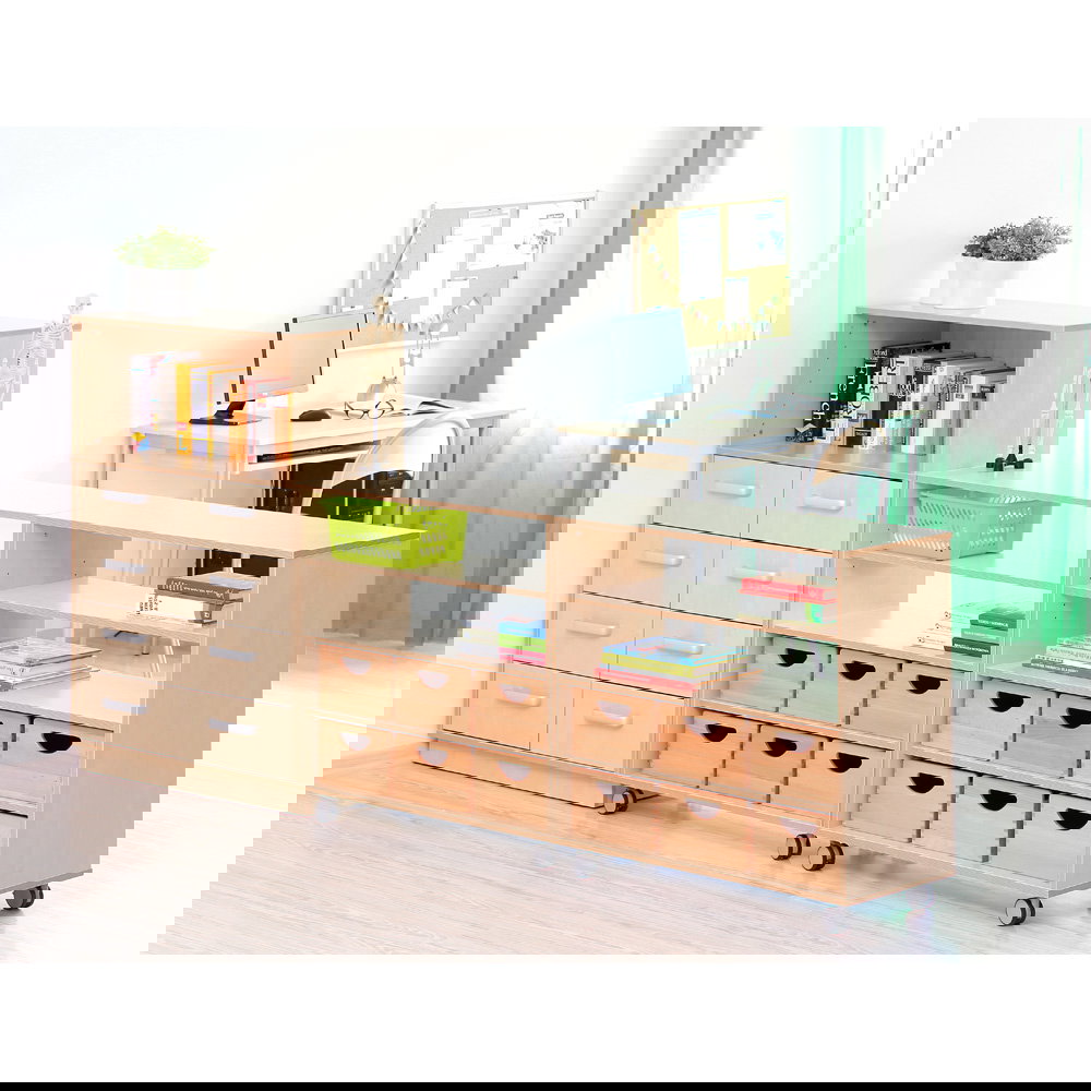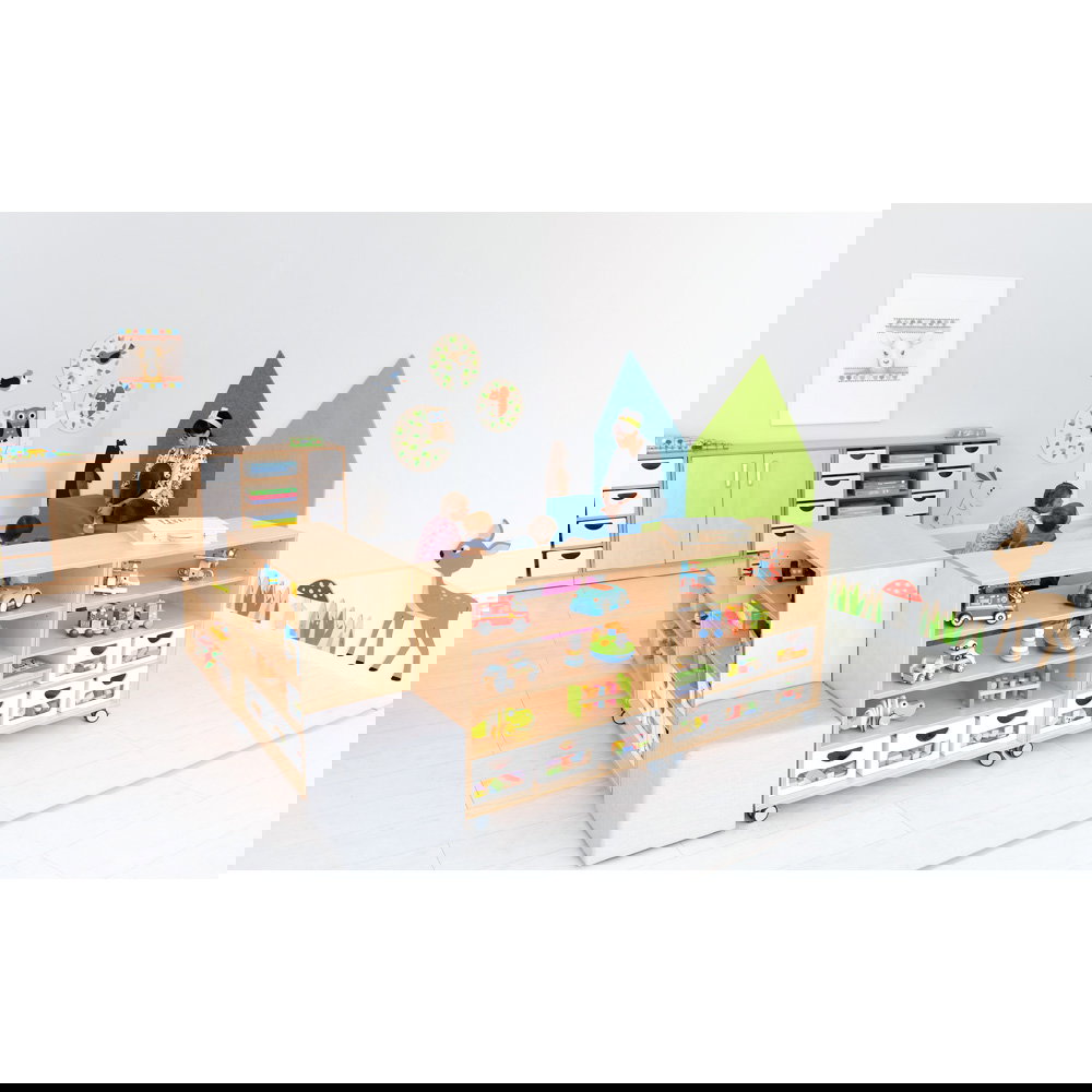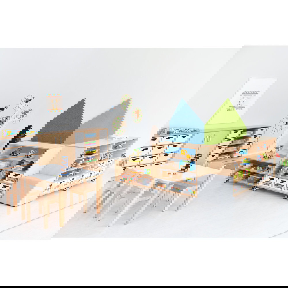 Da das Regal von beiden Seiten zugänglich ist, fördert es die Interaktion und Flexibilität. Materialien können von zwei Seiten entnommen oder hineingestellt werden, was besonders in der Mitte des Raumes oder zwischen zwei Spielbereichen von großem Vorteil ist. - Vielseitige Varianten