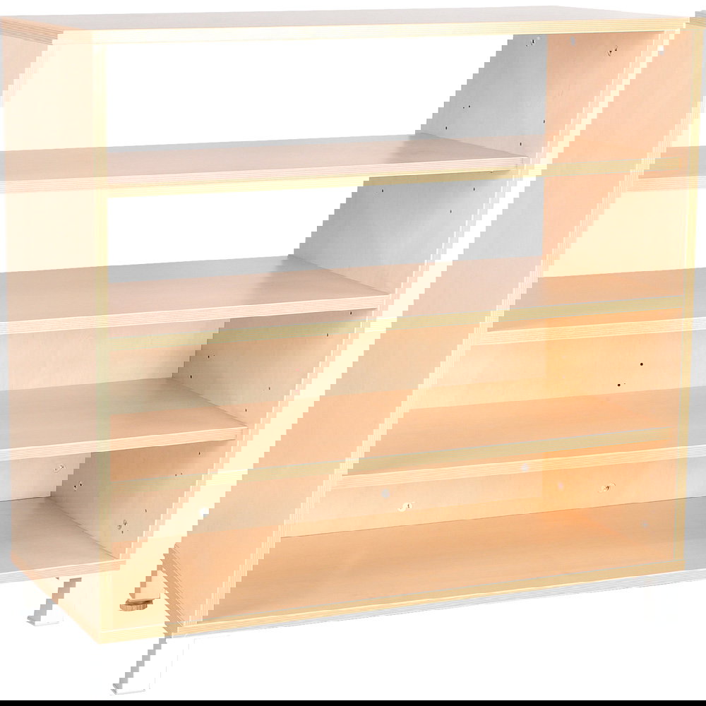 Mit seiner mittleren Höhe von 87,1 cm bietet der Schrank die perfekte Balance zwischen Stauraum und Übersichtlichkeit. Er strukturiert den Raum in verschiedene Zonen – etwa eine Leseecke hier und einen Baubereich dort – und bleibt dabei niedrig genug, um Erziehern jederzeit den vollen Überblick über das Geschehen zu ermöglichen. Die drei festen Fachböden unterteilen den Korpus in vier großzügige Ebenen, die viel Platz für Bücher, Spielmaterialien oder Exponate bieten. Durch das offene Design fällt Licht hindurch, was für eine helle und freundliche Atmosphäre sorgt. Egal ob auf festem Sockel, luftigen Beinen oder mobilen Rollen – dieser Schrank bringt Dynamik in jeden Raum.