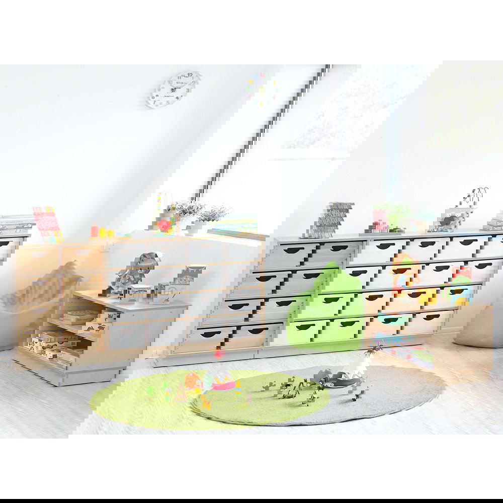 Gefertigt aus 18 mm starker, laminierter Spanplatte mit stoßfesten, 2 mm starken ABS-Kanten in Multiplex-Optik, ist dieser Schrank für die hohe Beanspruchung im Alltag von Kitas und Schulen bestens gerüstet. Die stabile Konstruktion garantiert Langlebigkeit und Sicherheit. - Idealer Raumteiler und Funktionsmöbel