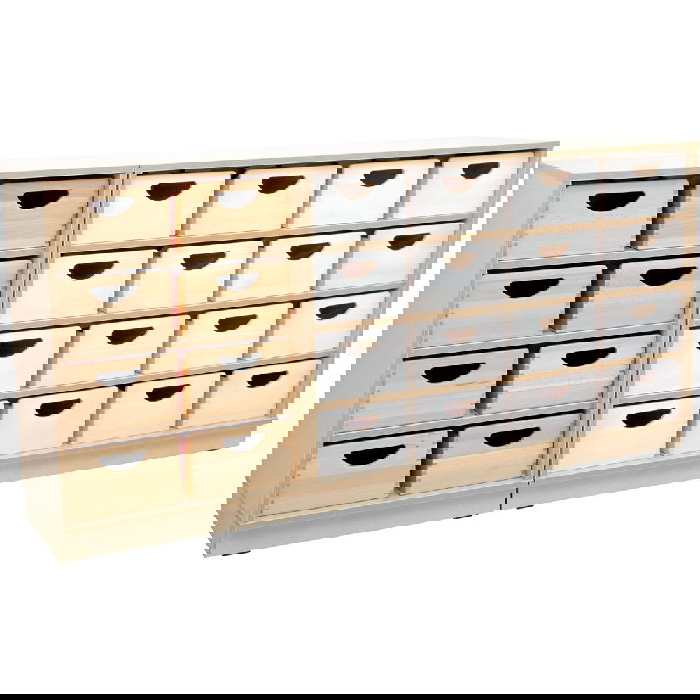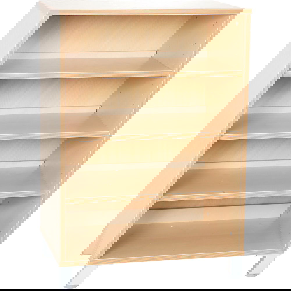 Dieser mittelhohe Schrank überzeugt durch seine Vielseitigkeit. Erhältlich in zwei Varianten – entweder klassisch auf einem geschlossenen Sockel oder modern auf stabilen Beinen – bietet er für jeden Geschmack und jede Raumanforderung die passende Lösung. Im Inneren strukturieren drei fest installierte Fachböden den Stauraum in vier gleichmäßig hohe Fächer (ca. 17 cm). Diese Aufteilung ist perfekt dimensioniert für Bücher, Ordner oder Spielzeug. Besonders praktisch: Die Fächer sind so konzipiert, dass sie optional bis zu 8 passgenaue Holzbehälter (separat erhältlich) aufnehmen können. So verwandeln Sie das offene Regal im Handumdrehen in ein geschlossenes Schubladensystem für Kleinteile.