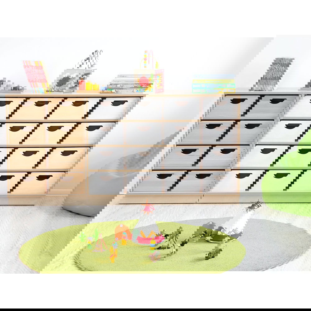 Gefertigt aus 18 mm starker, laminierter Spanplatte ist der Korpus extrem widerstandsfähig. Die 2 mm starken ABS-Kanten in Multiplex-Optik schützen die Ränder effektiv vor Stößen und Abnutzung – ein entscheidender Faktor für die Langlebigkeit in Kitas und Schulen. - Hygienisch und pflegeleicht