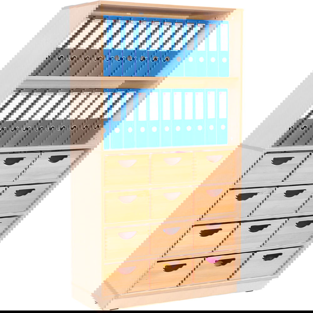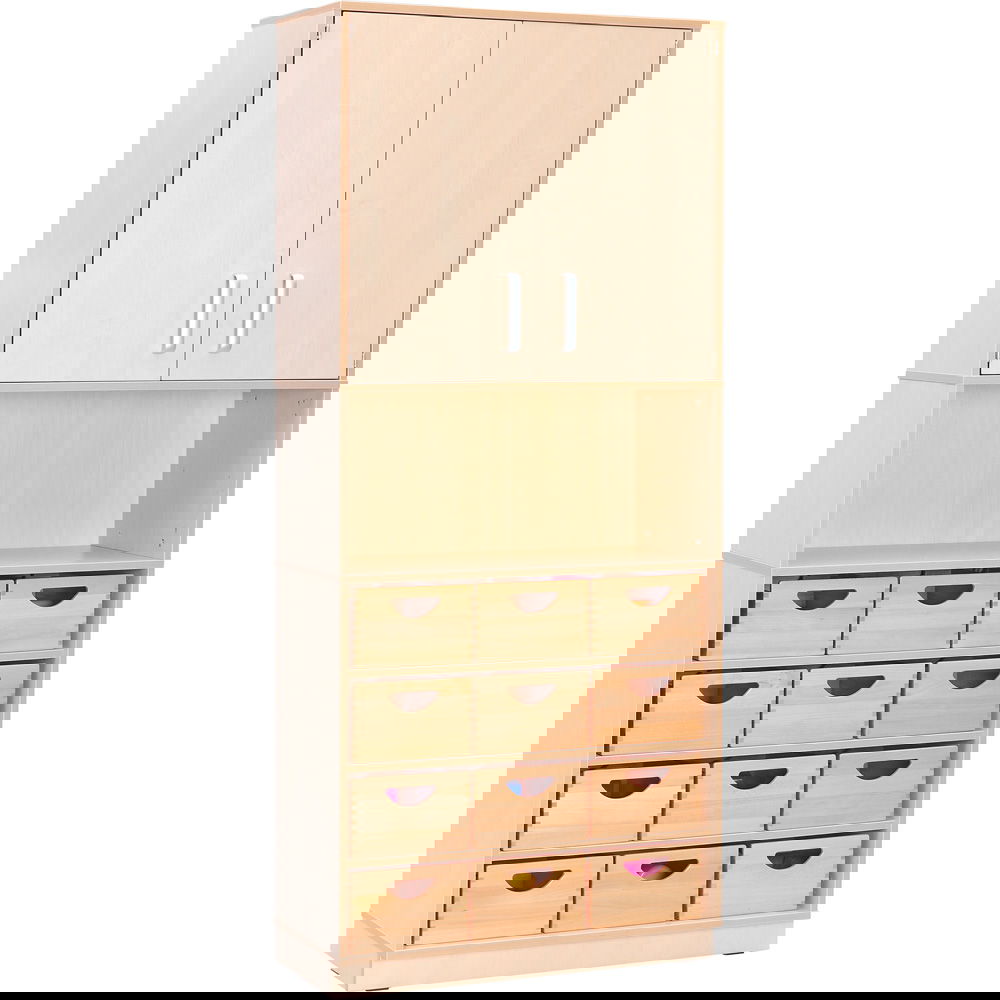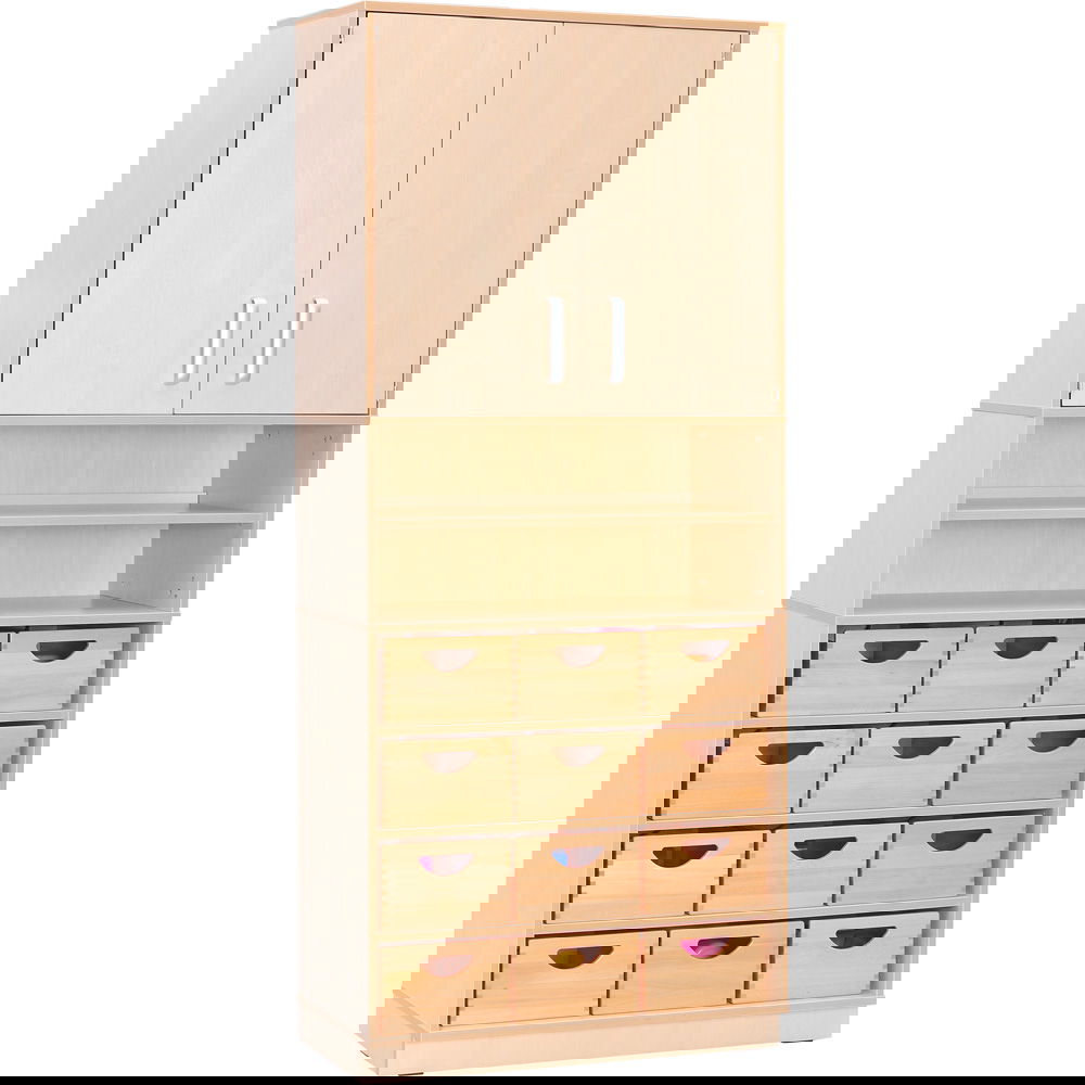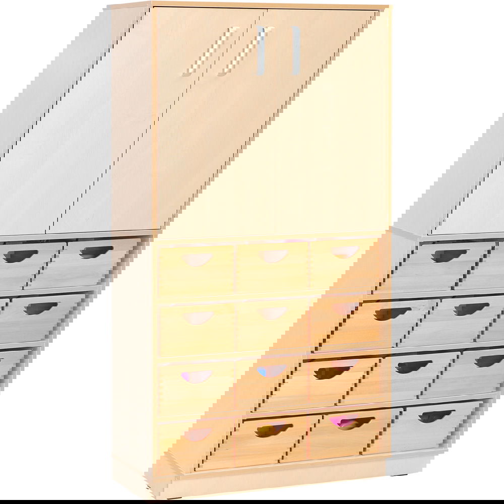 Gefertigt aus einer 18 mm starken, laminierten Spanplatte in freundlichem Birke-Dekor und geschützt durch stoßfeste ABS-Kanten, ist dieser Schrank für die intensive Nutzung im pädagogischen Umfeld konzipiert.