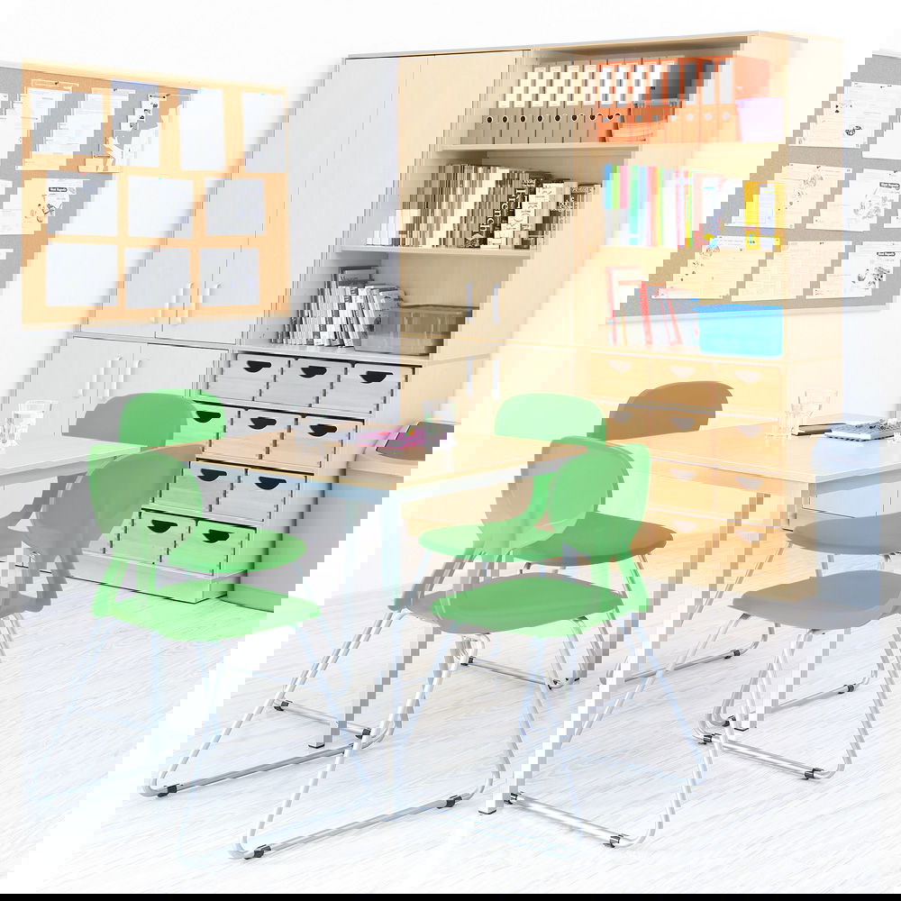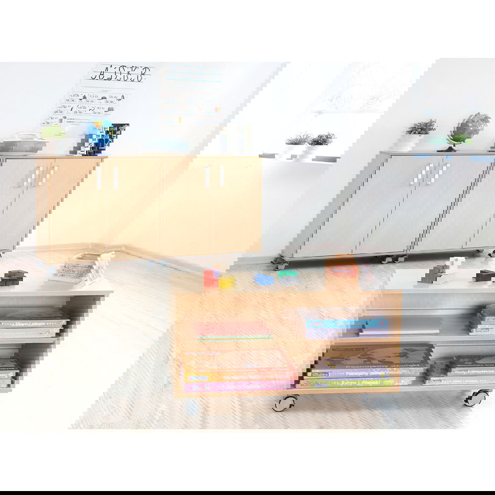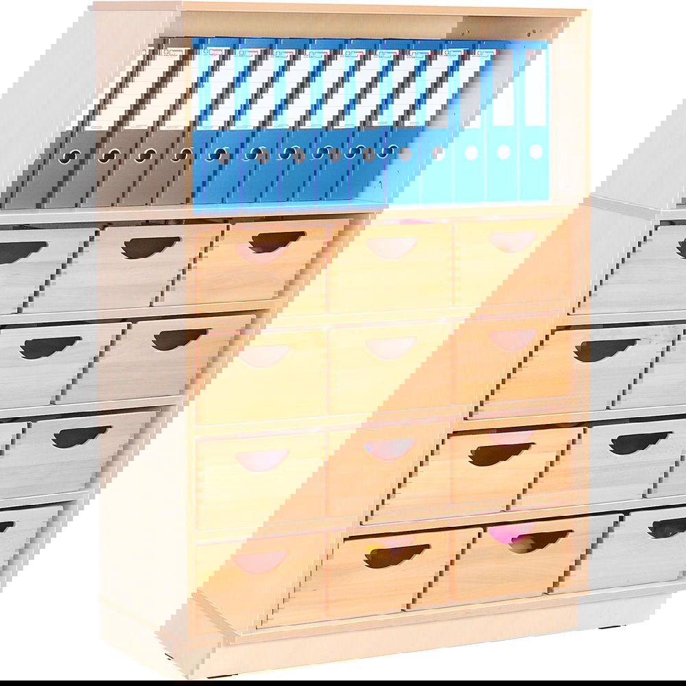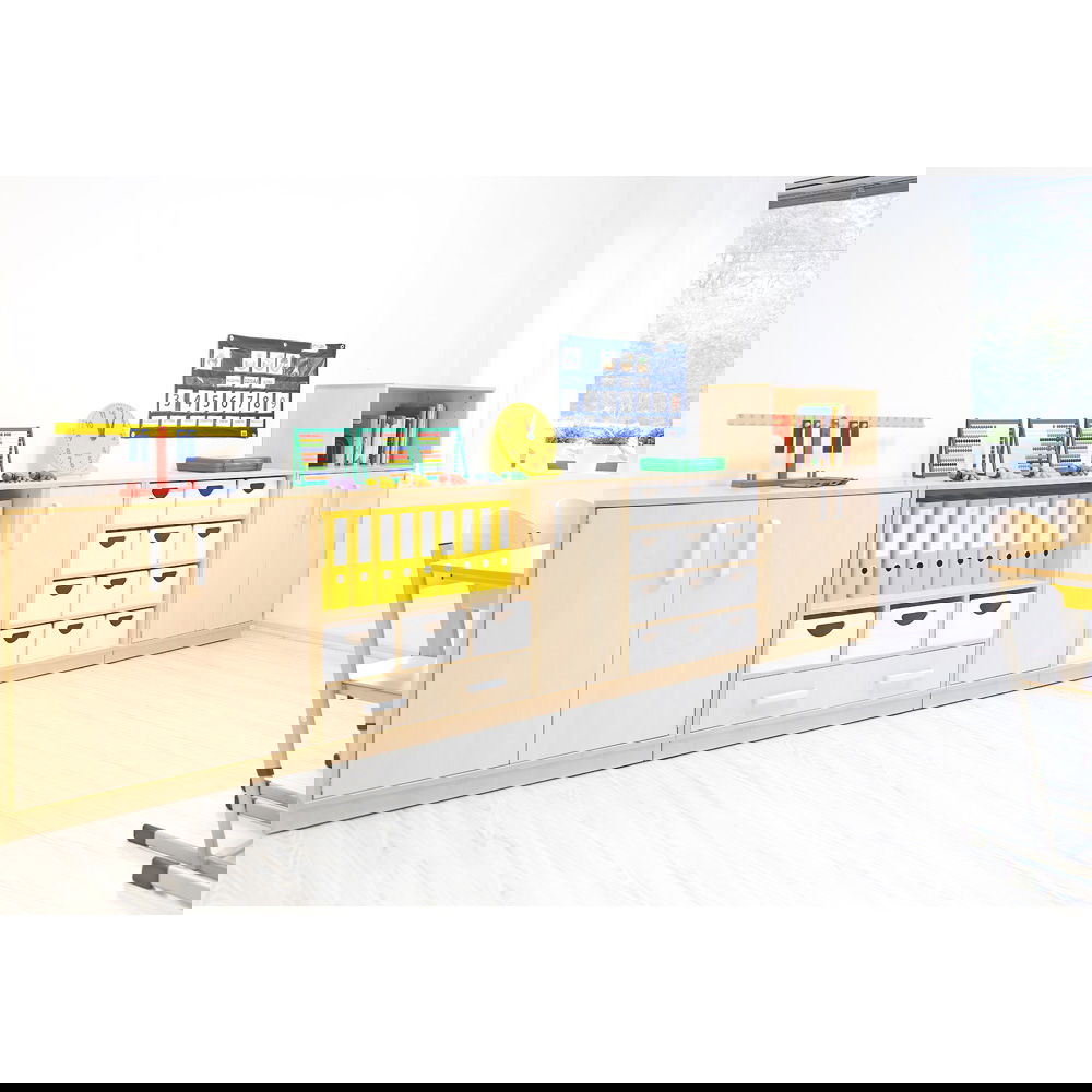 Gefertigt aus einer 18 mm starken, laminierten Spanplatte in freundlichem Birke-Dekor und geschützt durch stoßfeste ABS-Kanten, ist dieser Schrank für die intensive Nutzung im pädagogischen Umfeld konzipiert.