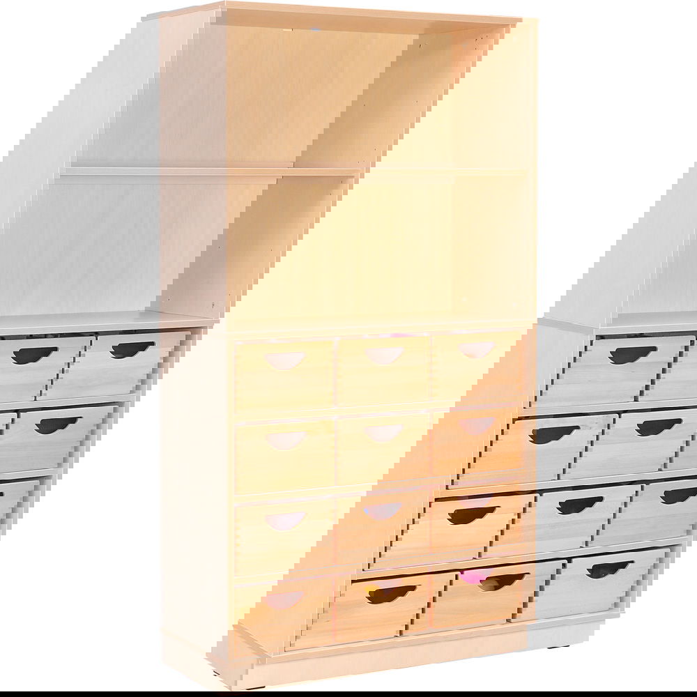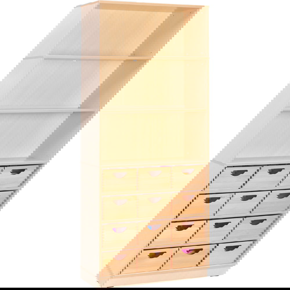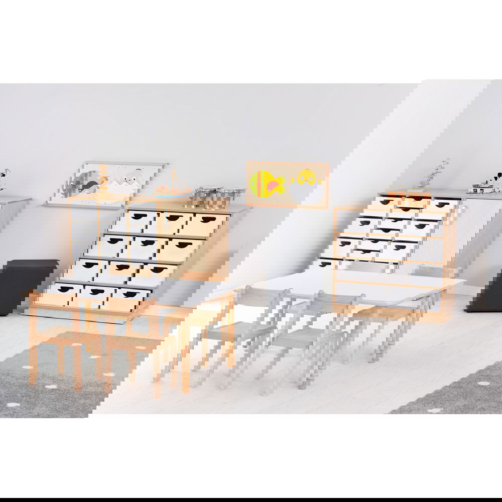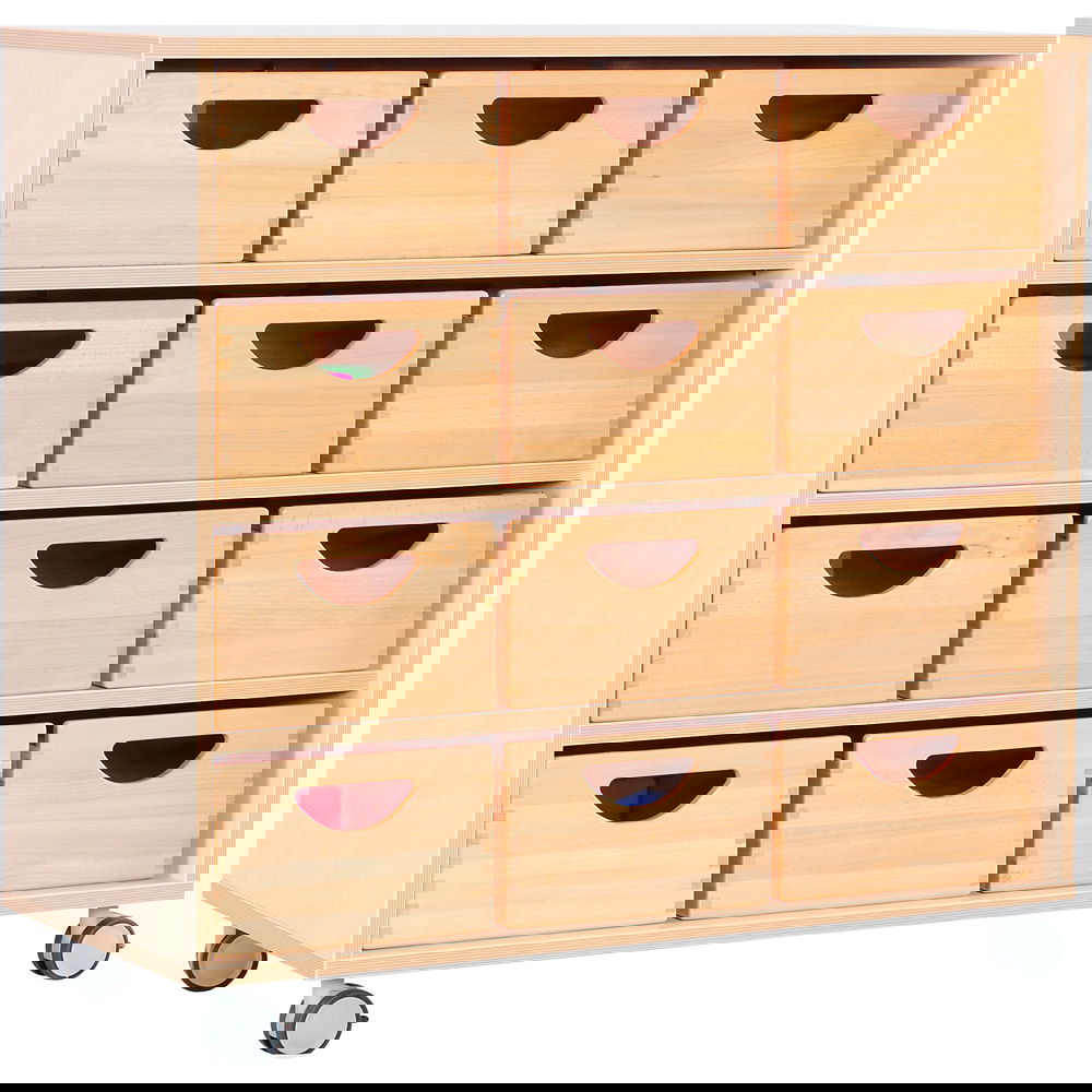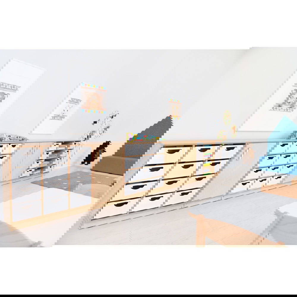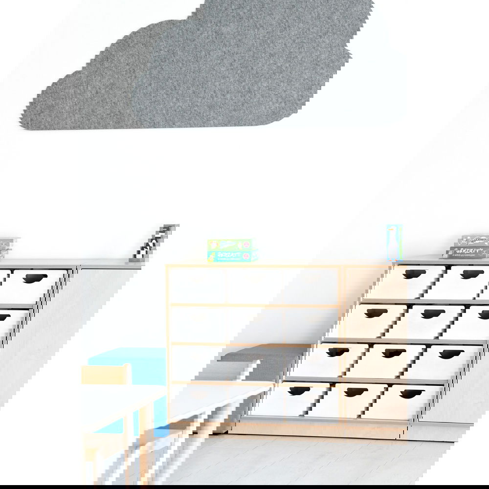 Der Schrank M (Höhe 87,1 cm) ist ein wahres Kapazitätswunder. Die drei durchgehenden Fachböden schaffen vier geräumige Fächer, die sich ideal für Ordner, große Spielkisten oder Bastelmaterialien eignen. Alternativ können hier bis zu 12 der separat erhältlichen Holzbehälter untergebracht werden, um ein fein sortiertes Ordnungssystem zu schaffen. Das Beste daran: Sie entscheiden über das Aussehen. Beginnen Sie mit der offenen, einladenden Regal-Optik und rüsten Sie später mit farbigen Türen nach. Wählen Sie zudem zwischen dem stabilen Sockel, leichten Beinen oder praktischen Rollen, um den Schrank perfekt an Ihre Bedürfnisse anzupassen.