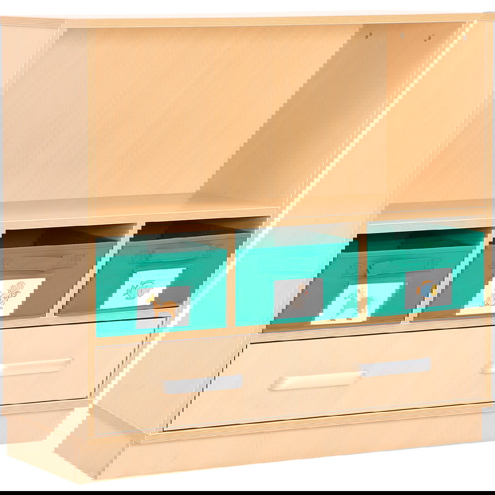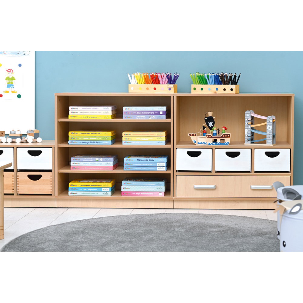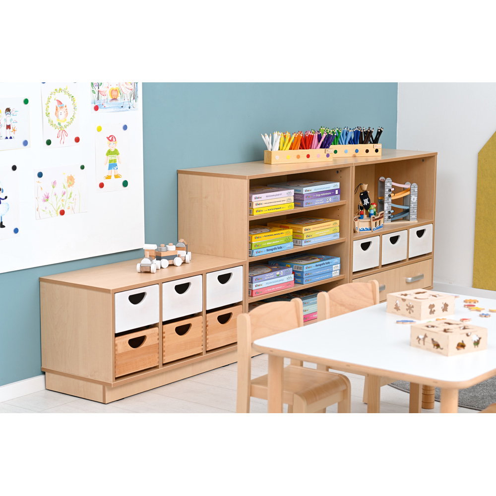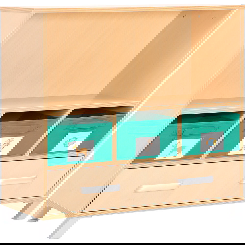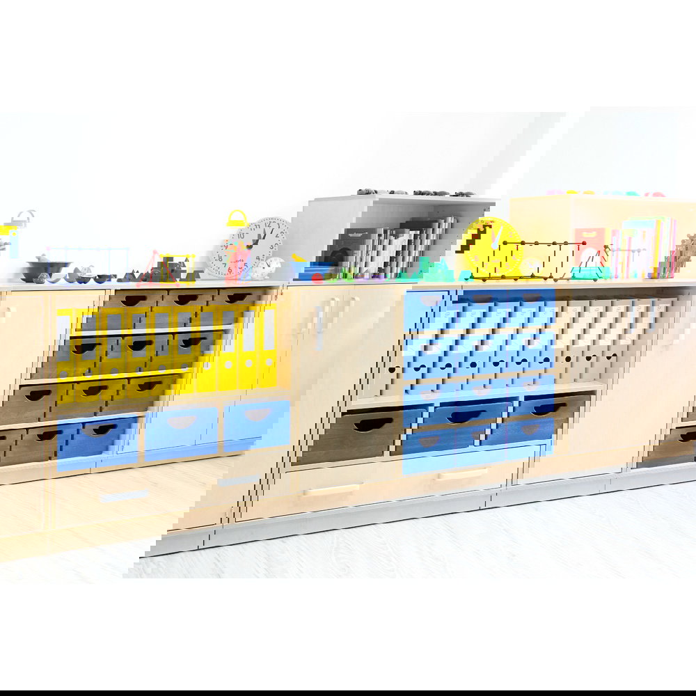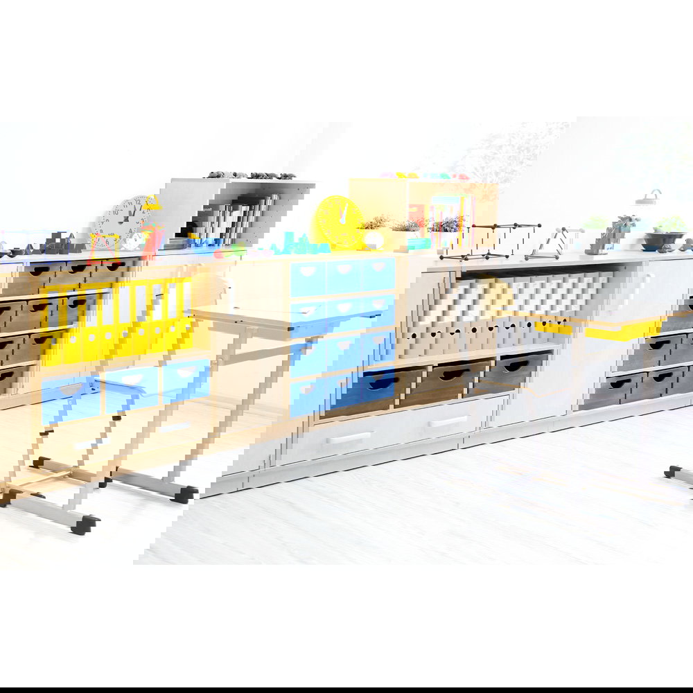 Als Teil der vielseitigen Flexi-Kollektion verbindet dieser Schrank Funktionalität mit einer warmen, einladenden Ästhetik im Birke-Dekor. Er ist nicht nur ein Stauraummöbel, sondern ein echtes Arbeitsinstrument. Die Kombination aus einem hohen Fach für stehende Ordner und einer breiten Schublade für flaches Papier macht ihn zum idealen Begleiter neben dem Schreibtisch, im Kunstraum oder als zentrale Verwaltungsstation im Gruppenraum. Ob auf einem stabilen Sockel für eine geschlossene Optik oder auf Beinen für mehr Leichtigkeit – dieser Schrank bringt professionelle Ordnung in den pädagogischen Alltag.