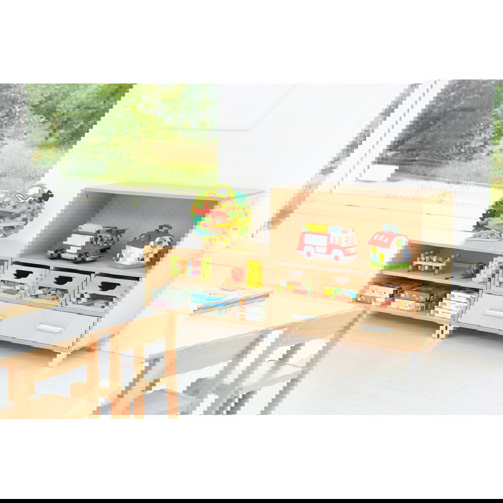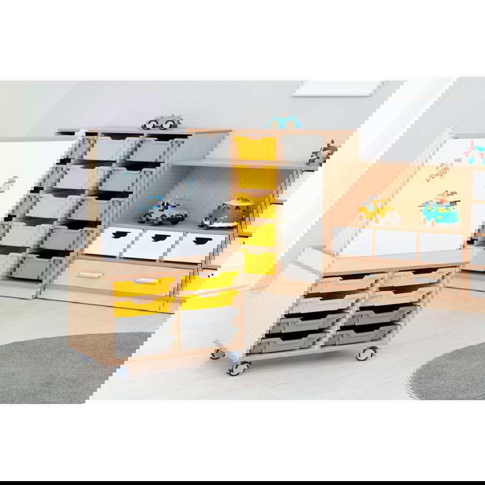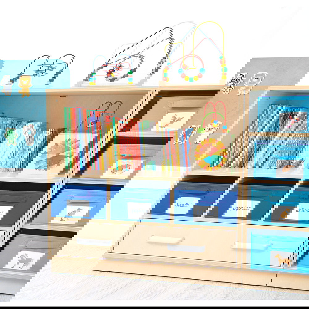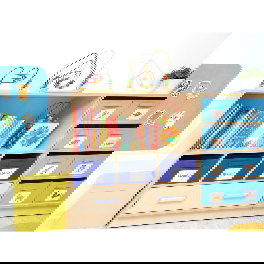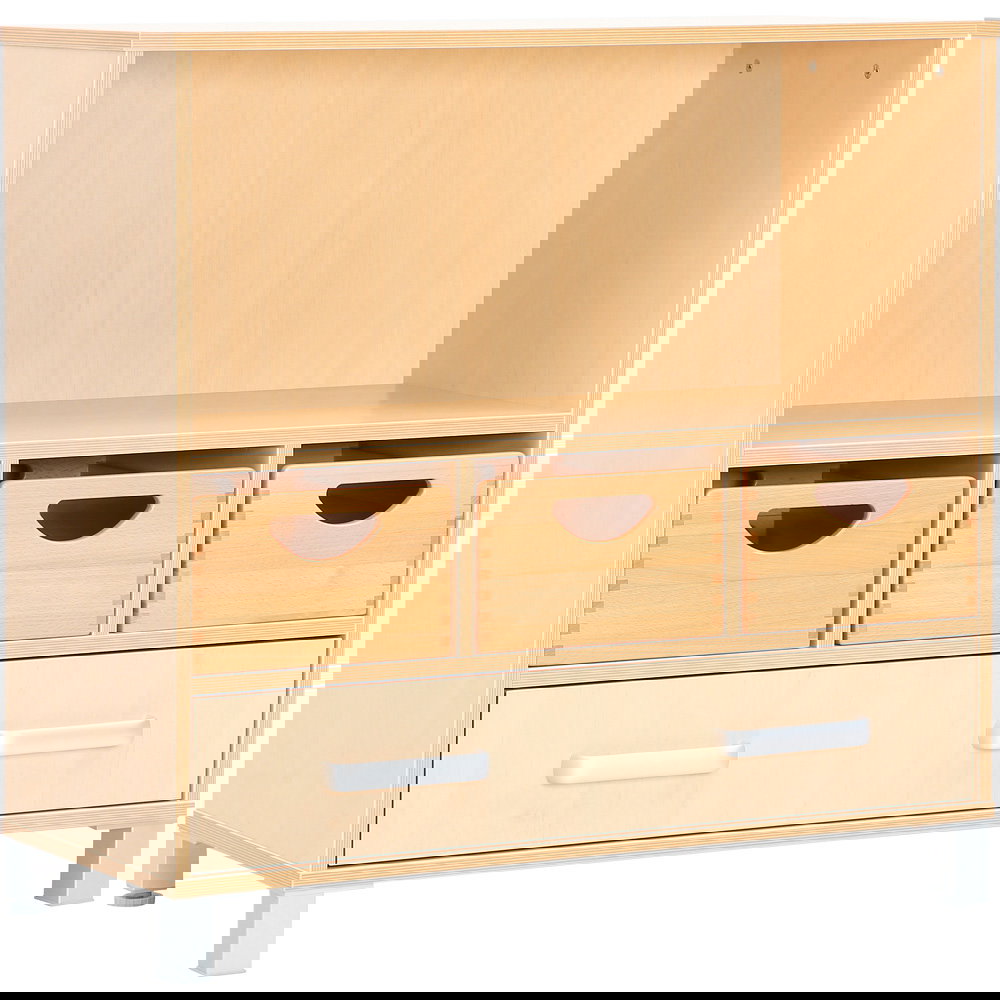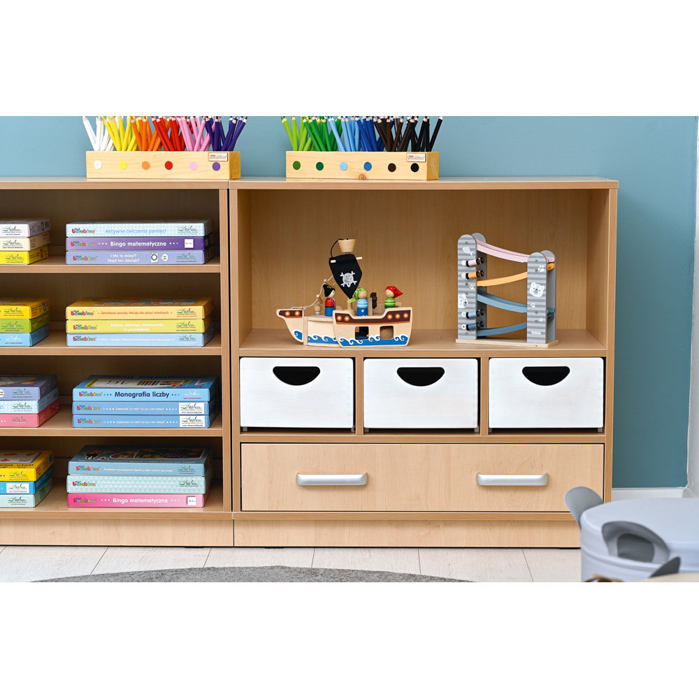 Als Teil der vielseitigen Flexi-Kollektion verbindet dieser Schrank Funktionalität mit einer warmen, einladenden Ästhetik im Birke-Dekor. Er ist nicht nur ein Stauraummöbel, sondern ein echtes Arbeitsinstrument. Die Kombination aus einem hohen Fach für stehende Ordner und einer breiten Schublade für flaches Papier macht ihn zum idealen Begleiter neben dem Schreibtisch, im Kunstraum oder als zentrale Verwaltungsstation im Gruppenraum. Ob auf einem stabilen Sockel für eine geschlossene Optik oder auf Beinen für mehr Leichtigkeit – dieser Schrank bringt professionelle Ordnung in den pädagogischen Alltag.