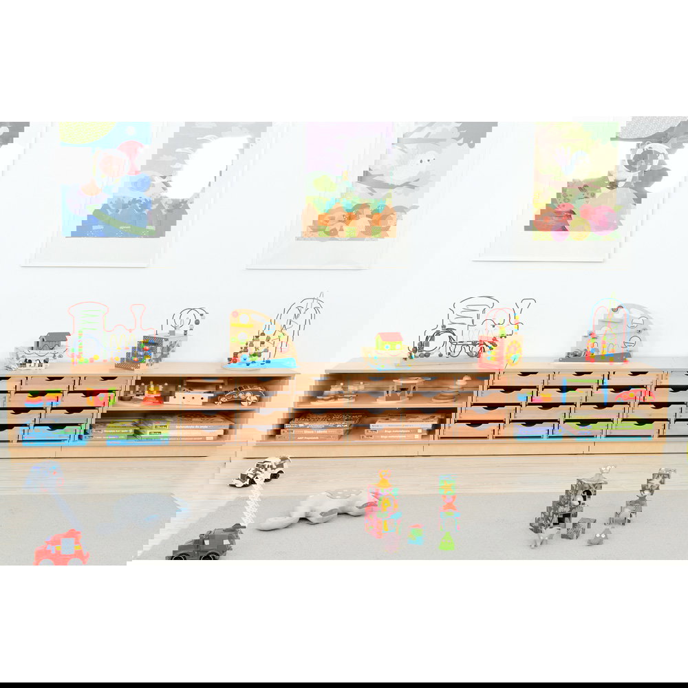 Die niedrige Bauhöhe von 48,4 cm ist bewusst auf die Bedürfnisse von Kindern ausgelegt. Sie können die breite Oberseite als riesige Bau- und Spiellandschaft nutzen und alle Materialien in den Fächern selbstständig erreichen. Das fördert die Autonomie und macht das Aufräumen zu einem einfachen, erlernbaren Prozess.