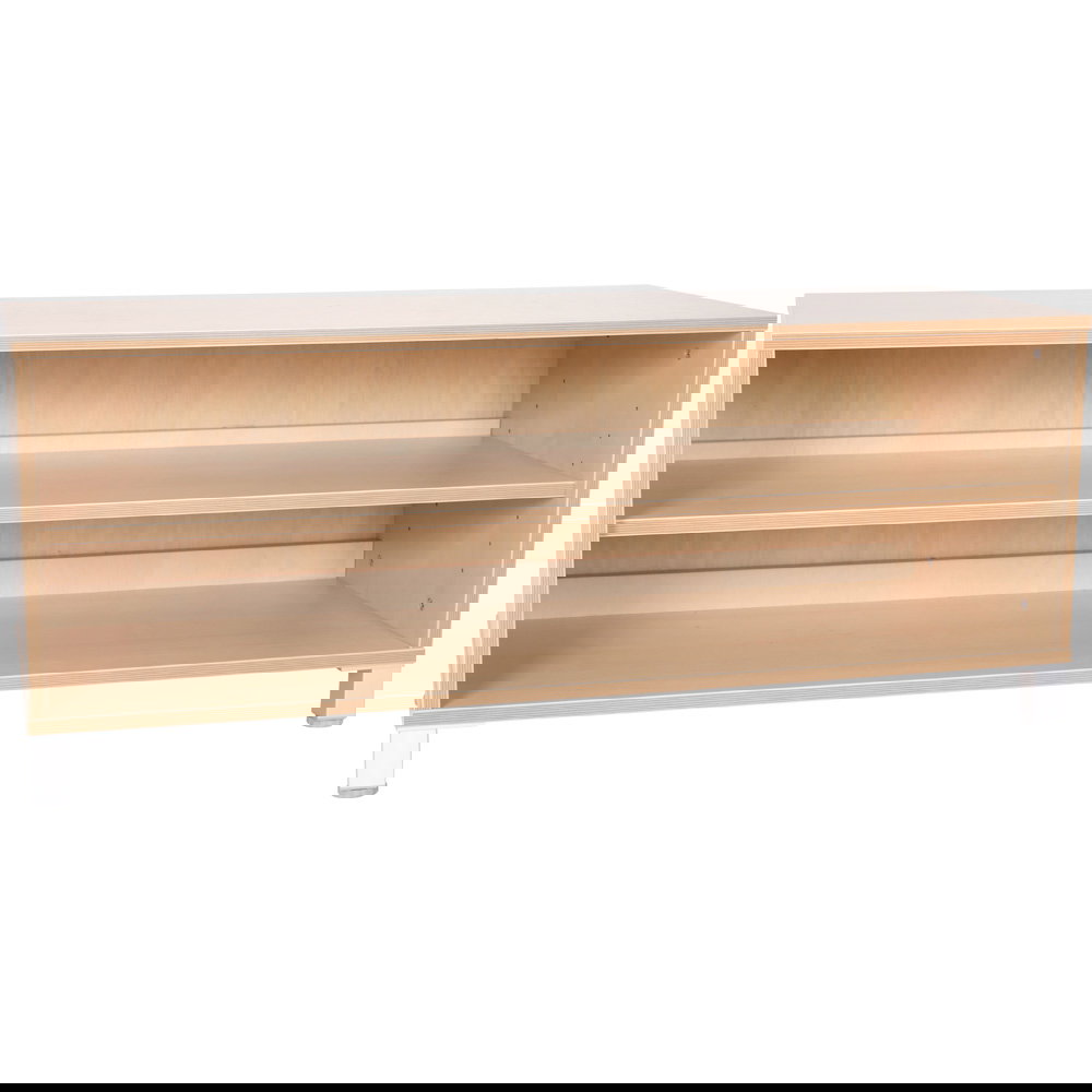 Flexi Schrank S (B 118 cm) in Birke-Optik. Extrabreiter, niedriger Stauraum für die Kita. Ideal für 8 Holzbehälter. Wahlweise auf Sockel oder Beinen. Robust.