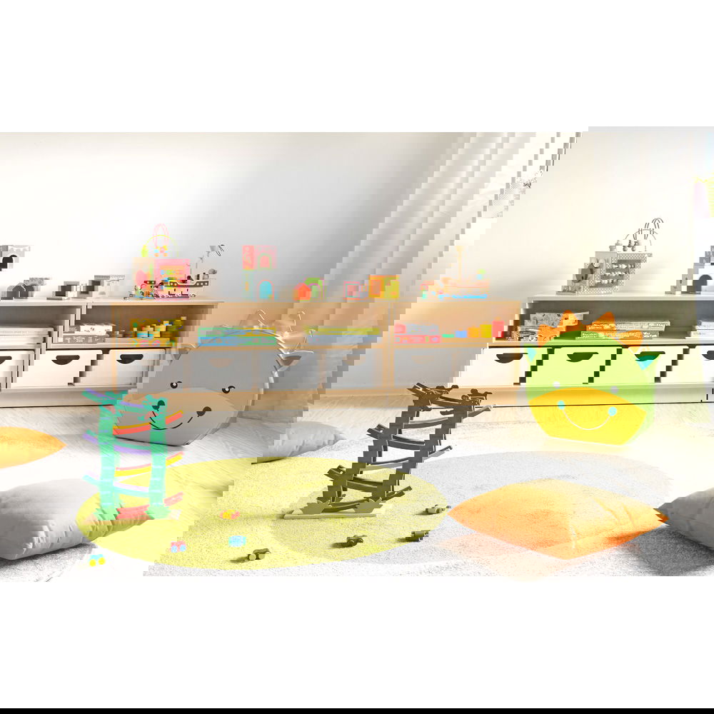 Die niedrige Höhe von 48,4 cm ist ideal für Kinder. Sie können die obere Ablage als Spielfläche nutzen und selbstständig auf die in den Fächern gelagerten Materialien zugreifen. Das fördert die Autonomie und Ordnungsliebe.