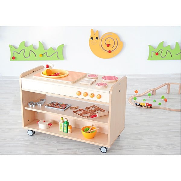 Passend zum Regal 099150, 099163 und 092748 (separat bestellbar); einfach mit Schrauben am Regal zu befestigen. Küchenplatte mit nachgebildeten Kochplatten, Reglern; Spülbecken mit imitiertem Wasserhahn.
