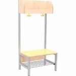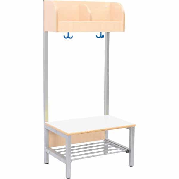 Garderobe für 2 Kinder; mit Sitzbank aus farbigem HPL-laminiertem Sperrholz (Stärke: 19 mm) und Ablage mit Fächern aus laminierter Spanplatte (Stärke: 18 mm) in Birke-Optik mit ABS-Kante in Multiplex-Optik; mit stabilem, funktionellem Metallgestell; Schuhablage mit Gitterrost; Querleiste zum Anbringen von Namens- oder Symbolschildern. Dreifach-Haken (092530 bis 092533, 255100-255102) separat bestellbar.