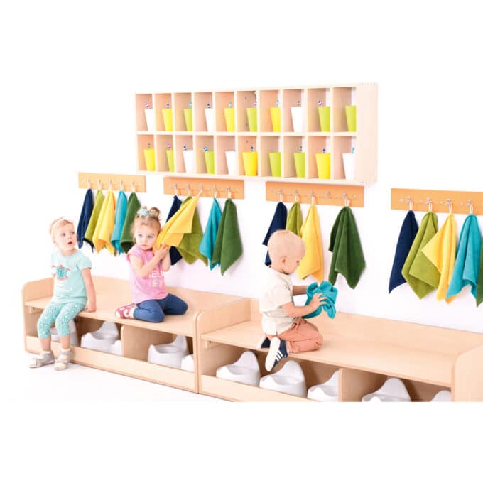 Kigata » Möbel & Raumgestaltung » Wickelraum & Waschräume » Waschraumleisten » Kindergarten-Garderobenleiste für Waschräume