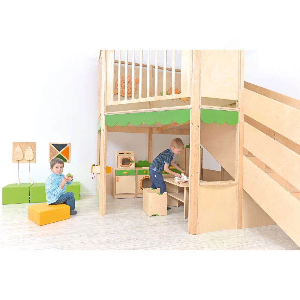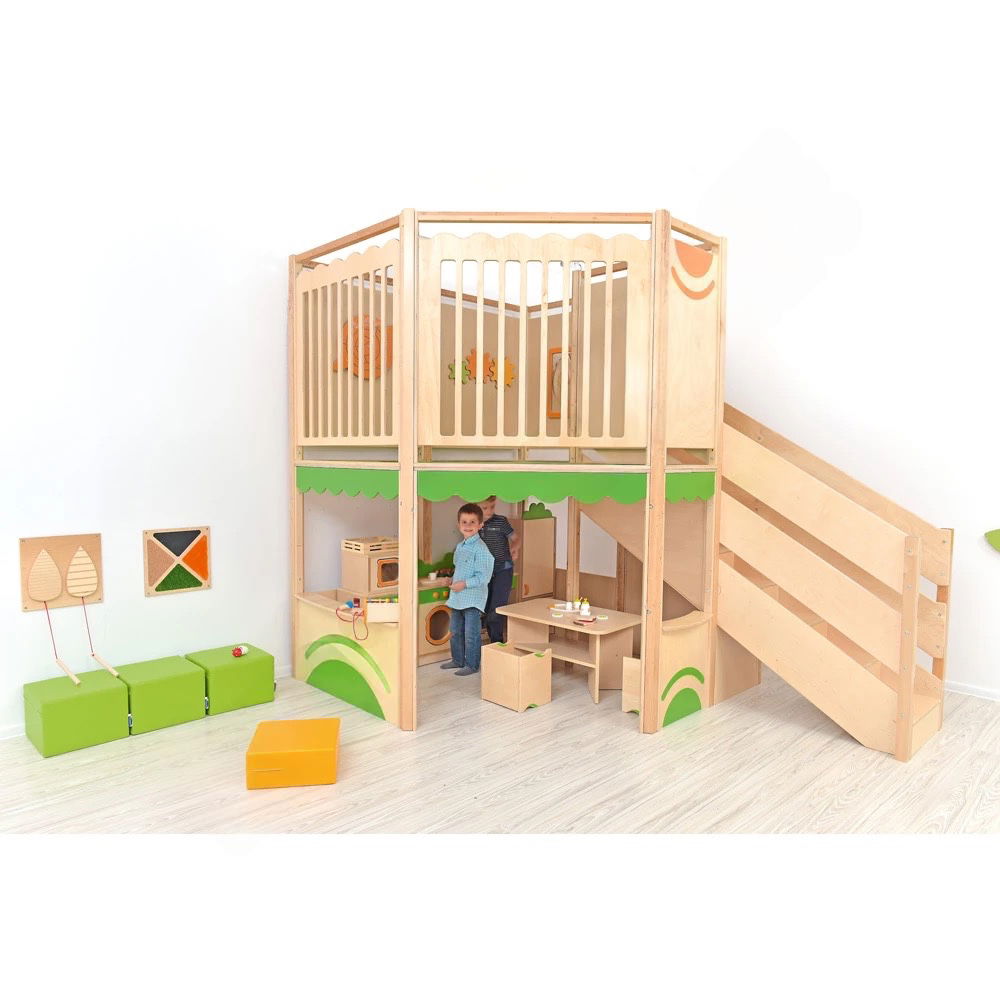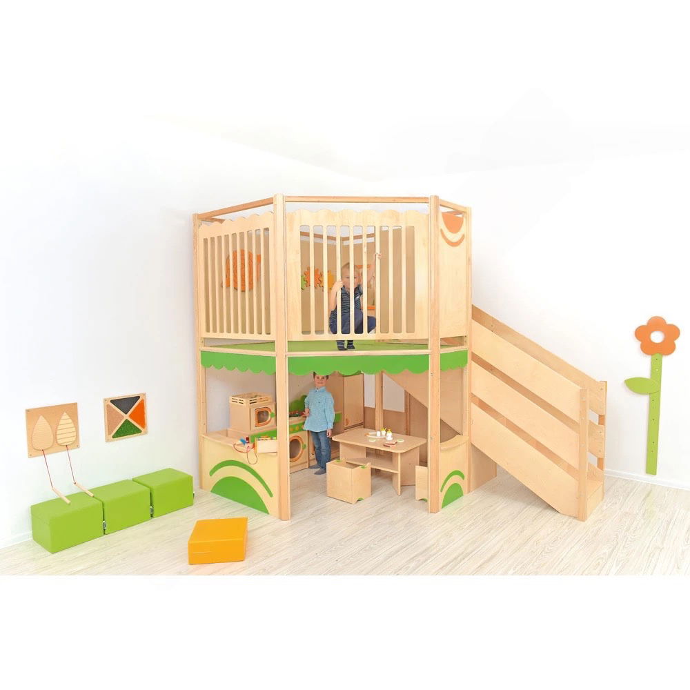 Die großzügige Fläche sowohl oben als auch unten lädt zum gemeinsamen Spielen in der Gruppe ein. Kinder lernen, miteinander zu interagieren, Rollen zu verteilen und gemeinsam fantasievolle Welten zu erschaffen.