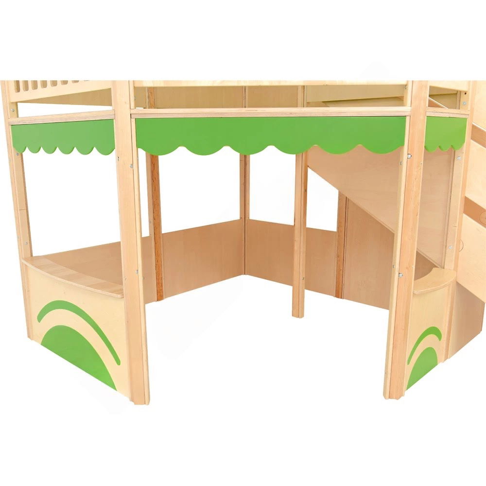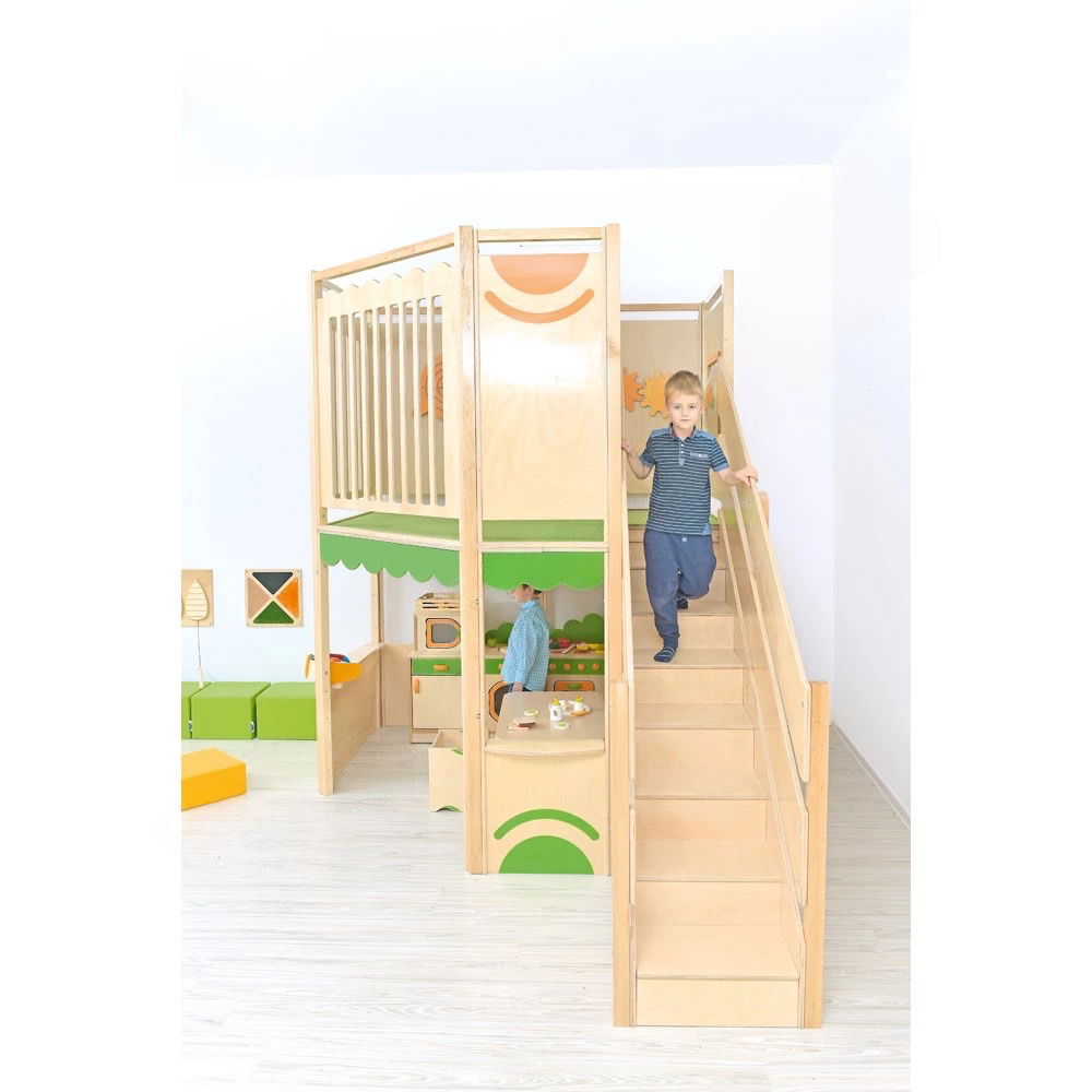 Die Hochebene schafft eine zweite Spielebene, ohne wertvolle Bodenfläche zu verlieren. Oben befindet sich ein sicherer Bereich zum Bewegen und Spielen, während der Raum darunter (Podesthöhe 130 cm) ideal für thematische Spielbereiche wie Puppenecken, Bauzonen oder als gemütlicher Rückzugsort genutzt werden kann. - Gezielte Förderung von Motorik und Wahrnehmung