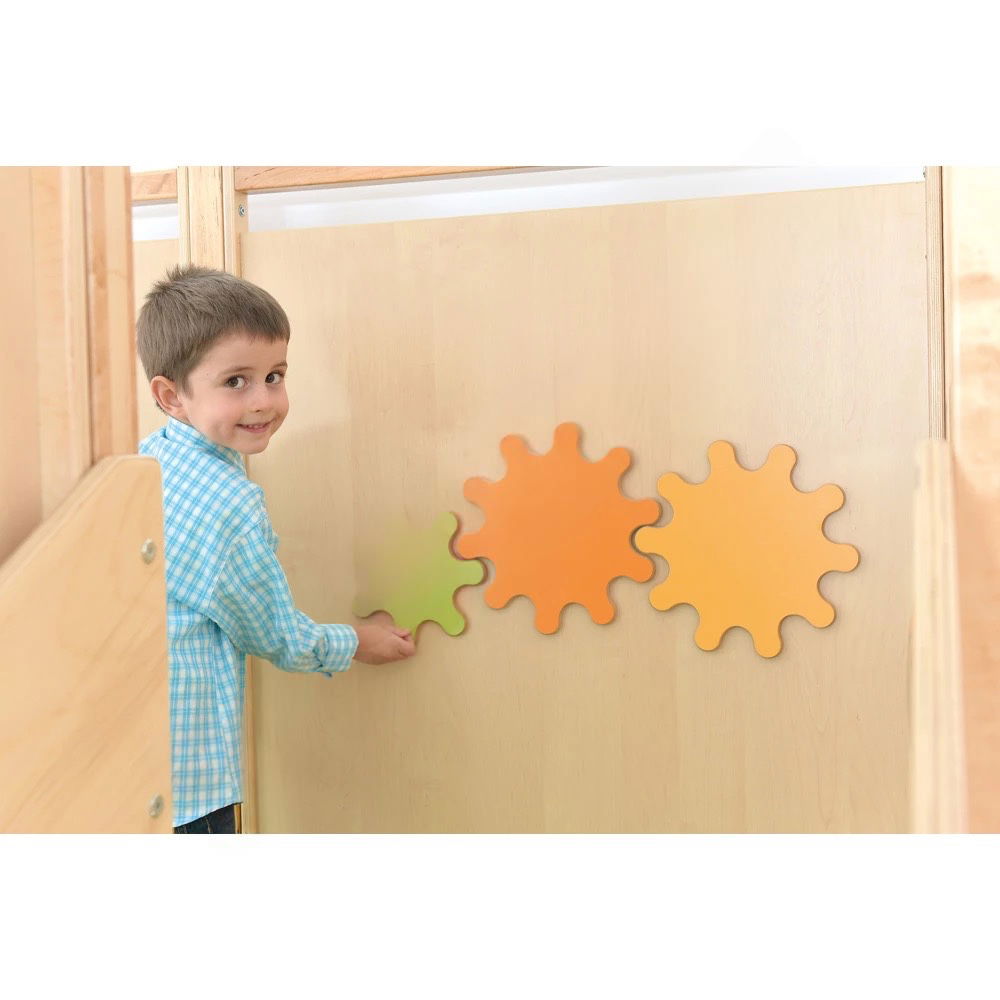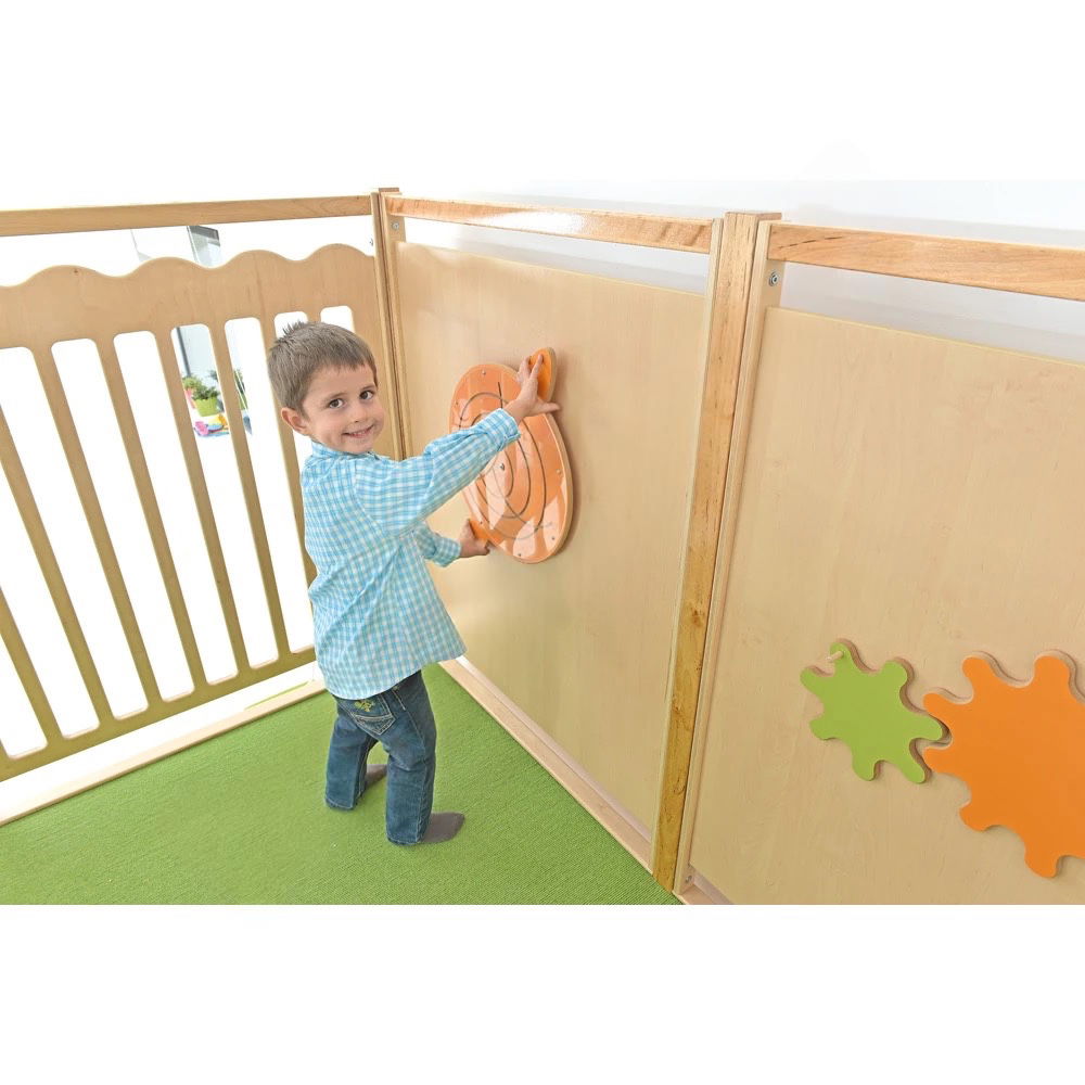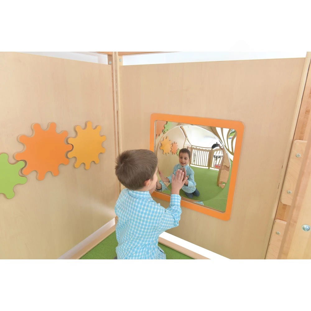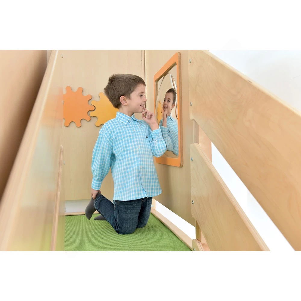 Die Wände der oberen Etage sind mit attraktiven Motorikspielen ausgestattet. Drehbare Zahnräder, ein sicherer Acryl-Spiegel zur Selbstwahrnehmung und ein Schiebespiel fördern gezielt die Auge-Hand-Koordination und die Feinmotorik der Kinder, während sie auf der Ebene spielen. - Sicherheit nach höchsten Standards