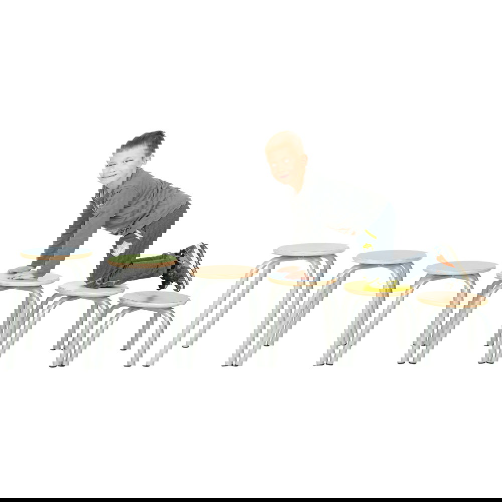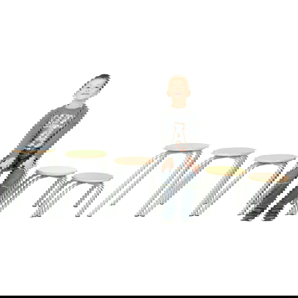 Eine der herausragendsten Eigenschaften des Flexi Hockers ist seine durchdachte Stapelbarkeit. Wenn der Platz für andere Aktivitäten benötigt wird, lassen sich bis zu fünf Hocker platzsparend übereinanderstapeln. Das macht ihn zur idealen Wahl für multifunktionale Räume, in denen schnell Ordnung geschaffen werden muss. Ob als spontane Sitzgelegenheit im Stuhlkreis, als Teil einer Lerngruppe oder als praktischer Hocker im Fachraum – der Flexi macht seinem Namen alle Ehre.