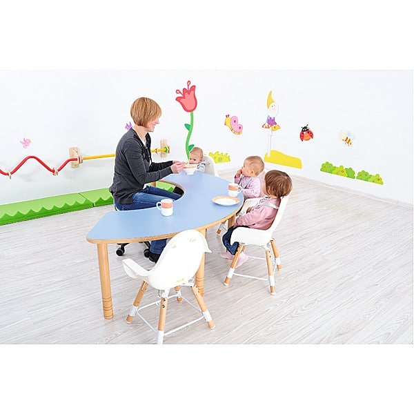 Auf einer Seite sitzen die Kinder und der Erzieher sitzt mitten im Geschehen, um jedem Kind z.B. beim Essen oder bei Aufgaben behilflich zu sein. Aus HPL-laminiertem Sperrholz (Stärke: 25 mm); mit runden Holzbeinen mit Höhenverstellung (Durchmesser: 48 mm).